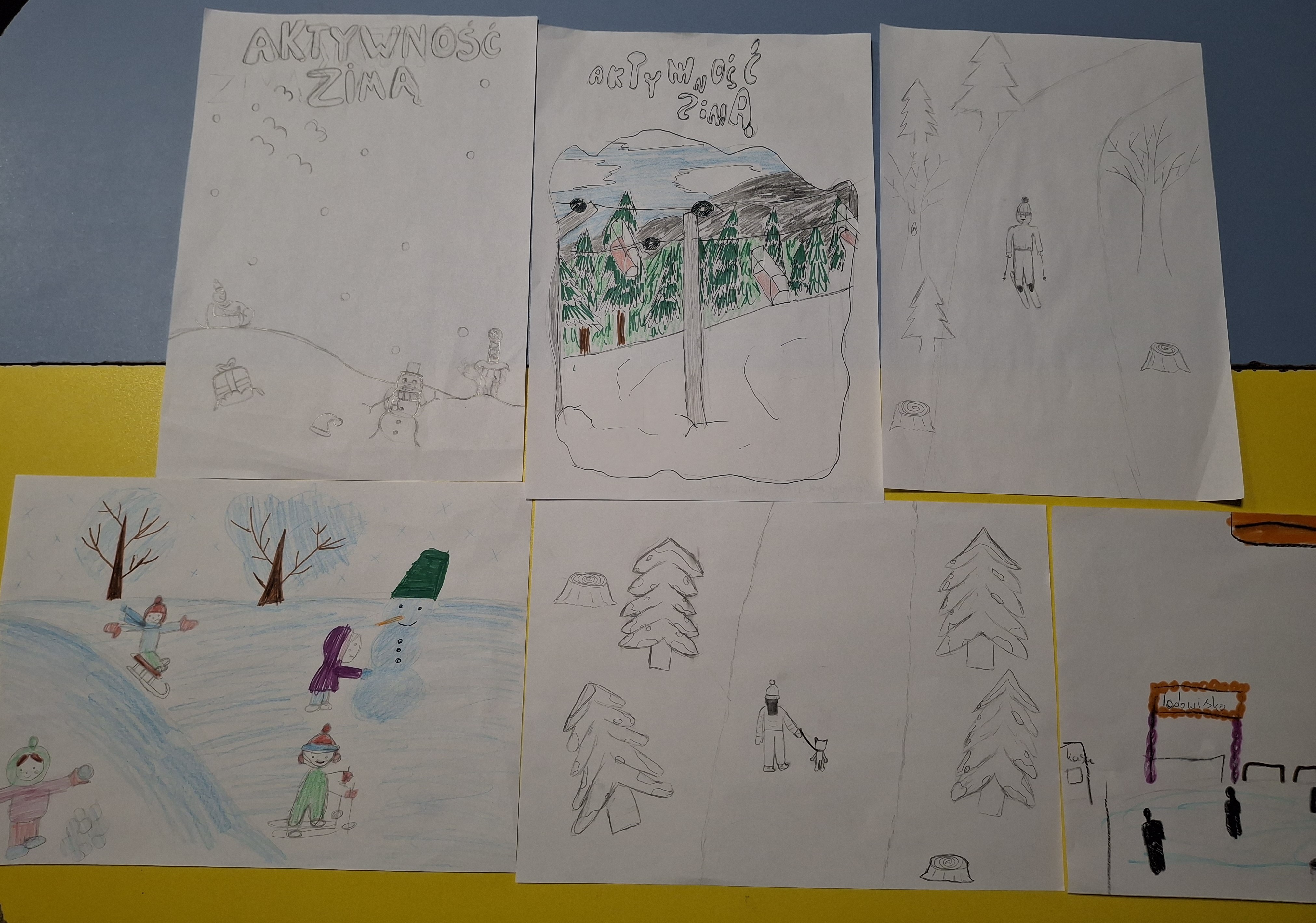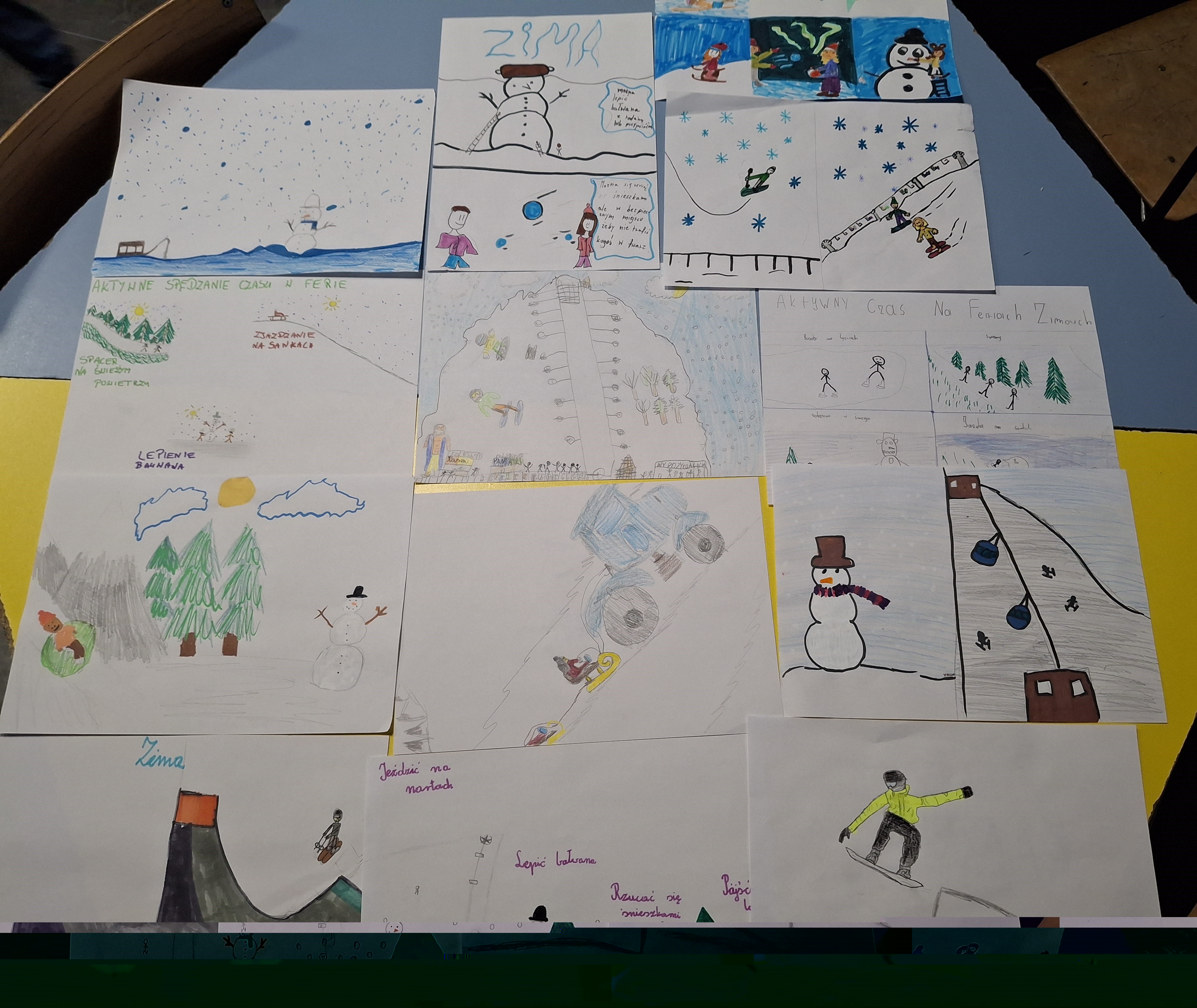Uczniowie wykonali plakaty nt. aktywności w czasie ferii zimowych. Prace plastyczne uczniów wyeksponowane zostały na tablicy ściennej na korytarzu szkolnym.