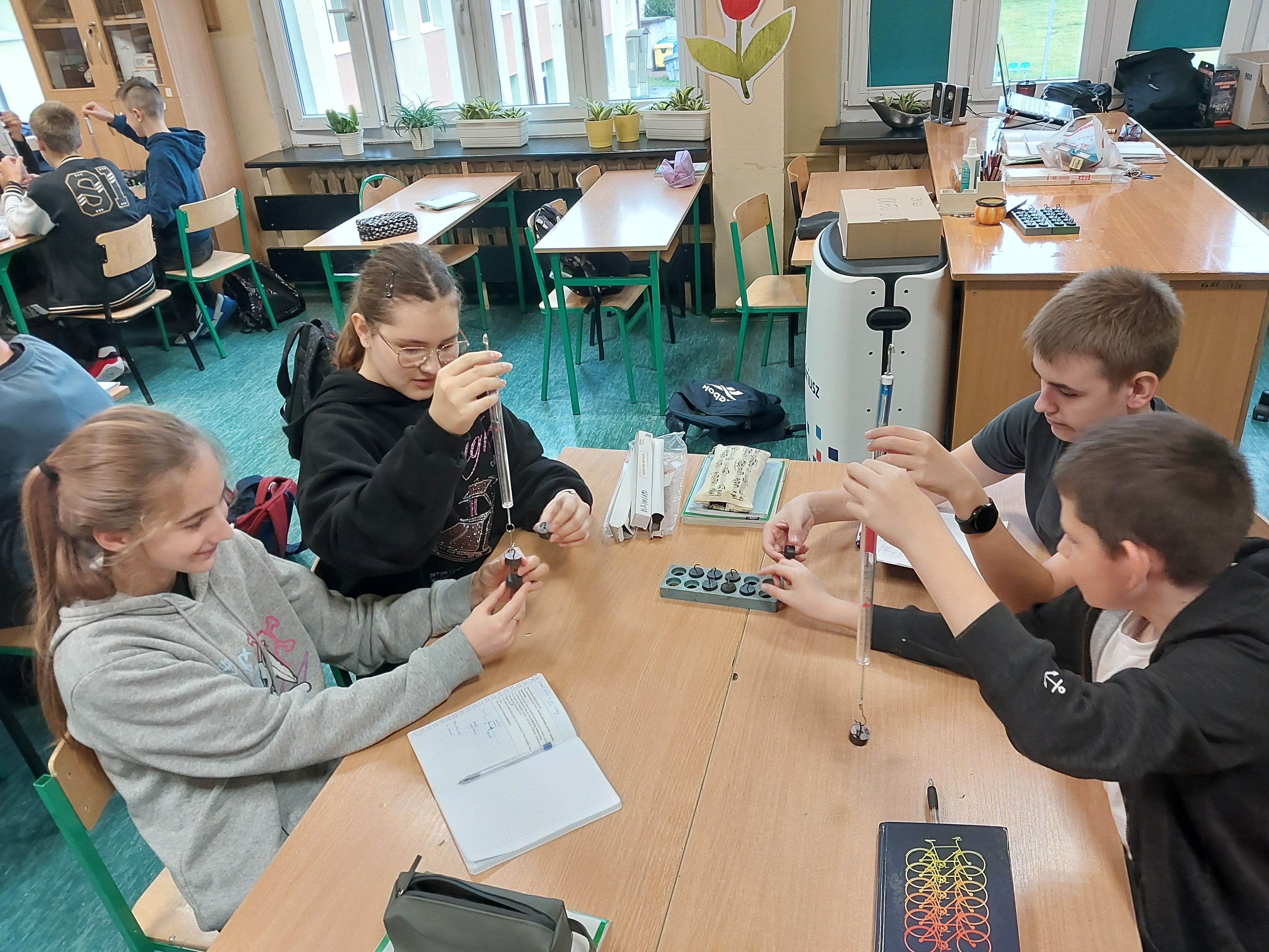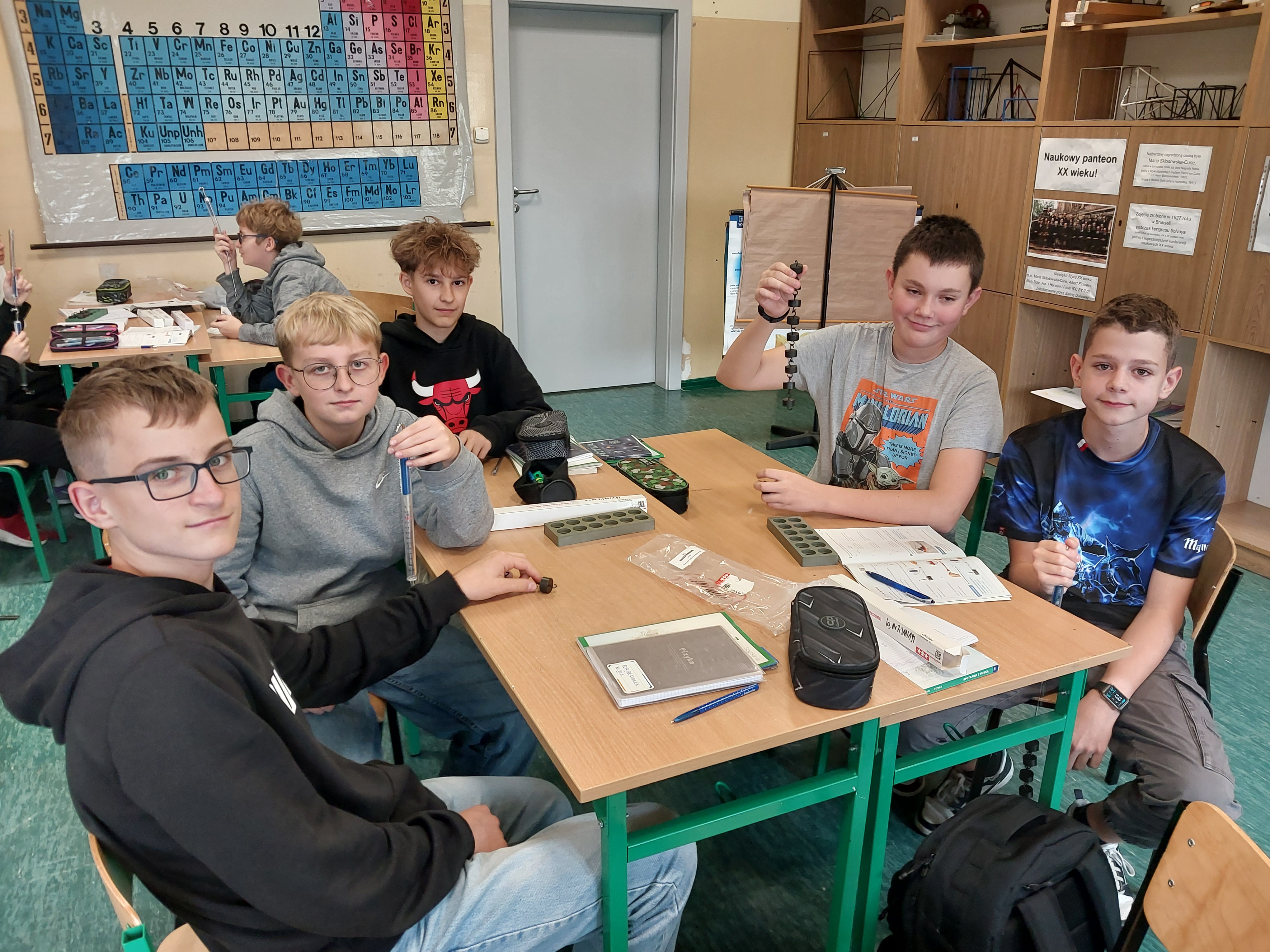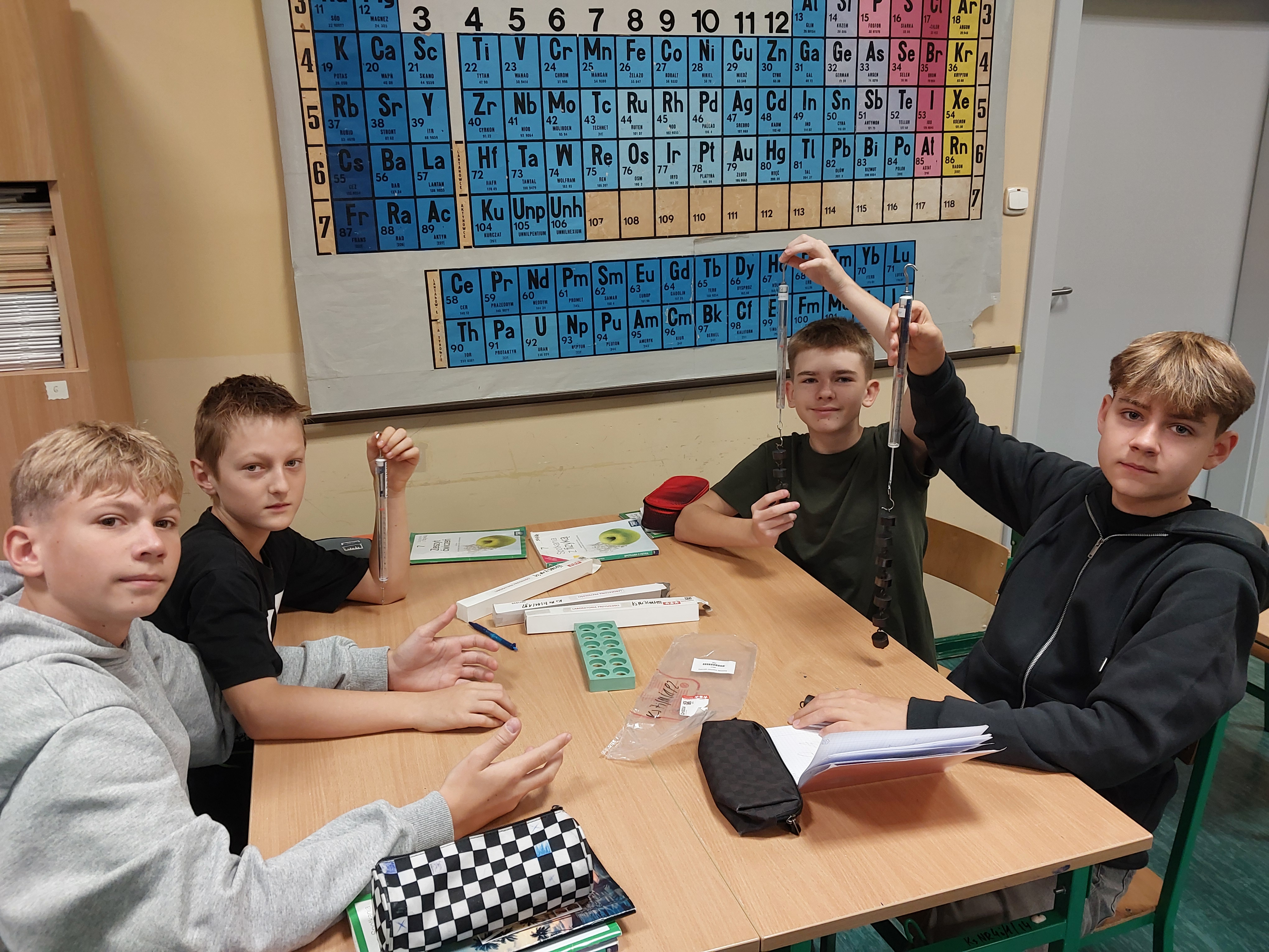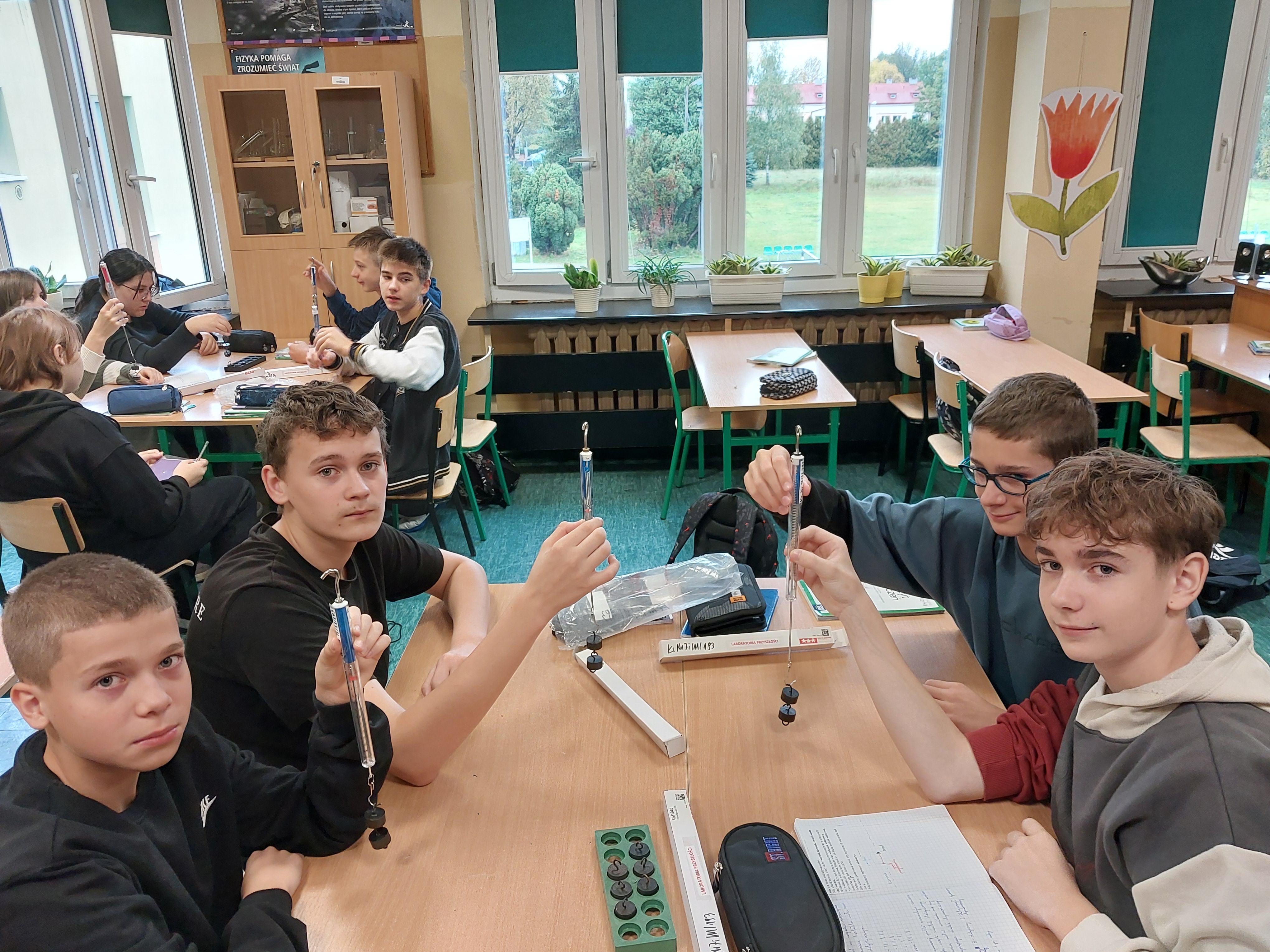 W dn. 10.10.2025 (7a,7b) i 16.10.2025 (7c) uczniowie zapoznawali się z przyrządem do pomiaru siły, czyli siłomierzem. Skorzystali podczas pomiarów z siłomierzy zakupionych w ramach programu Laboratoria Przyszłości. Na kolejnych zajęciach wykonywali samodzielnie własne siłomierze.