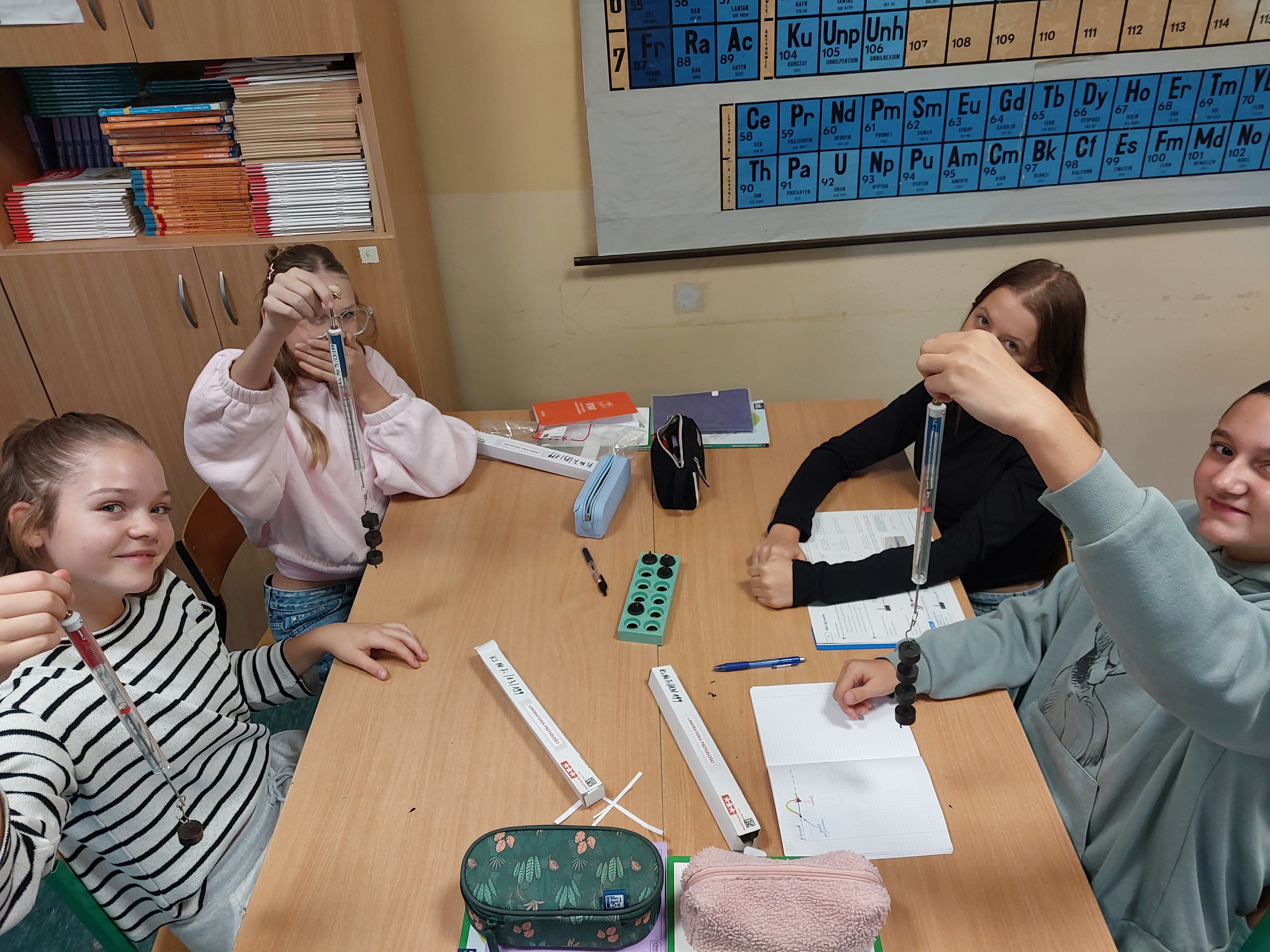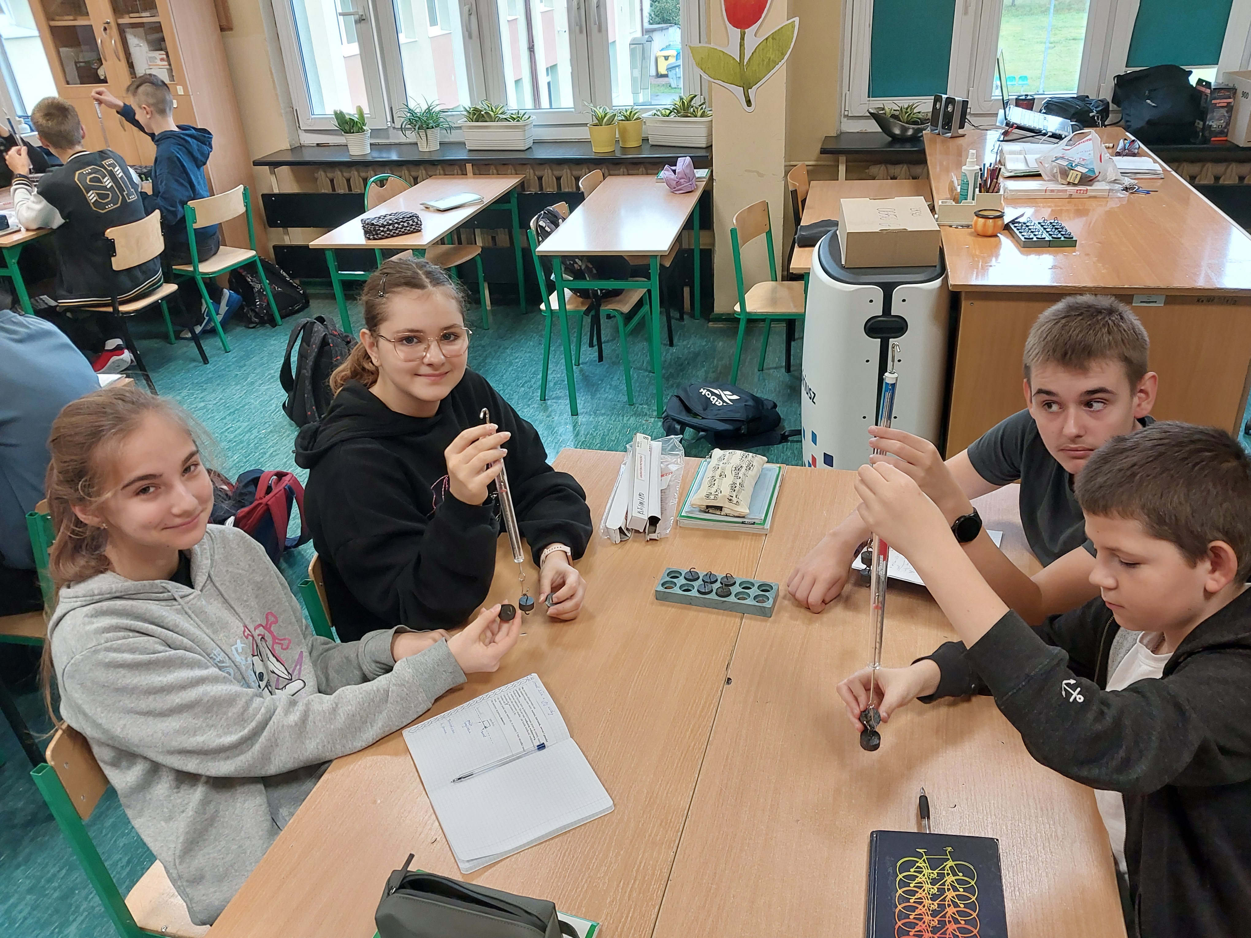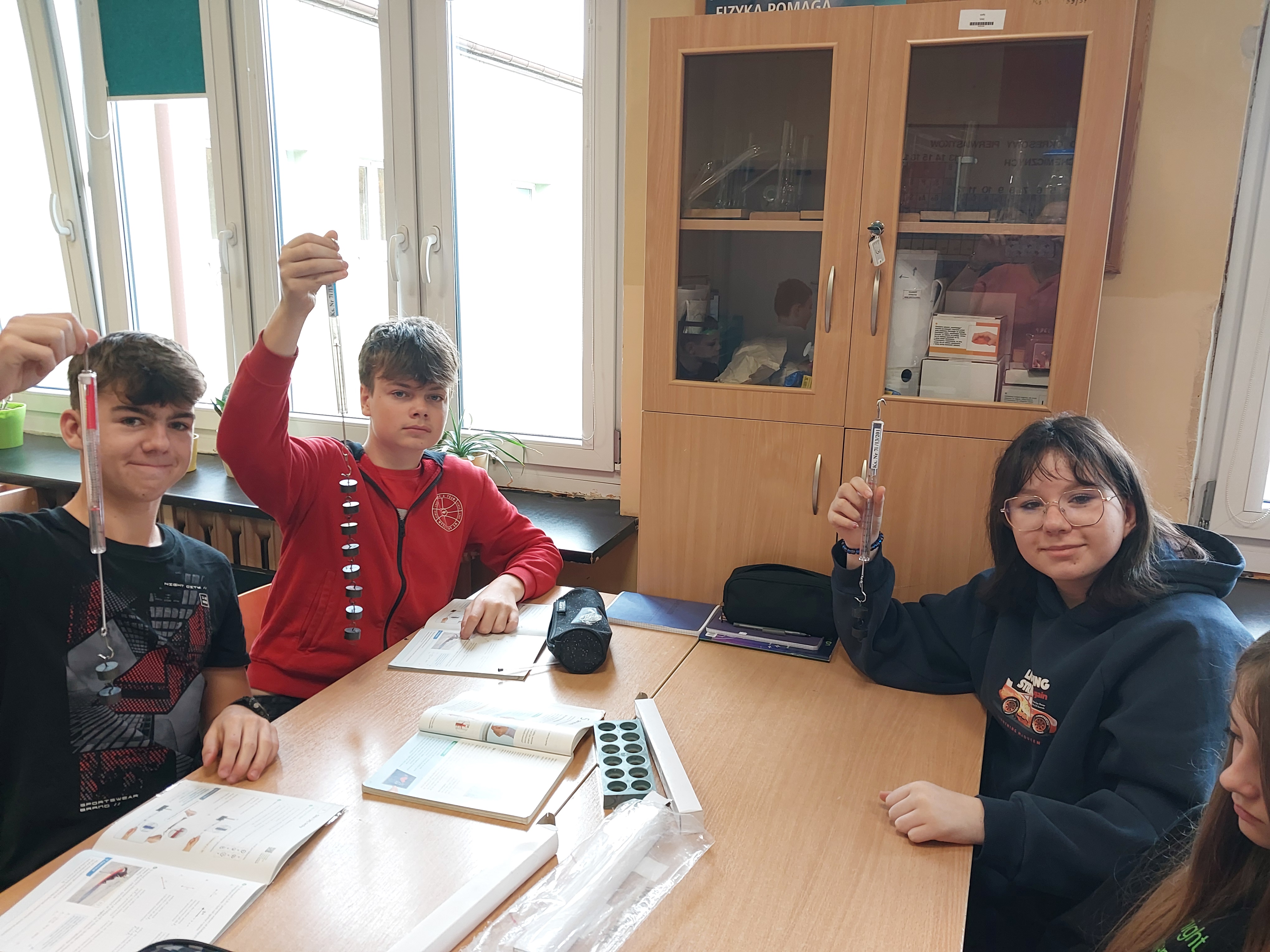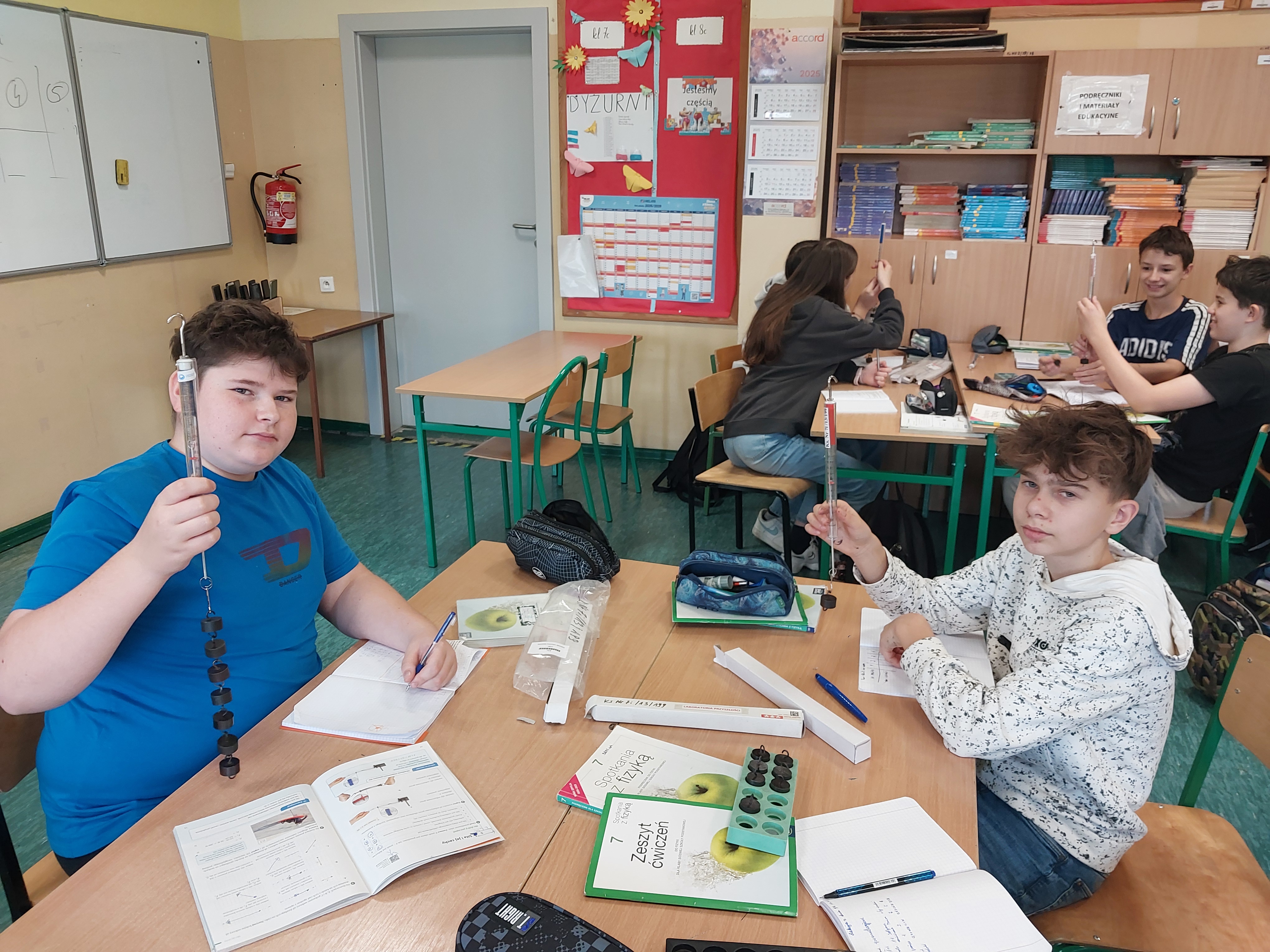 W dn. 10.10.2025 (7a,7b) i 16.10.2025 (7c) uczniowie zapoznawali się z przyrządem do pomiaru siły, czyli siłomierzem. Skorzystali podczas pomiarów z siłomierzy zakupionych w ramach programu Laboratoria Przyszłości. Na kolejnych zajęciach wykonywali samodzielnie własne siłomierze.