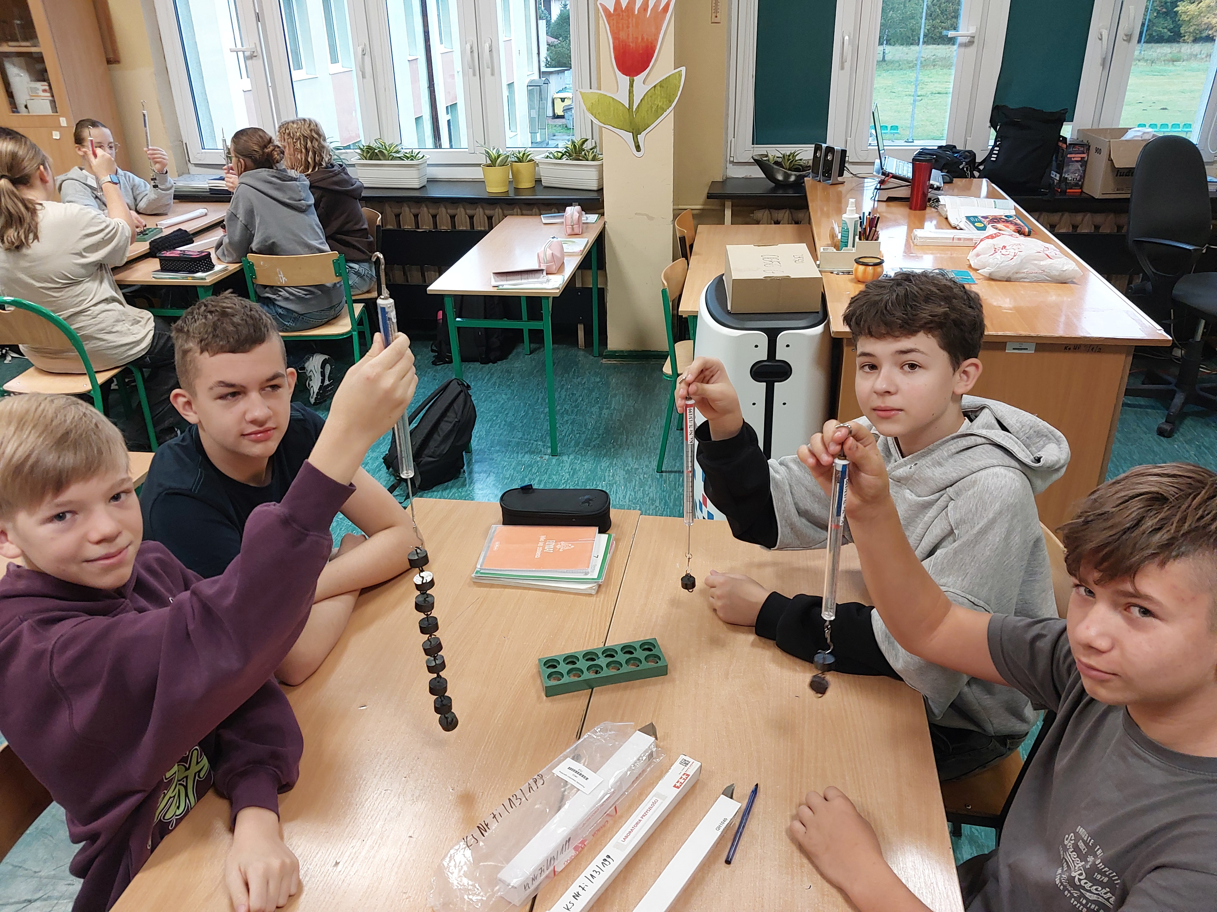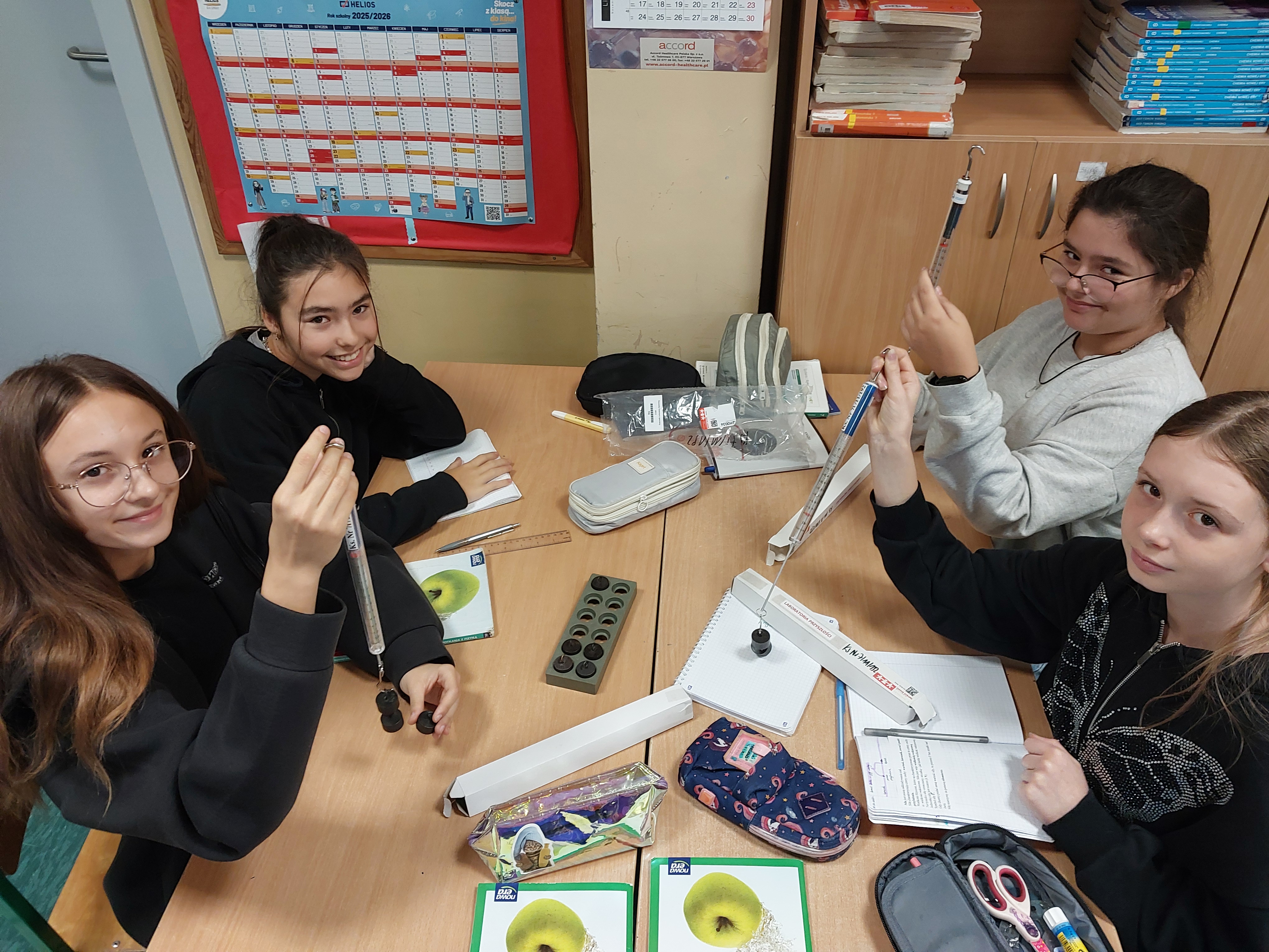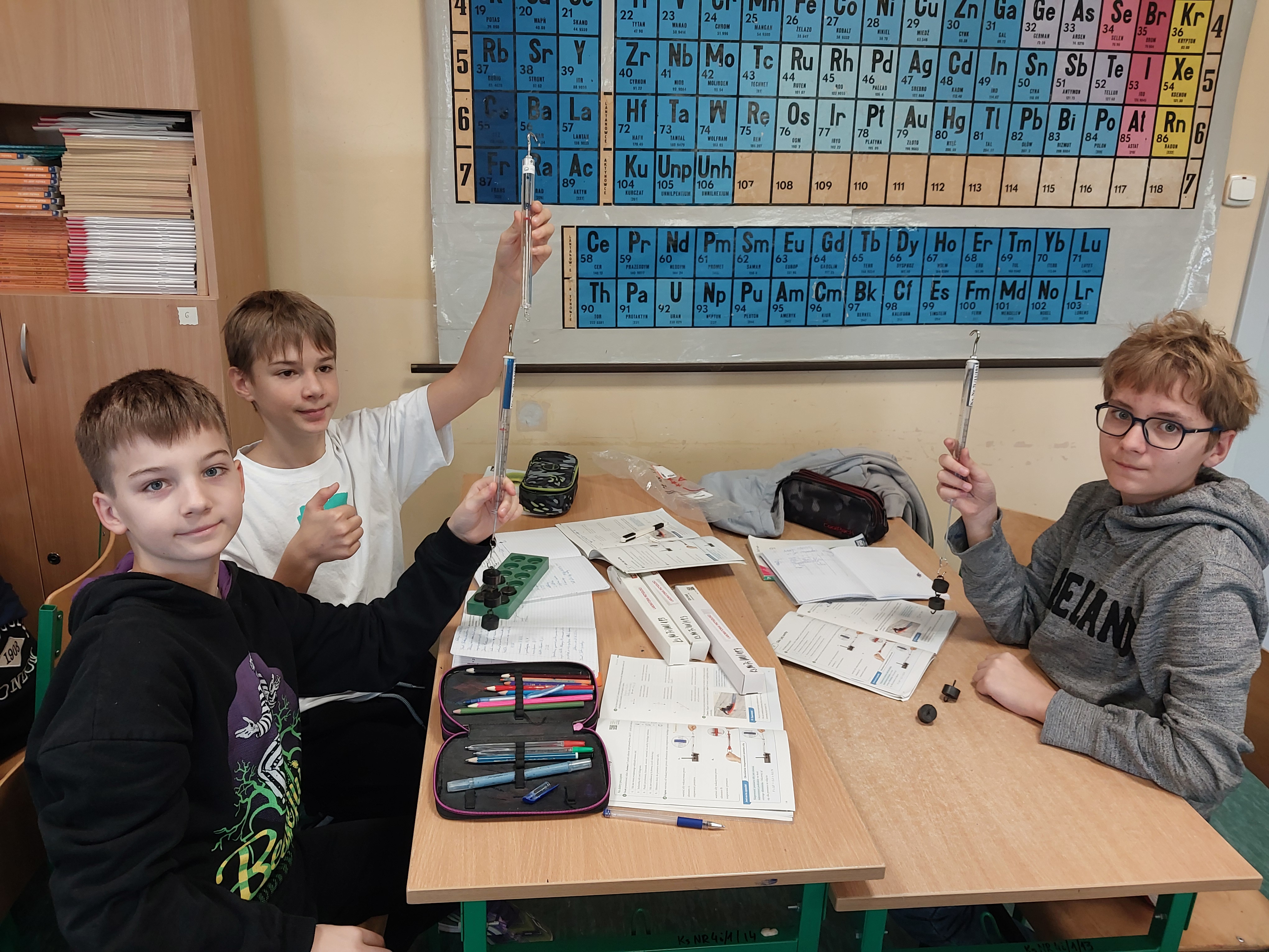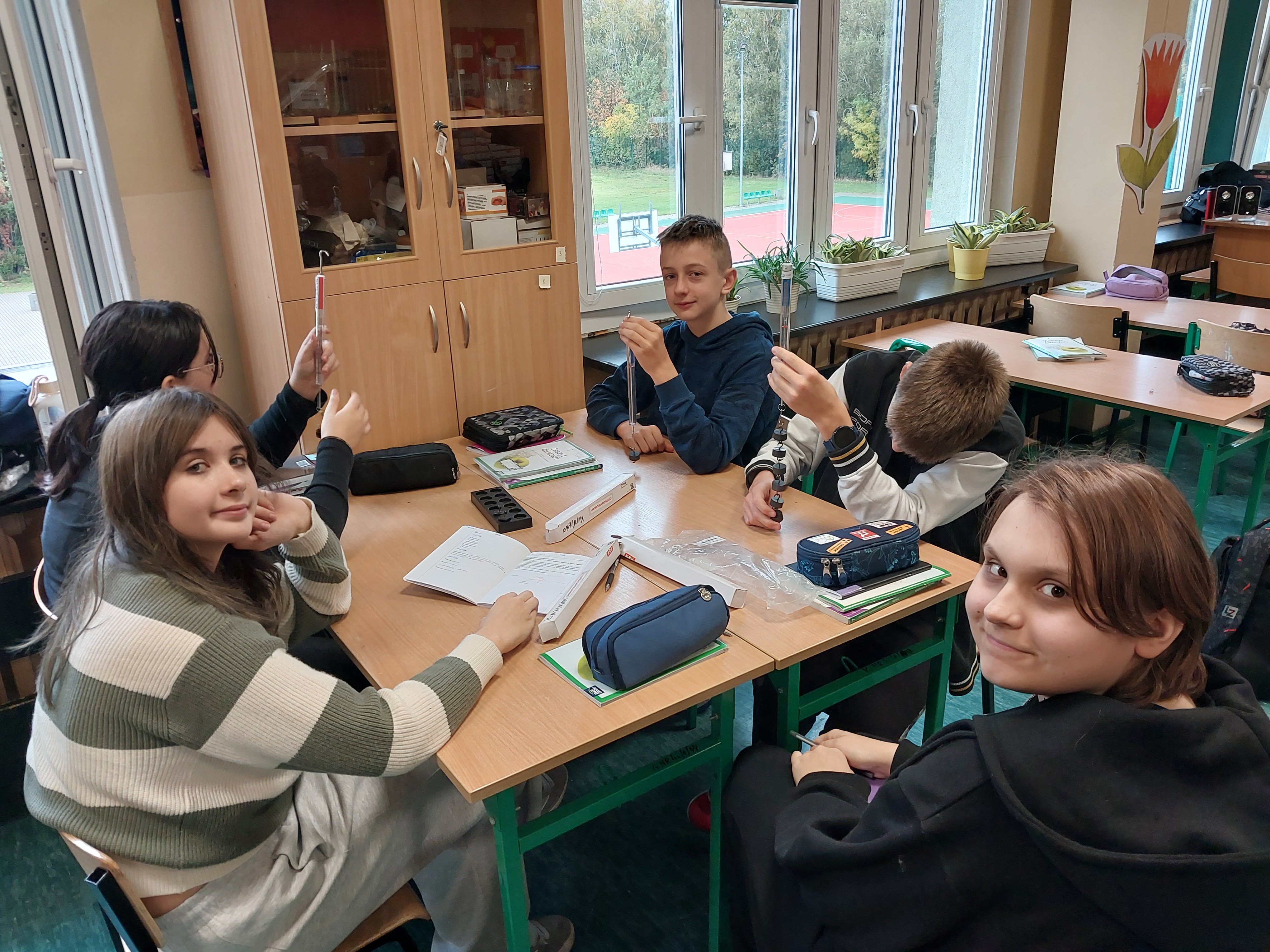 W dn. 10.10.2025 (7a,7b) i 16.10.2025 (7c) uczniowie zapoznawali się z przyrządem do pomiaru siły, czyli siłomierzem. Skorzystali podczas pomiarów z siłomierzy zakupionych w ramach programu Laboratoria Przyszłości. Na kolejnych zajęciach wykonywali samodzielnie własne siłomierze.