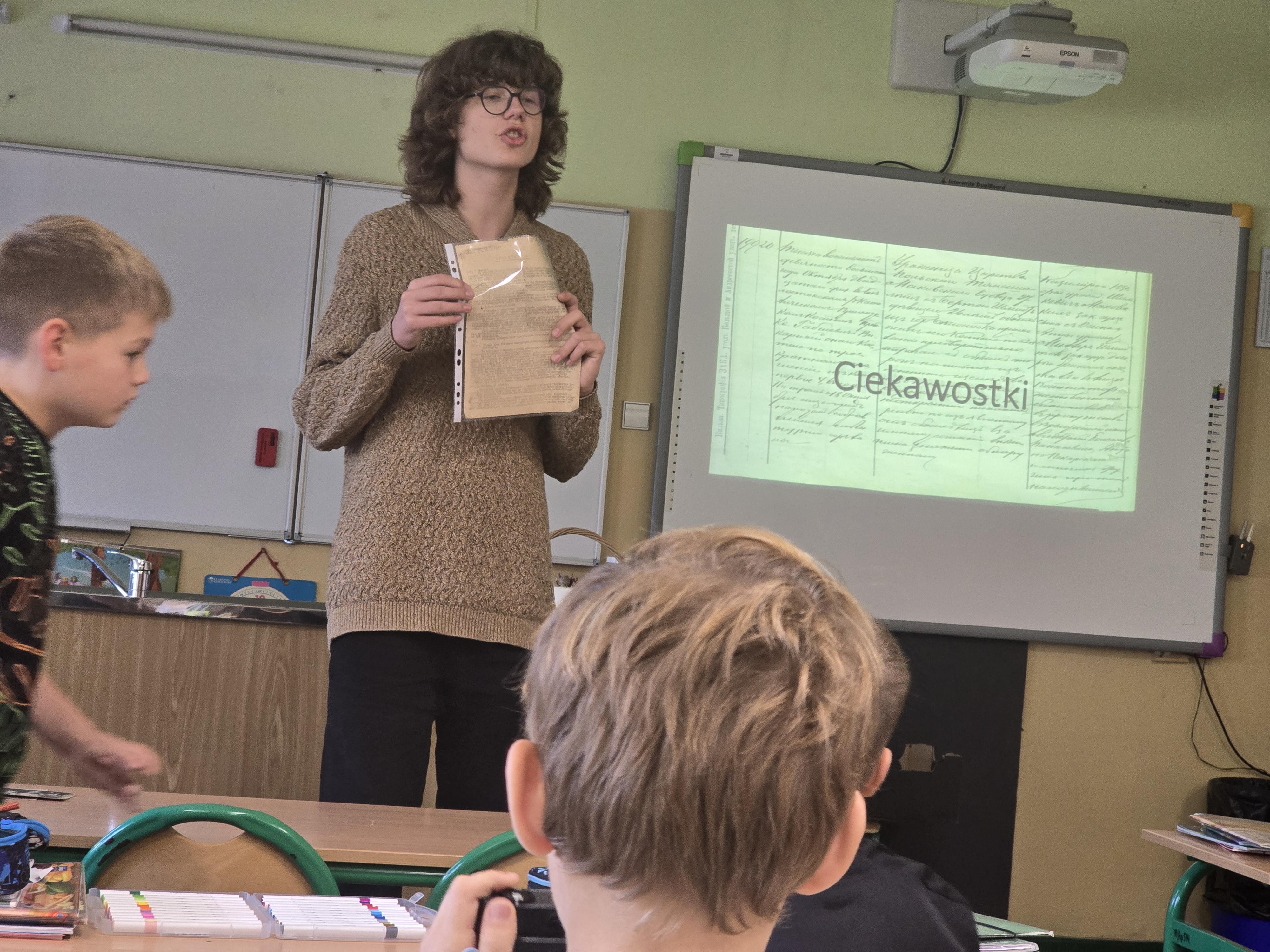 Adam Bartosiewicz ze starszym bratem Jankiem, zaprezentowali co to jest genealogia oraz jak i gdzie szukać informacji o naszych przodkach.
