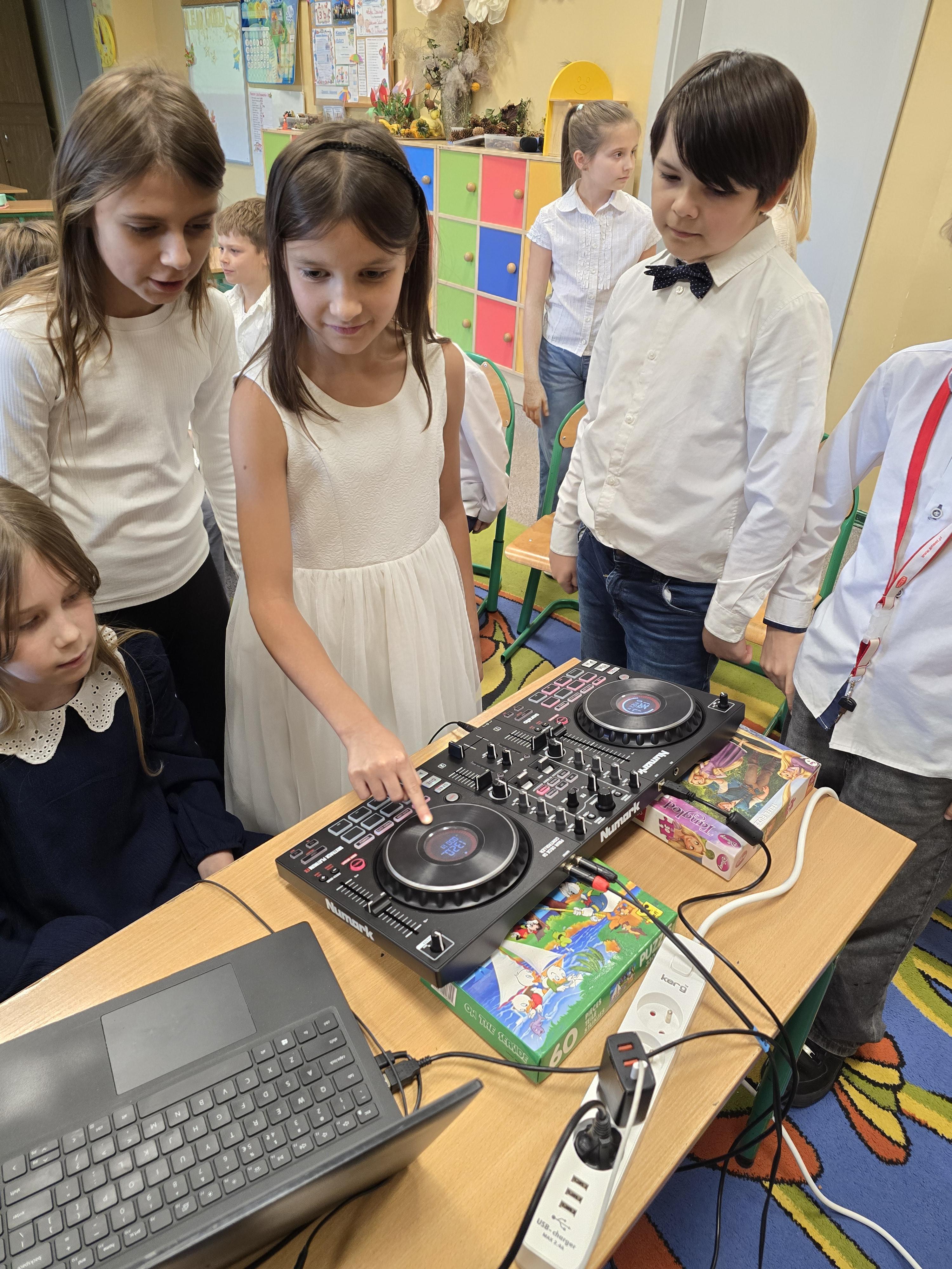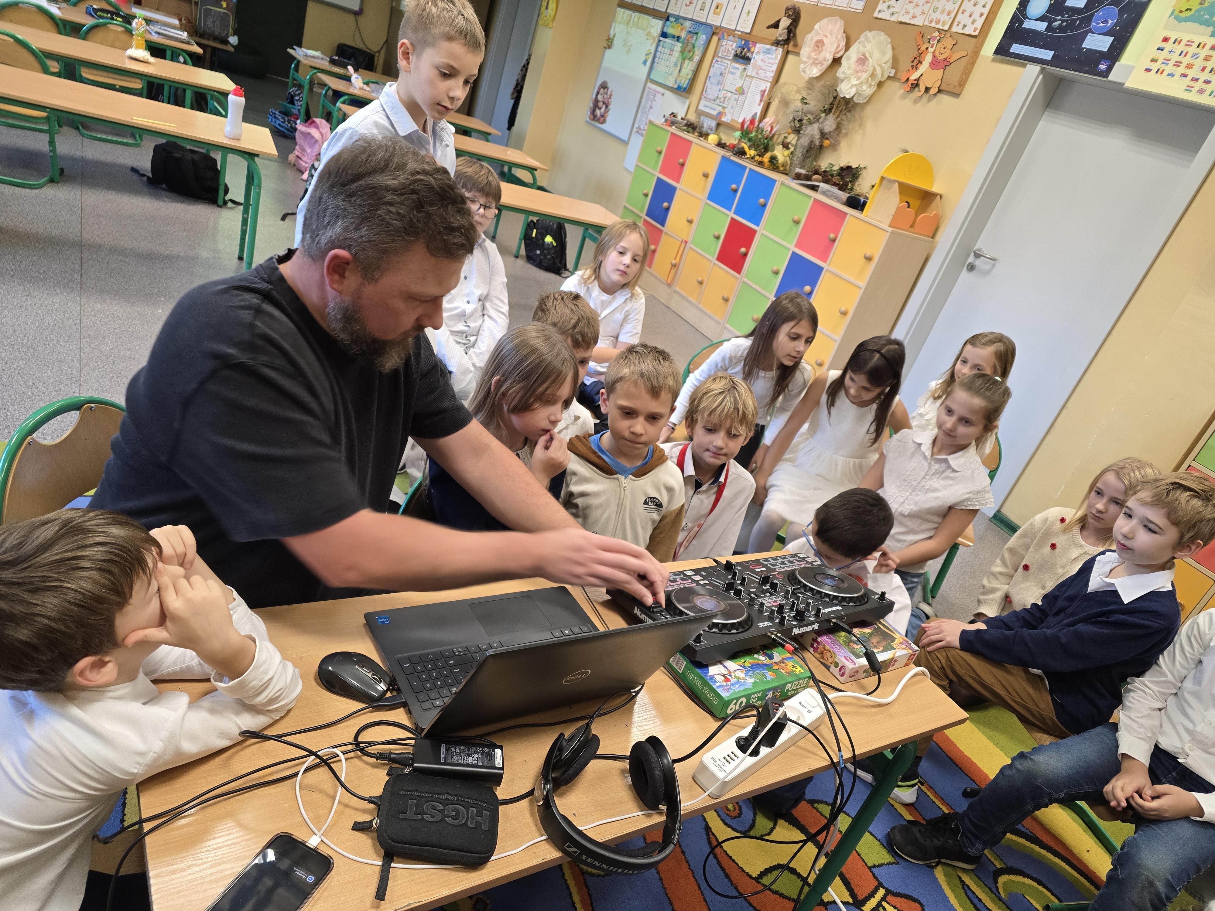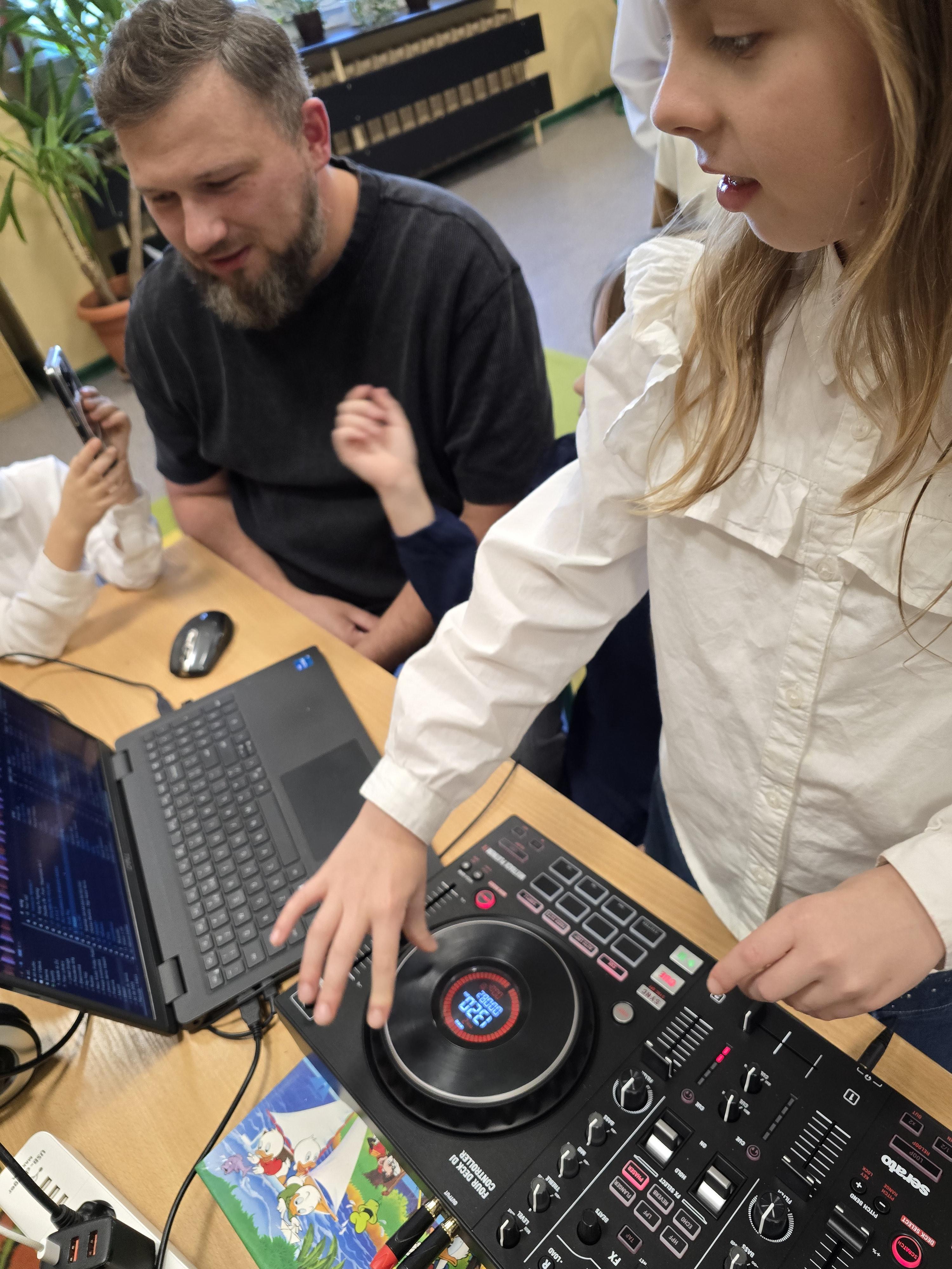 Pan Piotr Matusiak – tata Alicji – umożliwił poznanie pracy didżeja i razem z córką poprowadzili pokaz i mini warsztaty z miksowania muzyki.