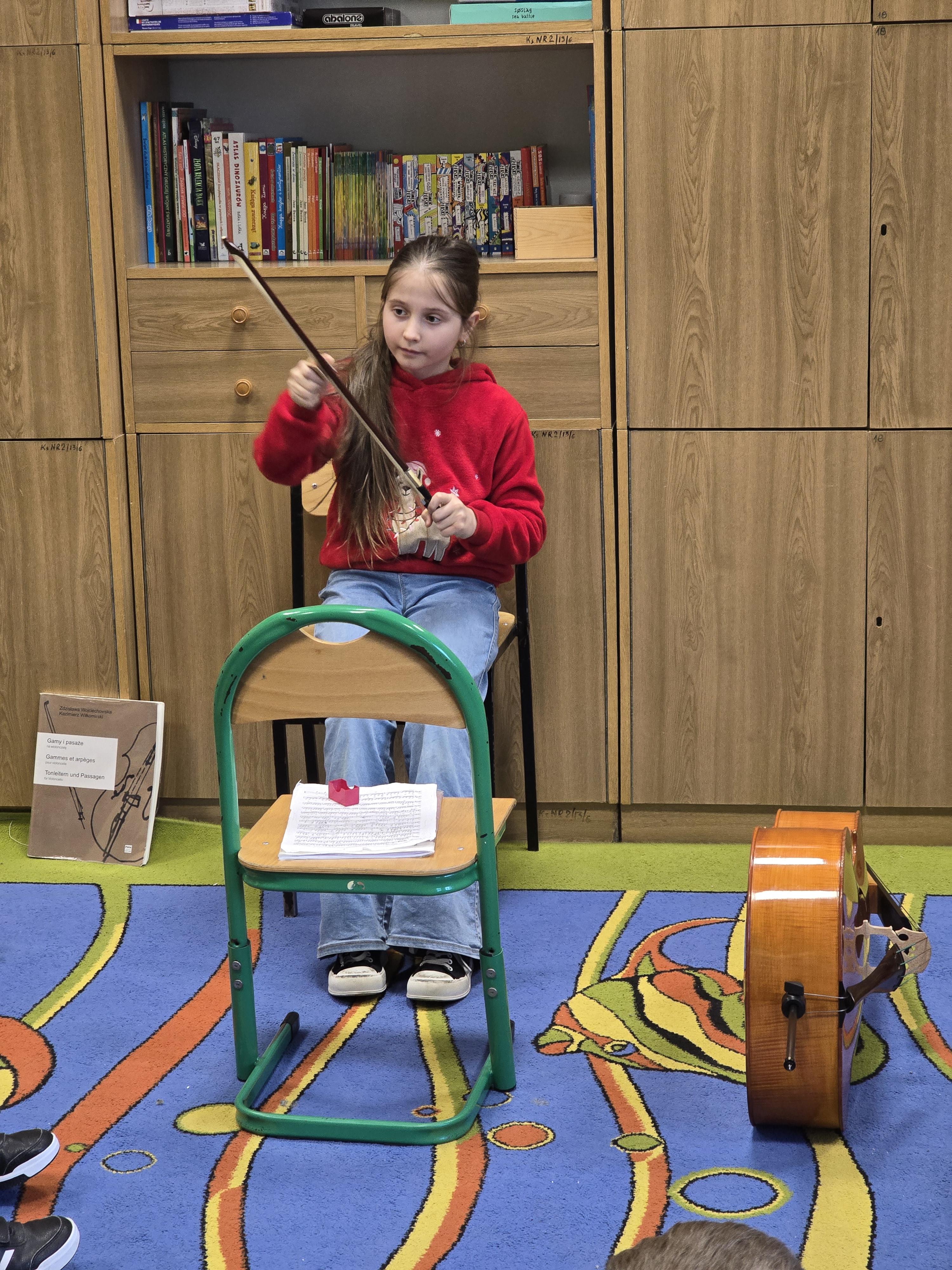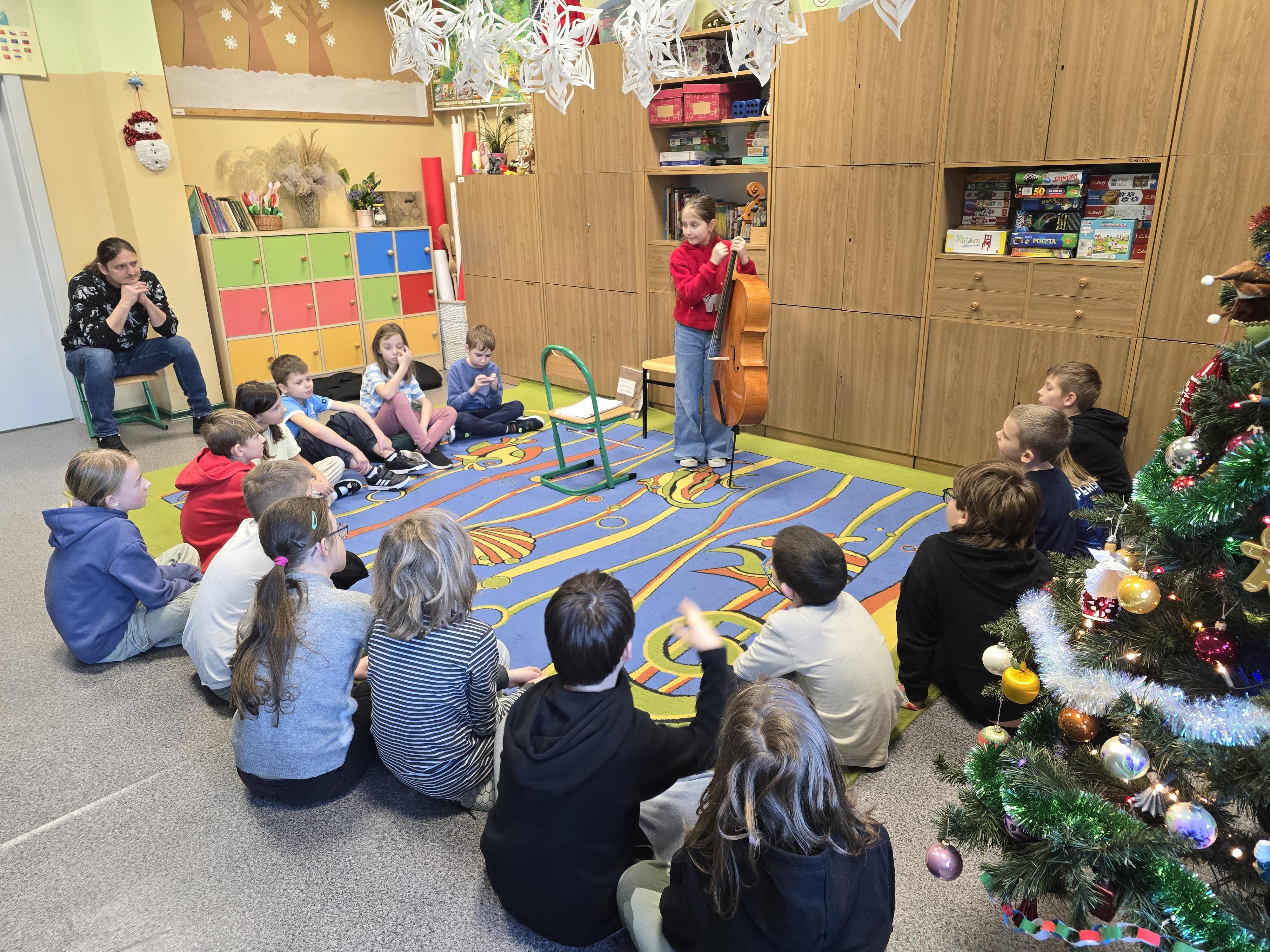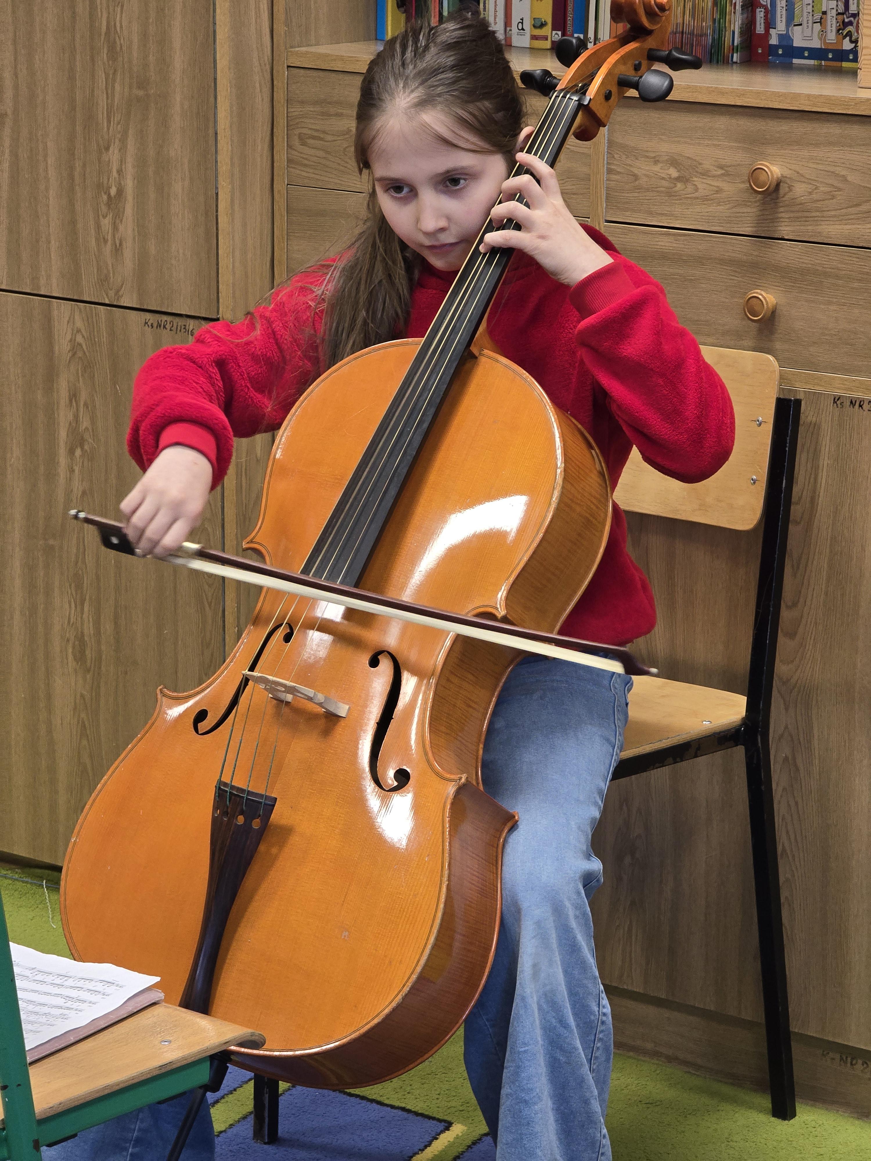 Na przepiękny koncert muzyczny wykonany na wiolonczeli zaprosiła nas Zosia Szewczyk. Razem z tatą Łukaszem wyjaśniła budowę i działanie instrumentu, a każdy kolega i koleżanka mogli wygrać na strunach dowolny takt.