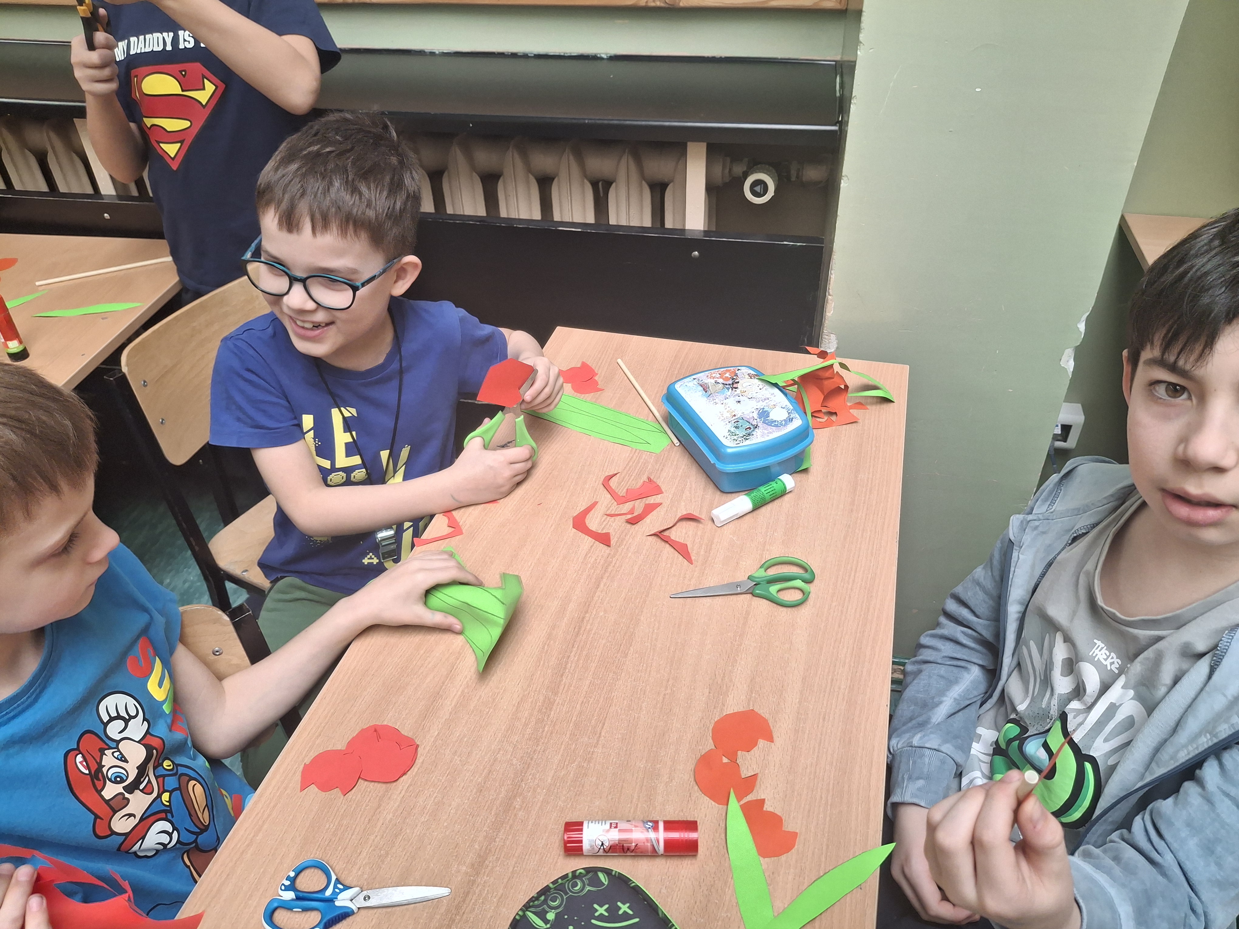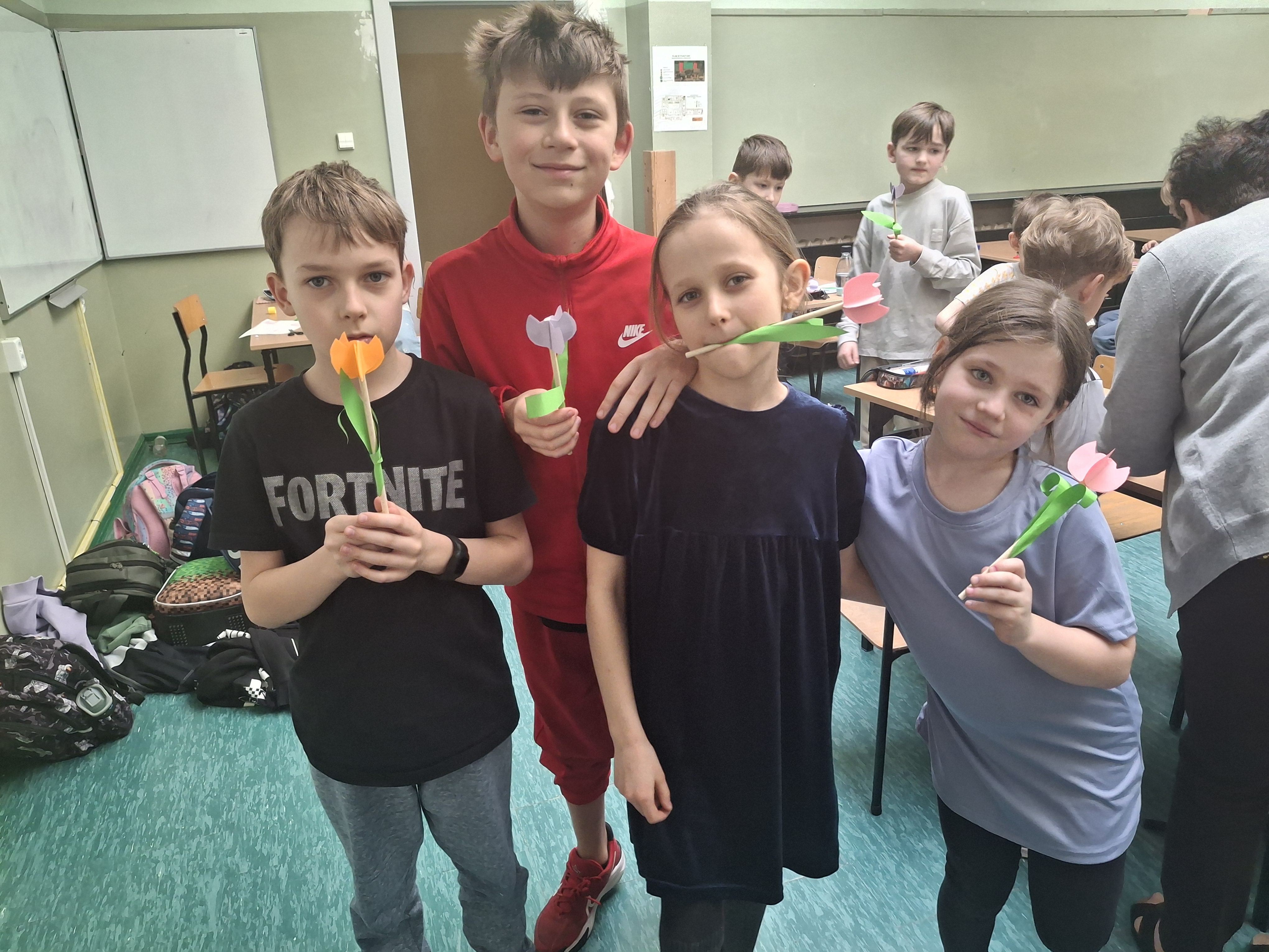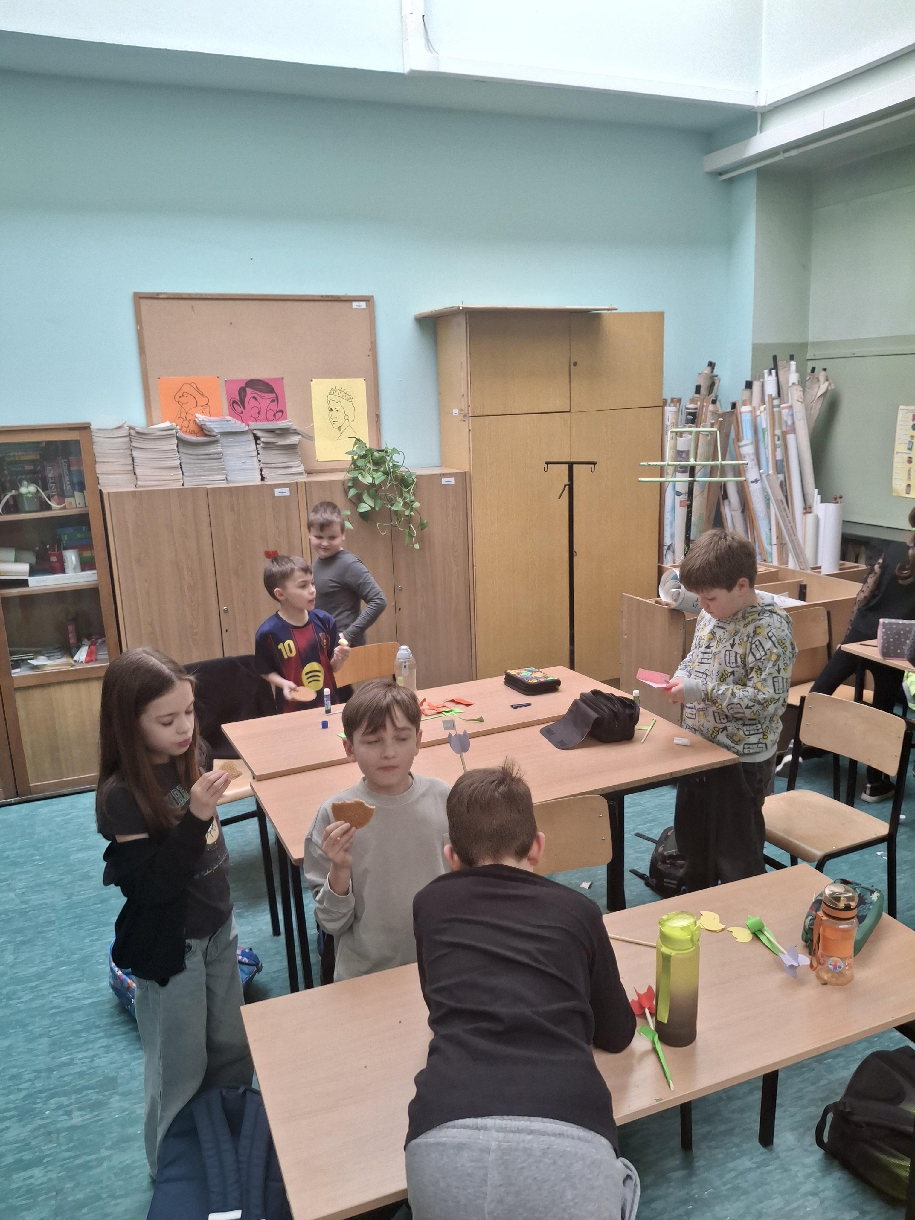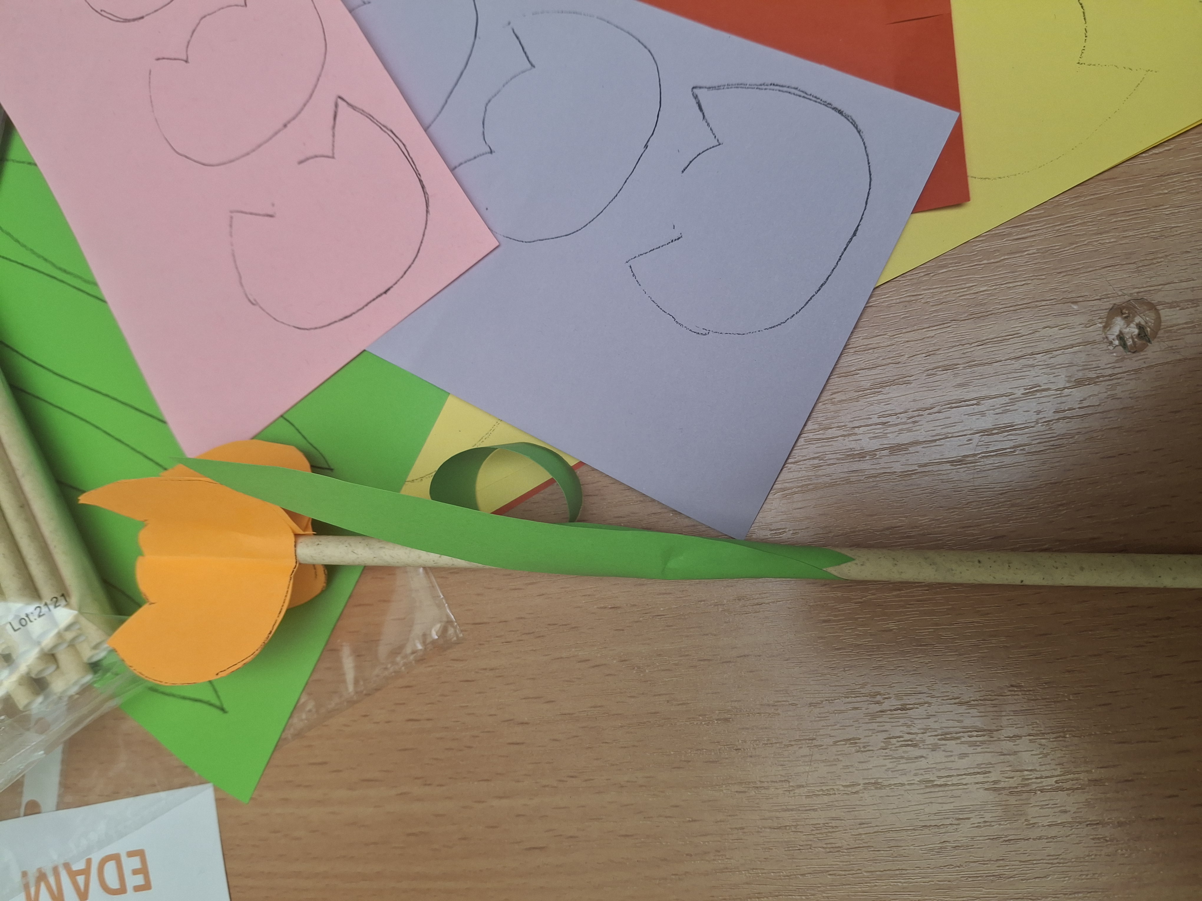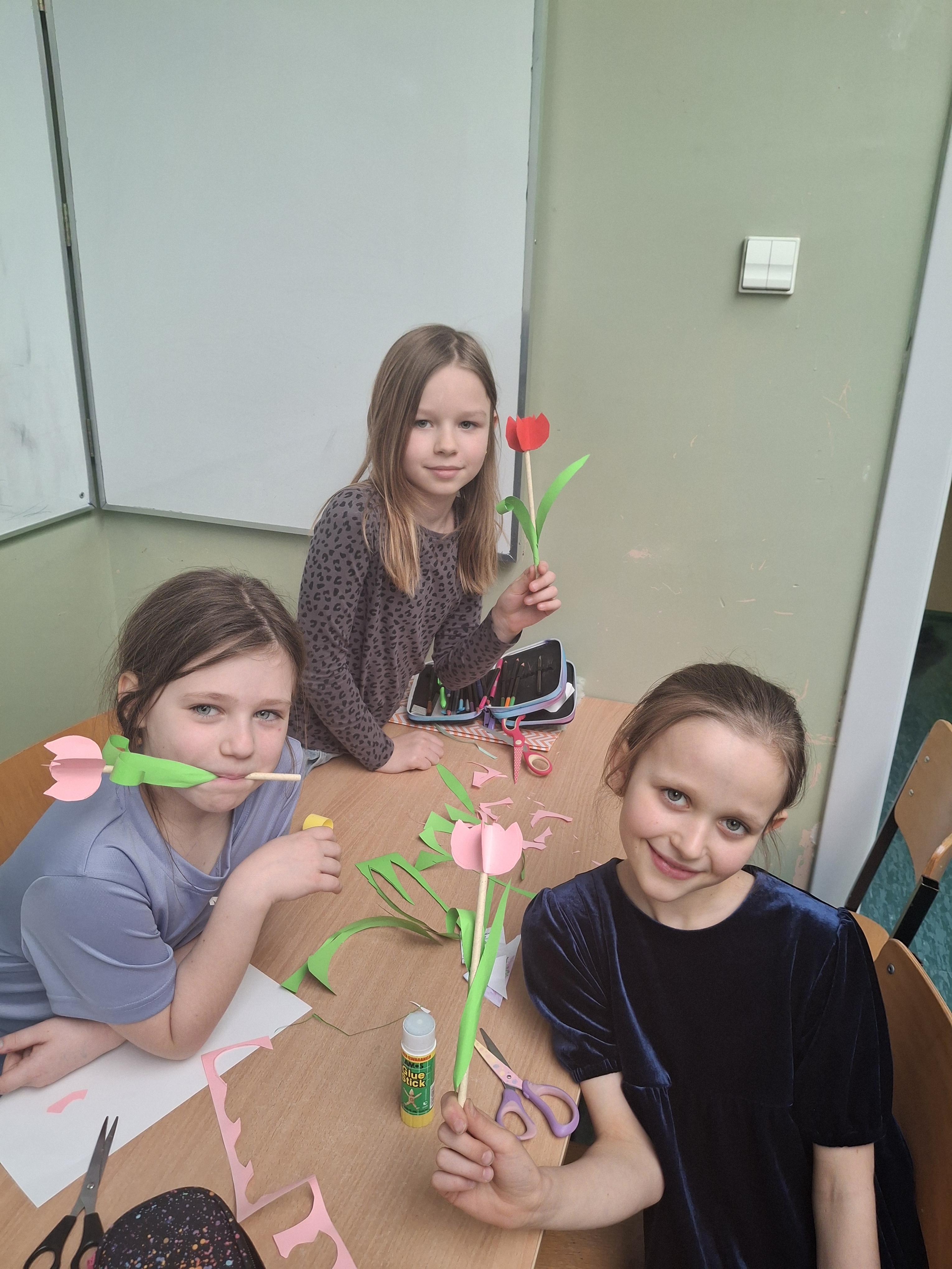 W części warsztatowej nasi uczniowie zamienili się w florystów. Wykorzystując kolorowy papier i słomki do napojów, stworzyliśmy przestrzenne tulipany.
