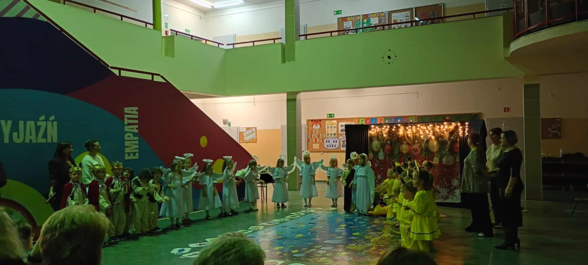 19 grudnia przedszkolaki ponownie wystąpiły – tym razem wspólnie z dziećmi z przedszkola z Widzewa – podczas szkolnych jasełek przed całą społecznością szkolną. Mali artyści zaprezentowali się znakomicie, a ich występ został nagrodzony gromkimi brawami. Wspólne śpiewanie kolęd i świąteczne przedstawienie wprowadziły wszystkich w wyjątkowy, bożonarodzeniowy nastrój.