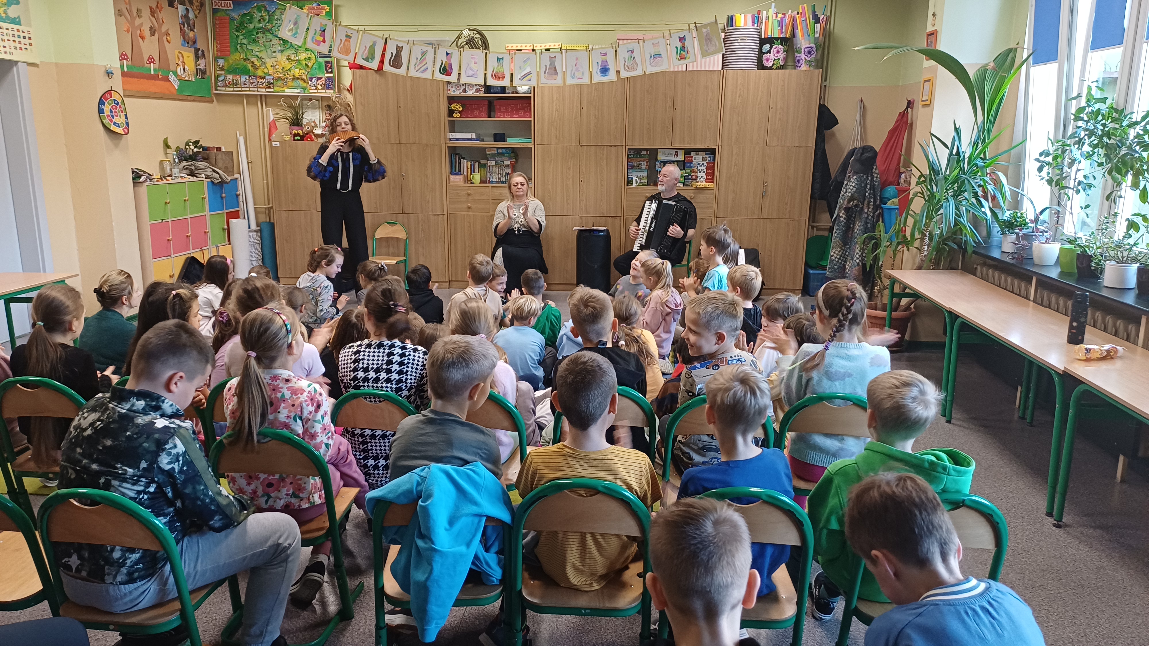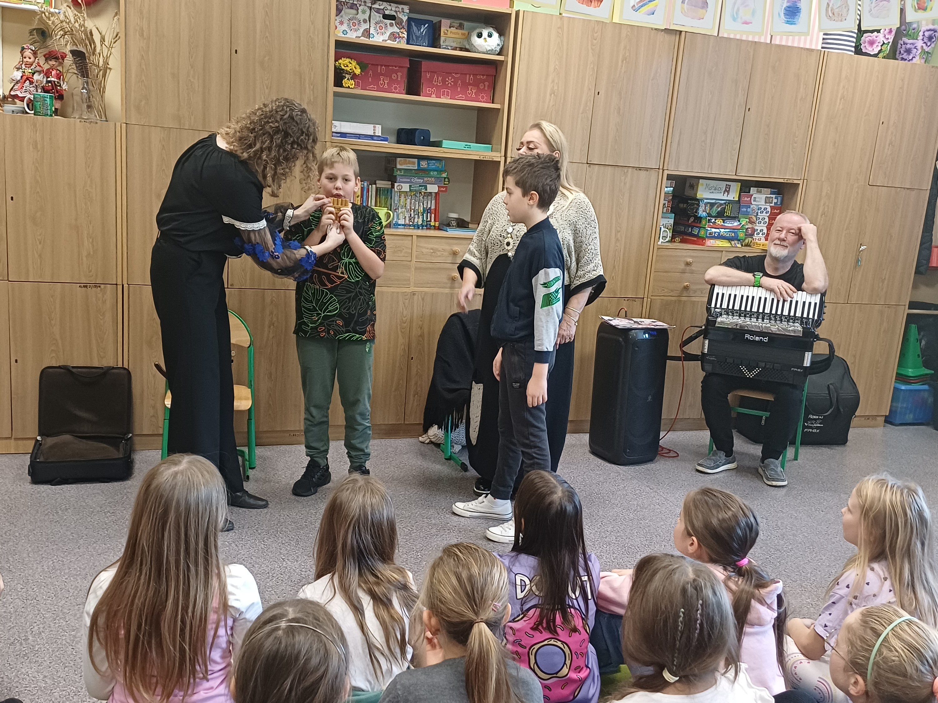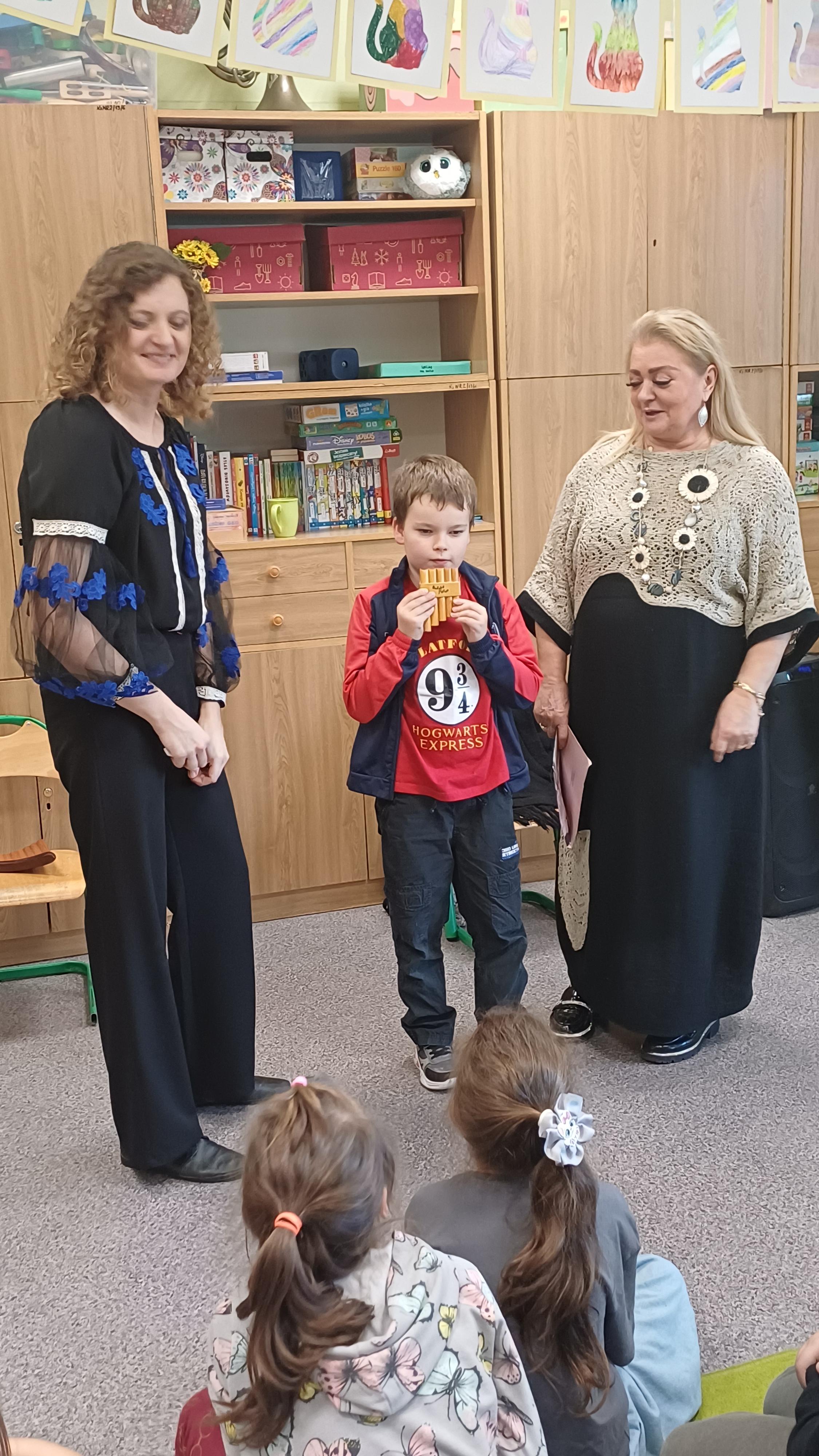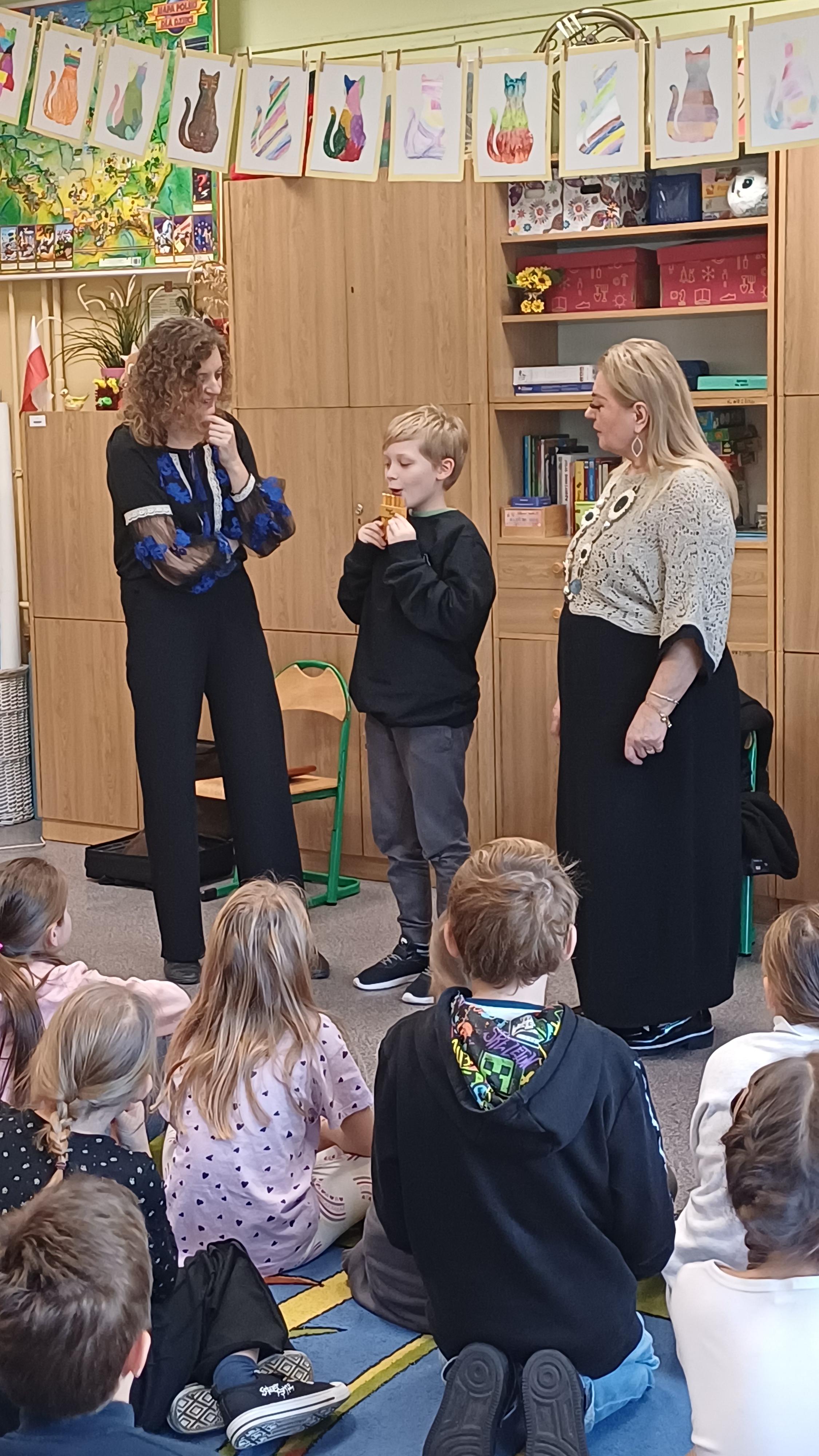 23 października 2025 r. w naszej szkole odbyło się niezwykłe spotkanie z muzyką na żywo, które przeniosło uczniów klas 1-3 w świat dźwięków pełnych emocji i barw. Gościem specjalnym była Pani Daria Noryńska, mistrzyni gry na Fletni Pana – instrumencie rzadko spotykanym, a jednocześnie niezwykle urzekającym swoim brzmieniem. Jest to jeden z najstarszych instrumentów dętych, wywodzących się ze starożytnej Grecji. W repertuarze artystki znalazły się zarówno utwory inspirowane folklorem rumuńskim, jak i melodie znane z muzyki filmowej. Uczniowie mieli okazję nie tylko posłuchać pięknych dźwięków, ale również „zagrać” na tym instrumencie. Choć nie było to łatwe, jednak wszystkim próbującym udało się wydobyć dźwięki.