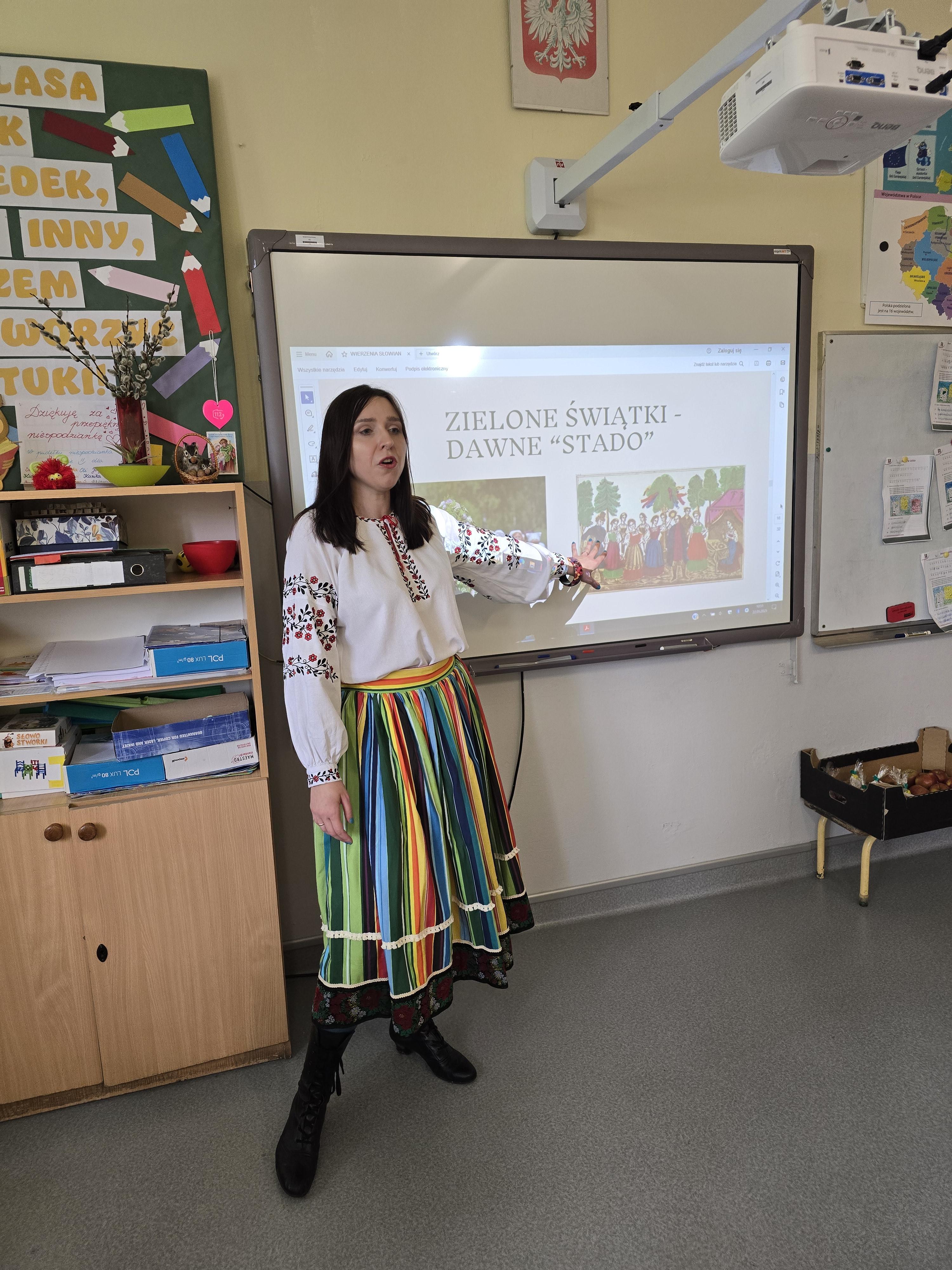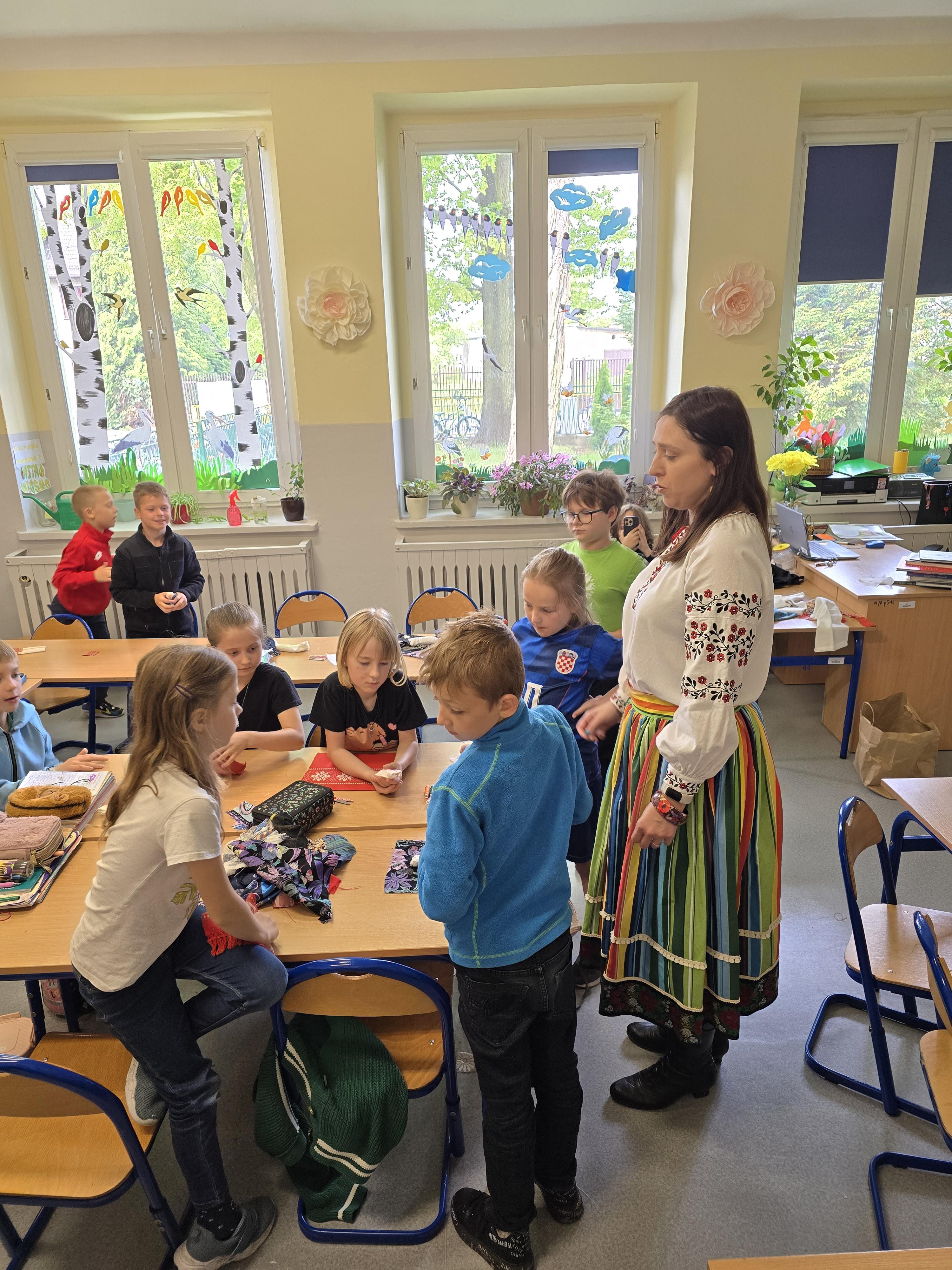 22 maja 2025 roku, gościliśmy mamę naszego kolegi Jaśka Mikinki. Pani Aleksandra Seliga – Mikinka jest polską pisarką, dziennikarką, literaturoznawczynią, wykładowczynią. Opowiadała o mitologii słowiańskiej. Dzięki jej opowieściom poznaliśmy wierzenia i obyczaje naszych pradawnych przodków – Słowian. Dowiedzieliśmy się wiele o słowiańskich świętach, tradycjach, mitach i Bogach. Robiliśmy też wspólnie motanki. Są to tradycyjne słowiańskie lalki wykonywane ręcznie ze skrawków tkanin i nici. Symbolizują ochronę, pomyślność, spełnianie życzeń i przynoszą szczęście. Te niepowtarzalne laleczki uważano za amulety chroniące przed złymi duchami i chorobami. Każdy z nas stworzył inną, własną, barwną motankę.