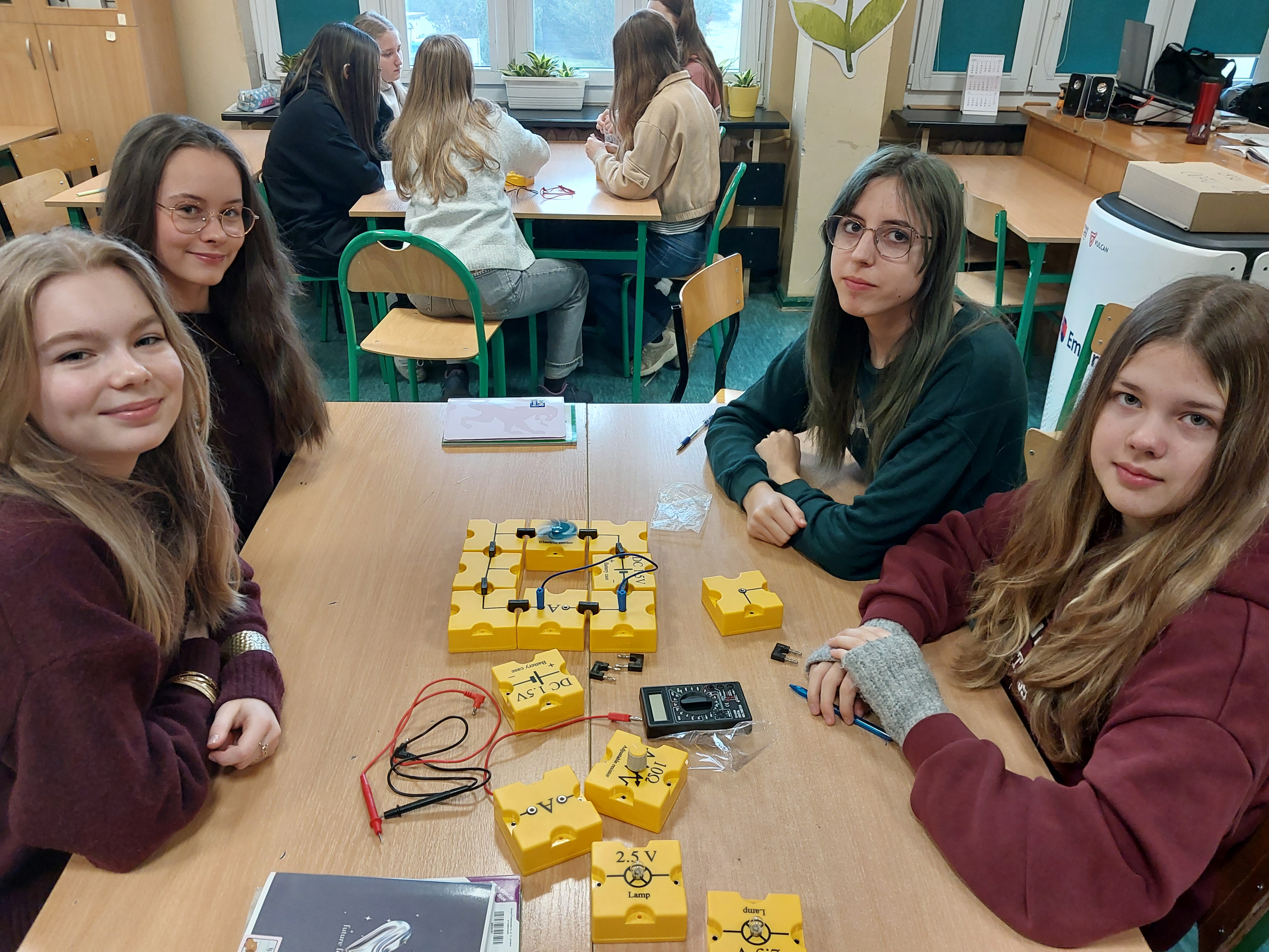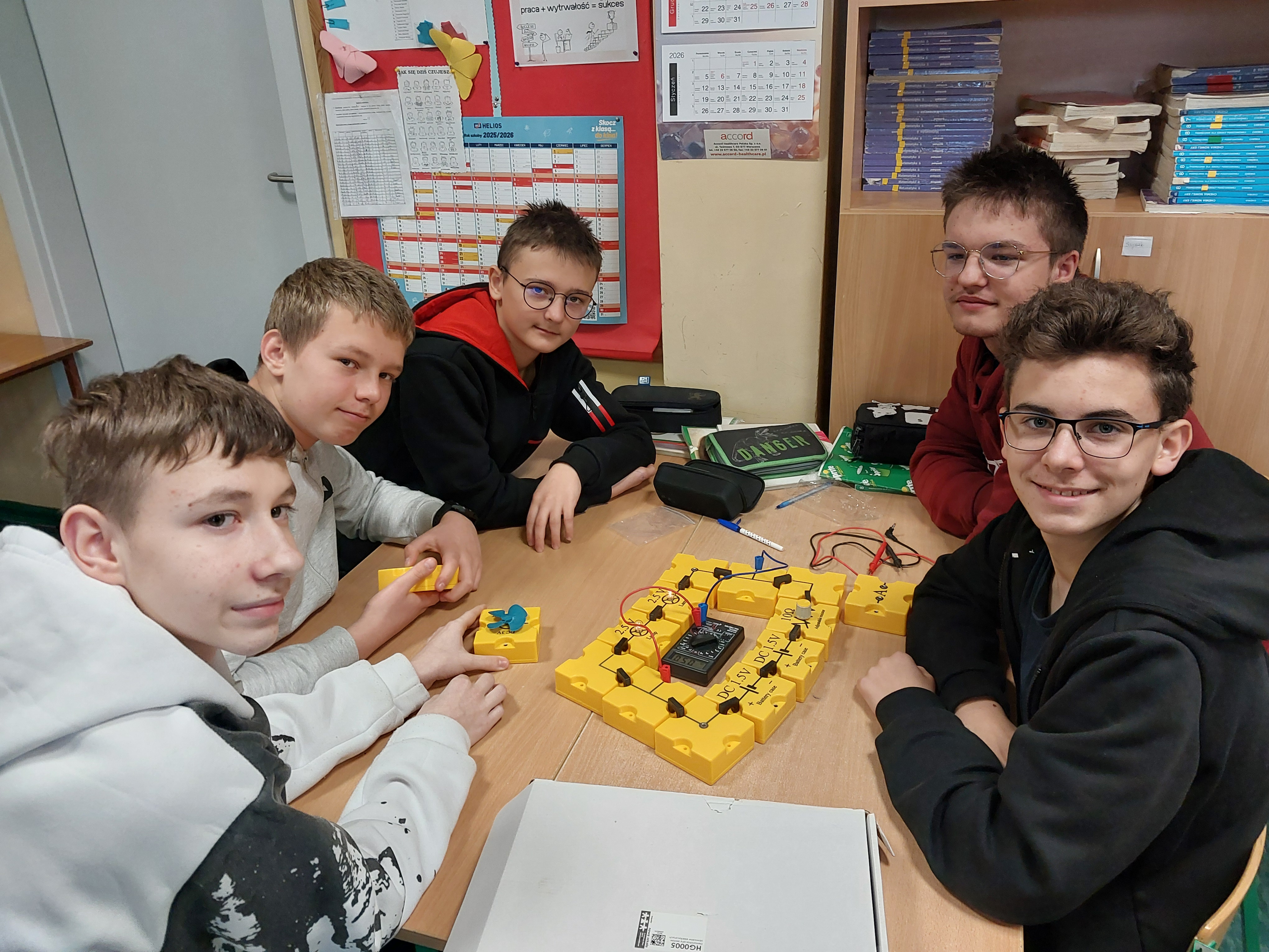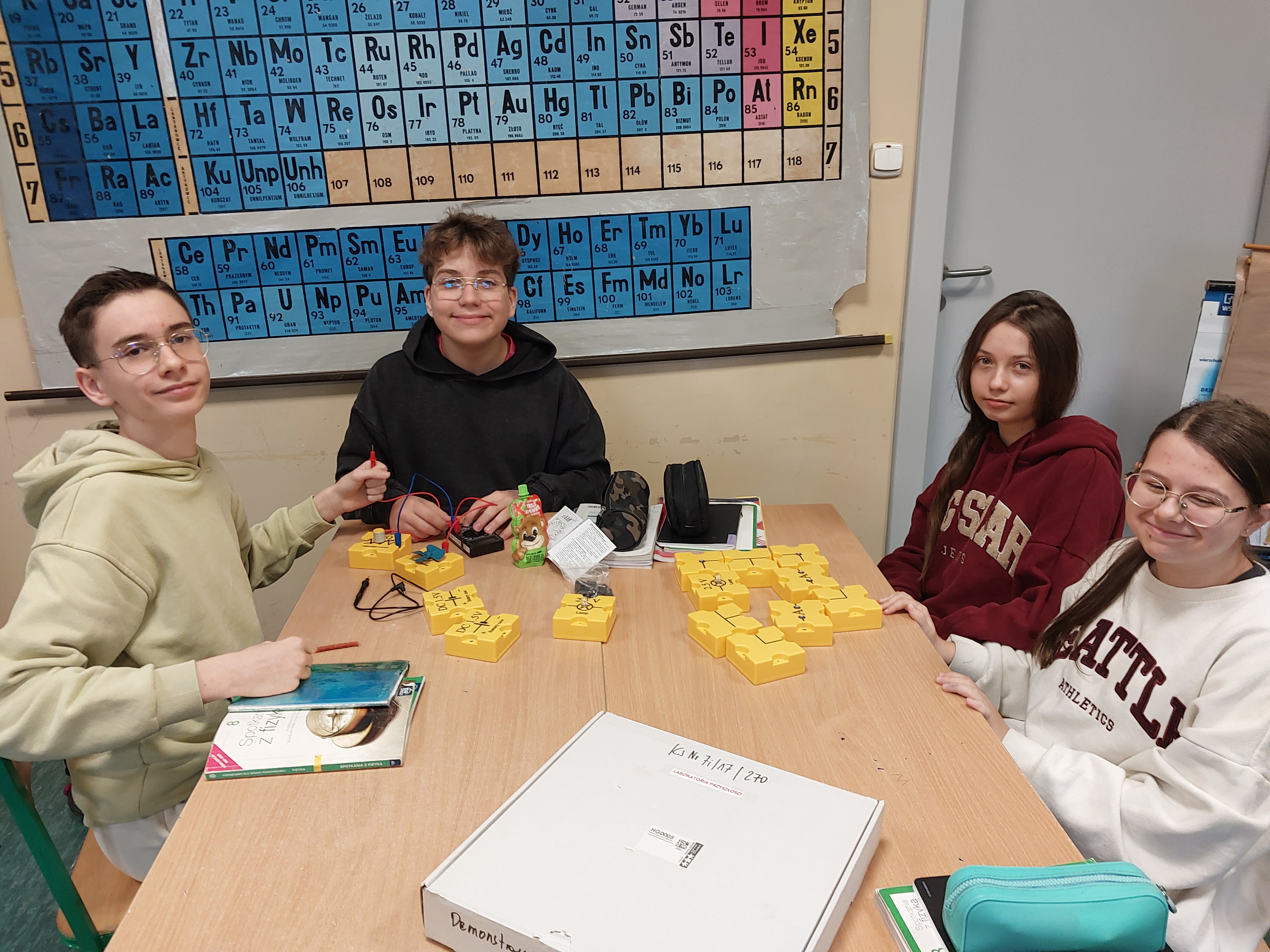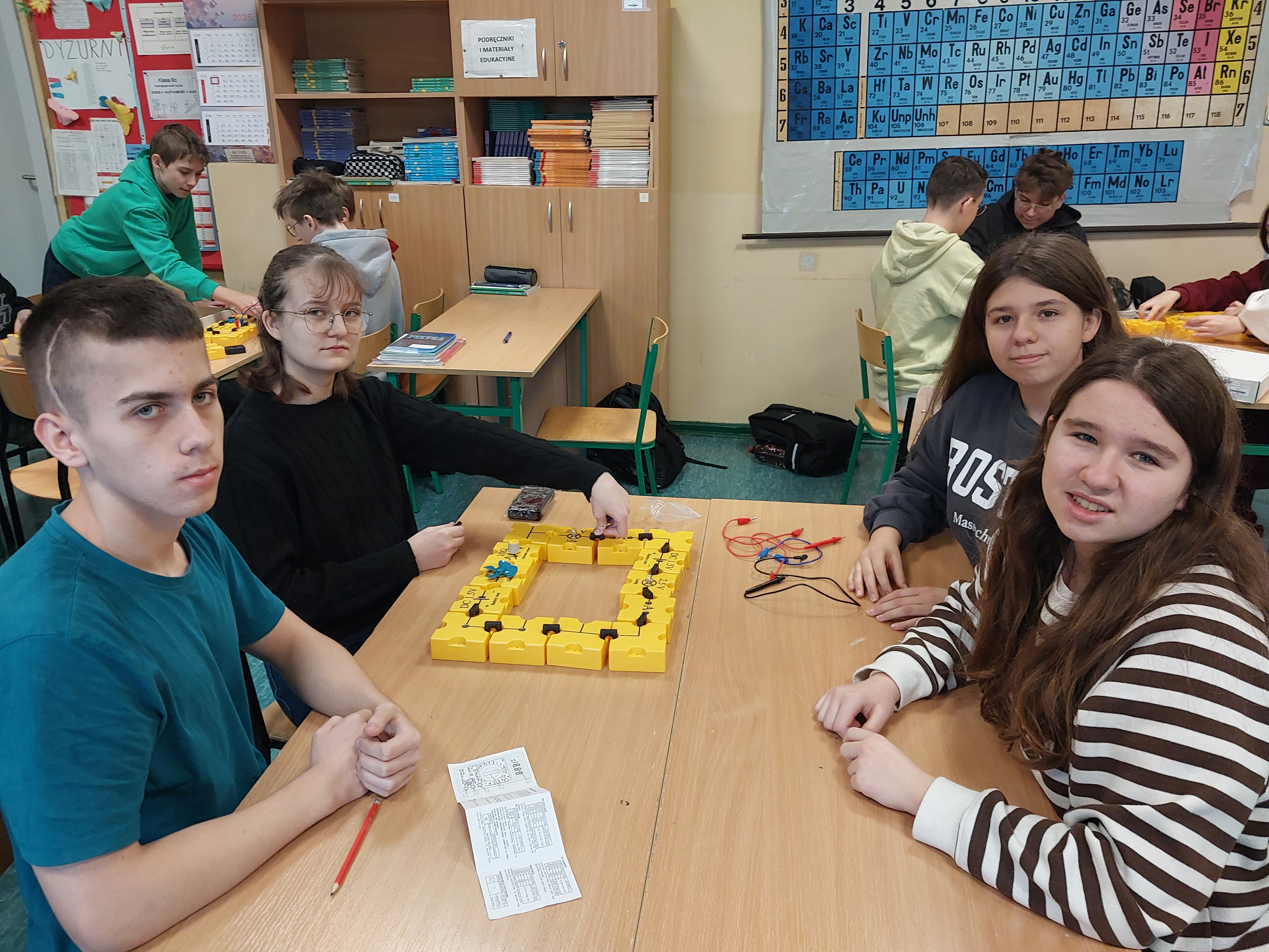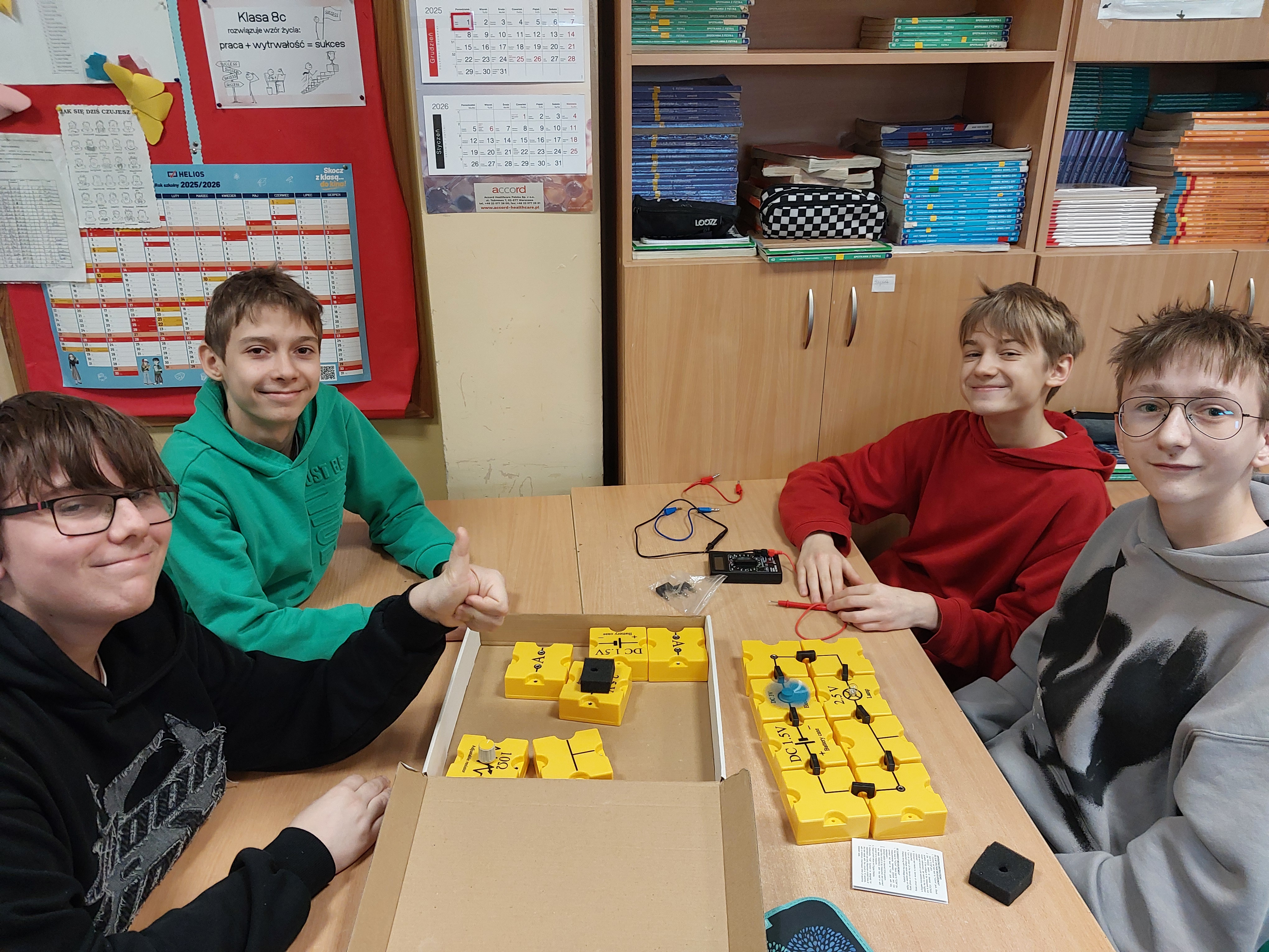 W dniach 03.12.2025 (kl. 8a, 8b), 08.12.2025 (kl. 8c) uczniowie próbowali swoich sił w budowaniu prostych obwodów elektrycznych wykorzystując do tego zestawy demonstracyjne z programu Laboratoria Przyszłości.