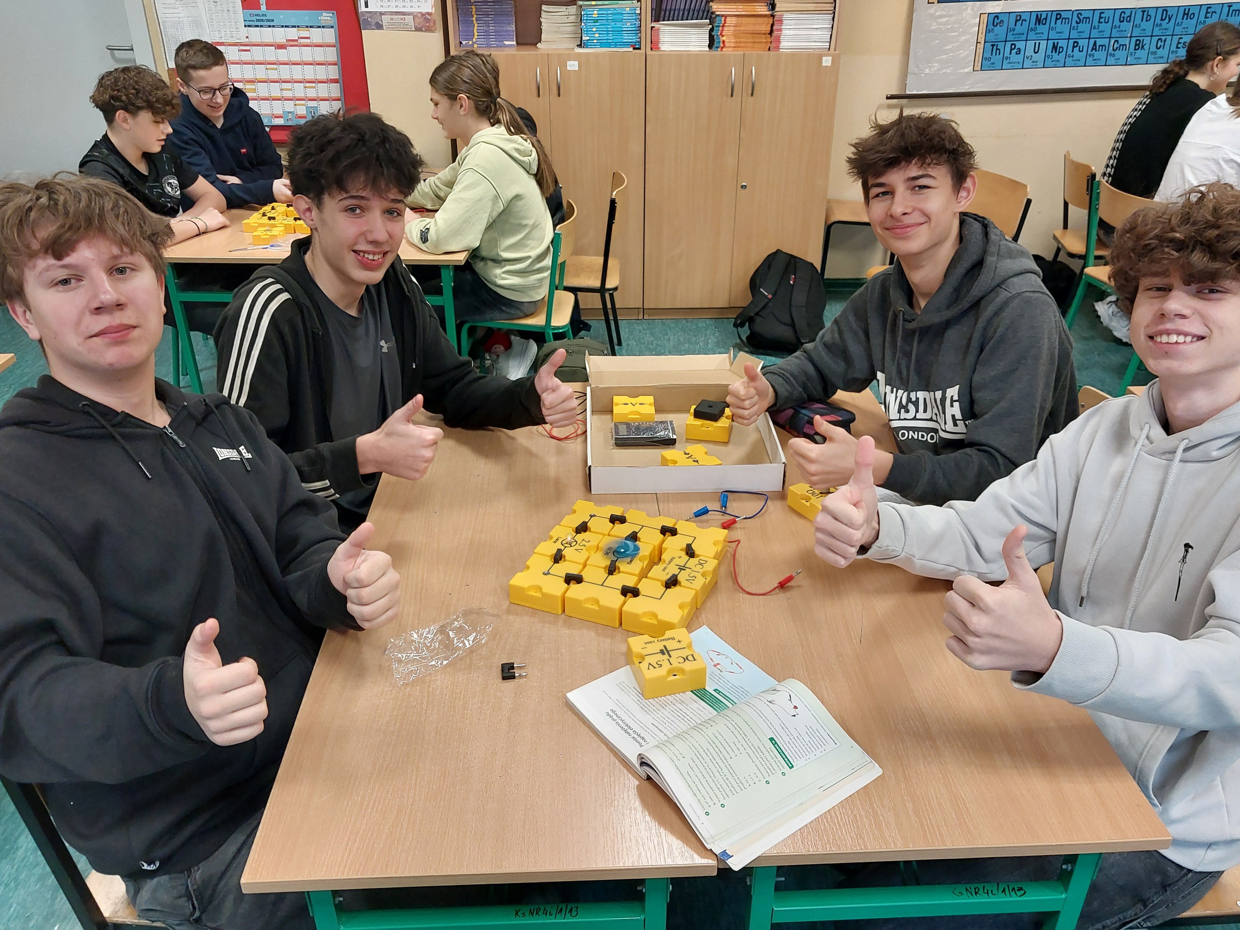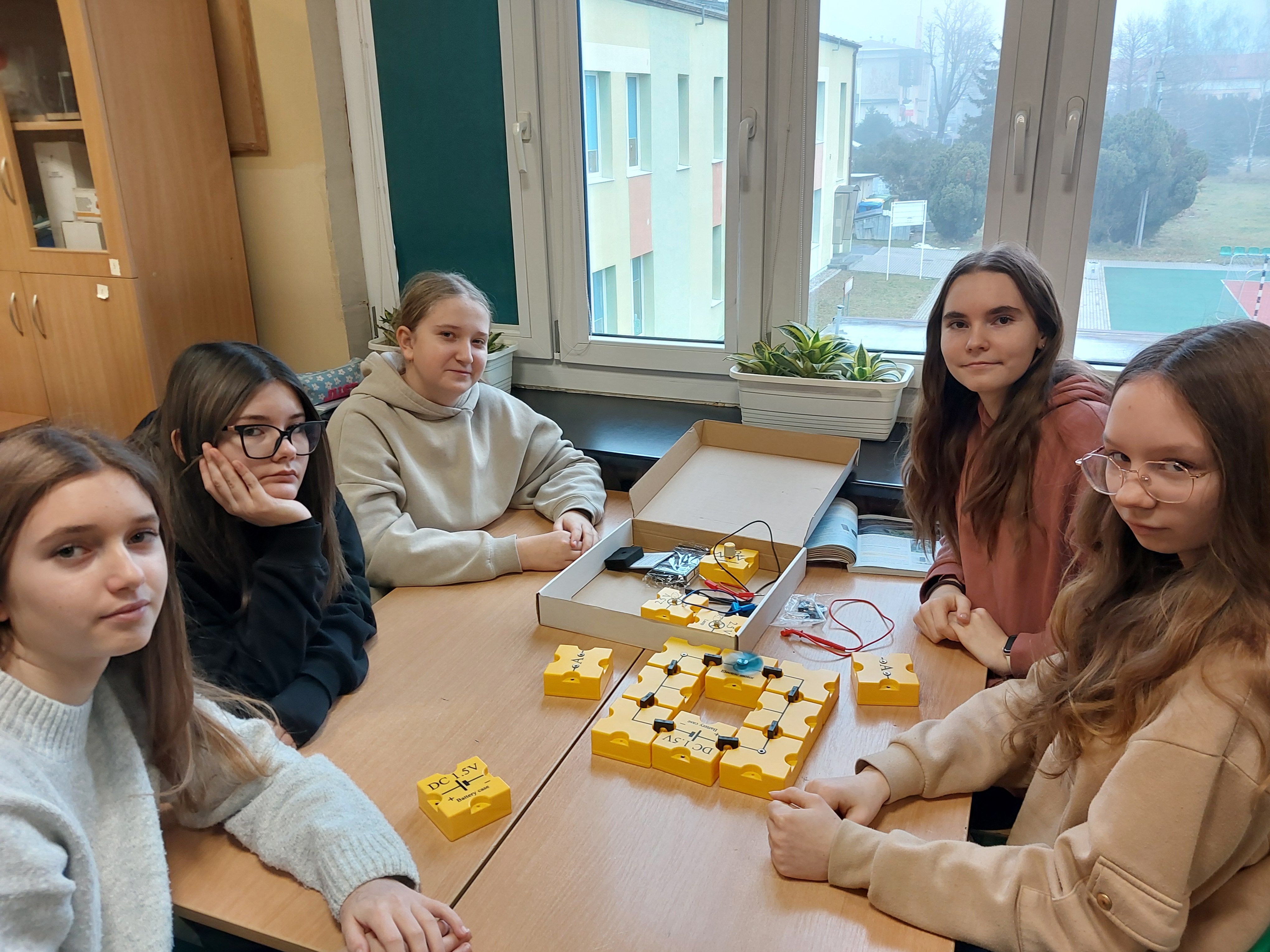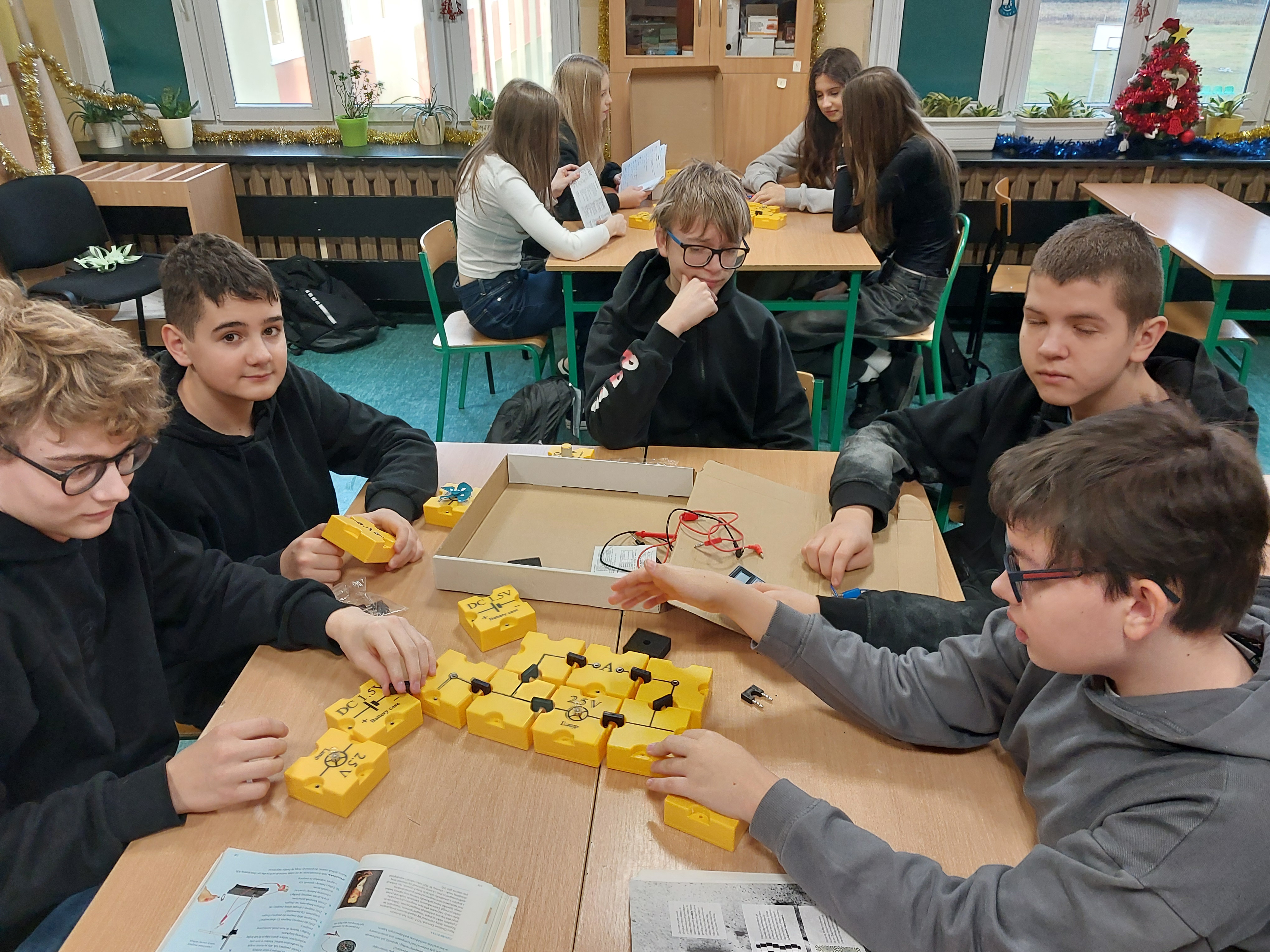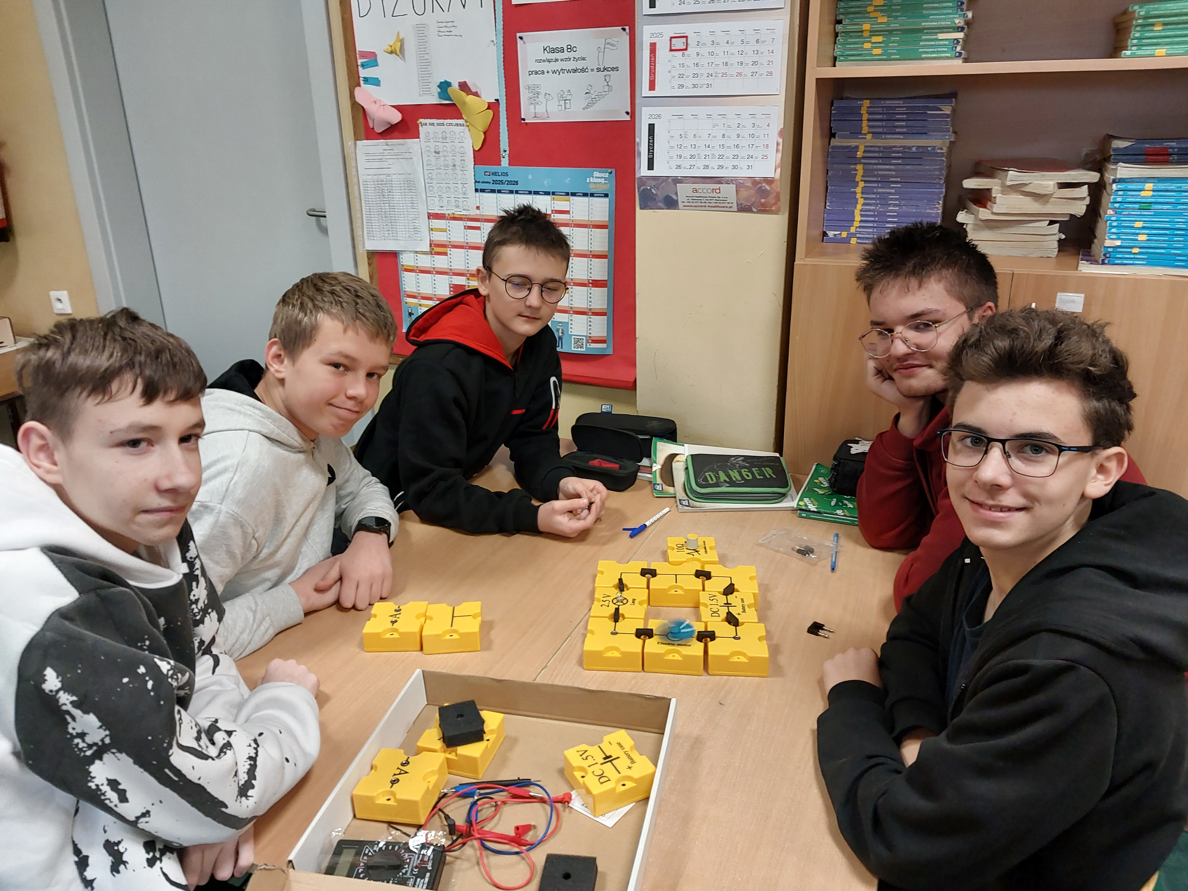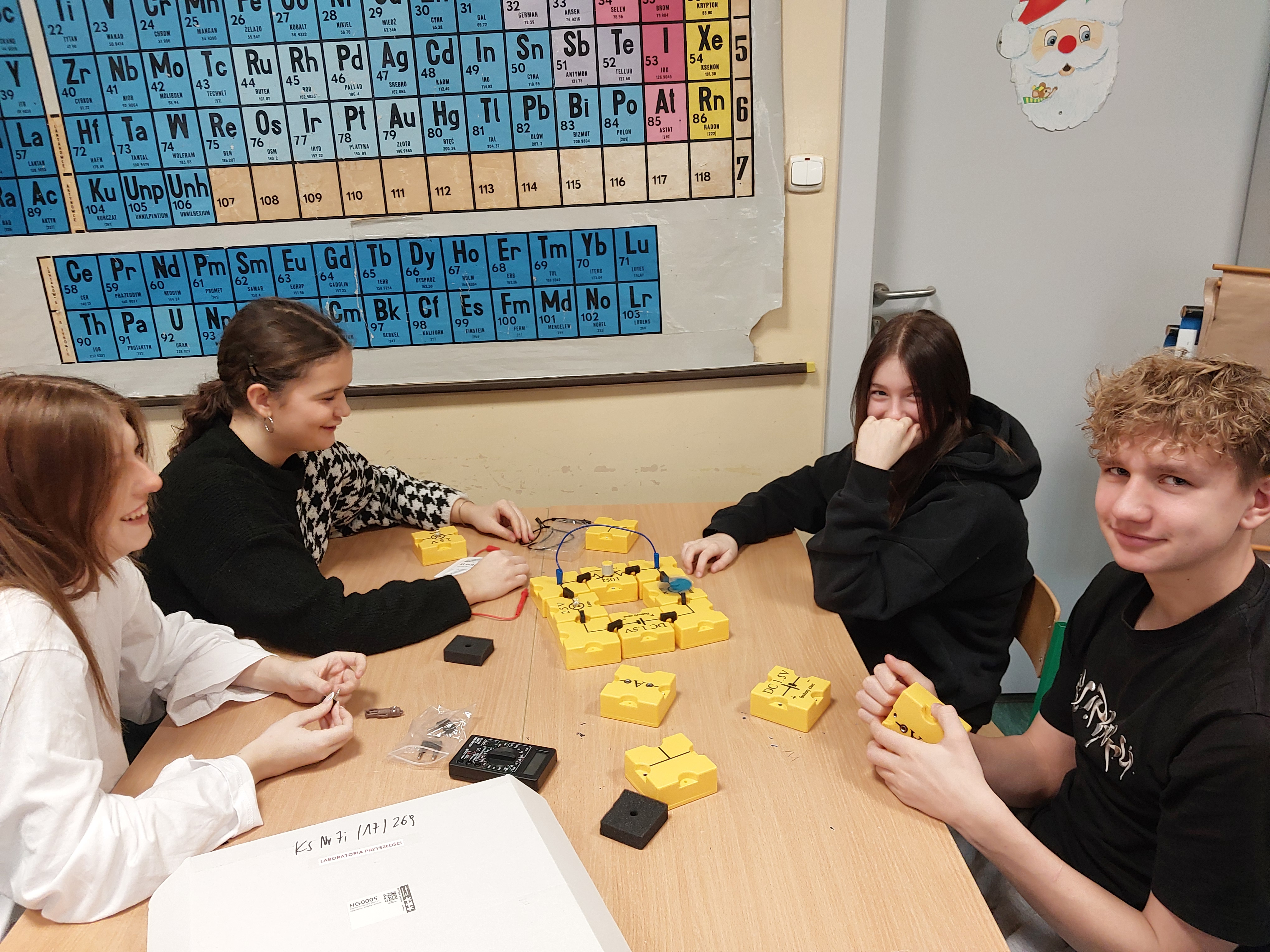 W dniach 03.12.2025 (kl. 8a, 8b), 08.12.2025 (kl. 8c) uczniowie próbowali swoich sił w budowaniu prostych obwodów elektrycznych wykorzystując do tego zestawy demonstracyjne z programu Laboratoria Przyszłości.