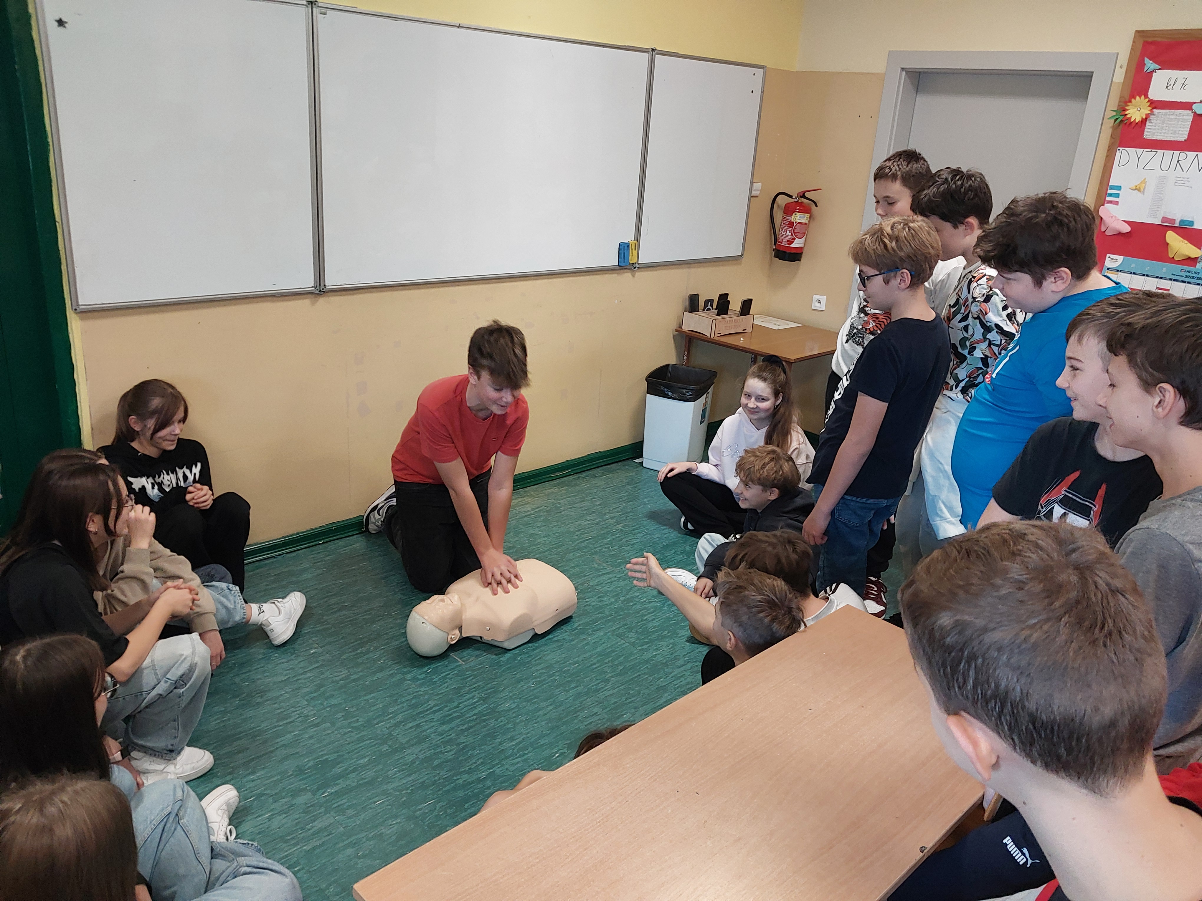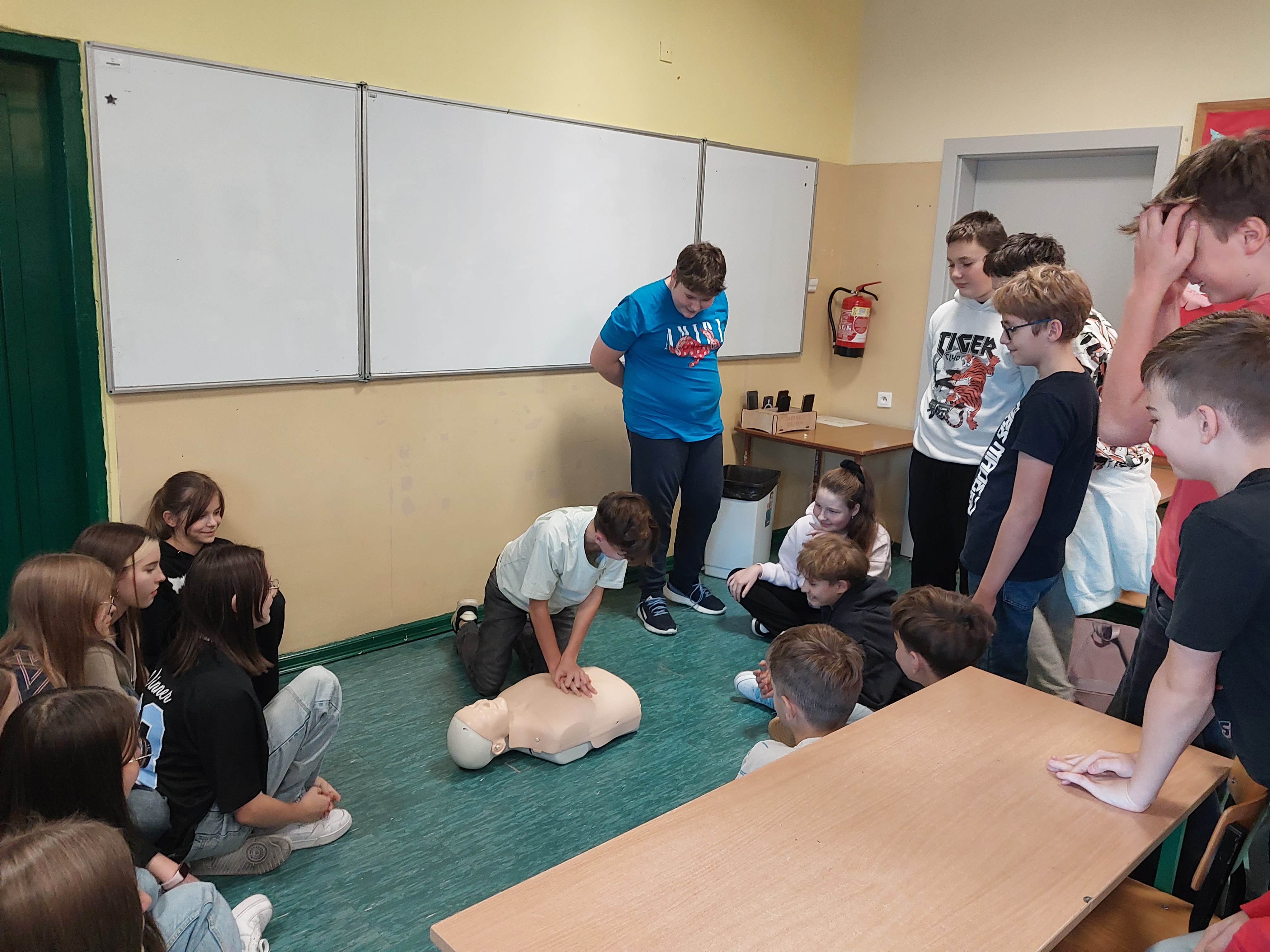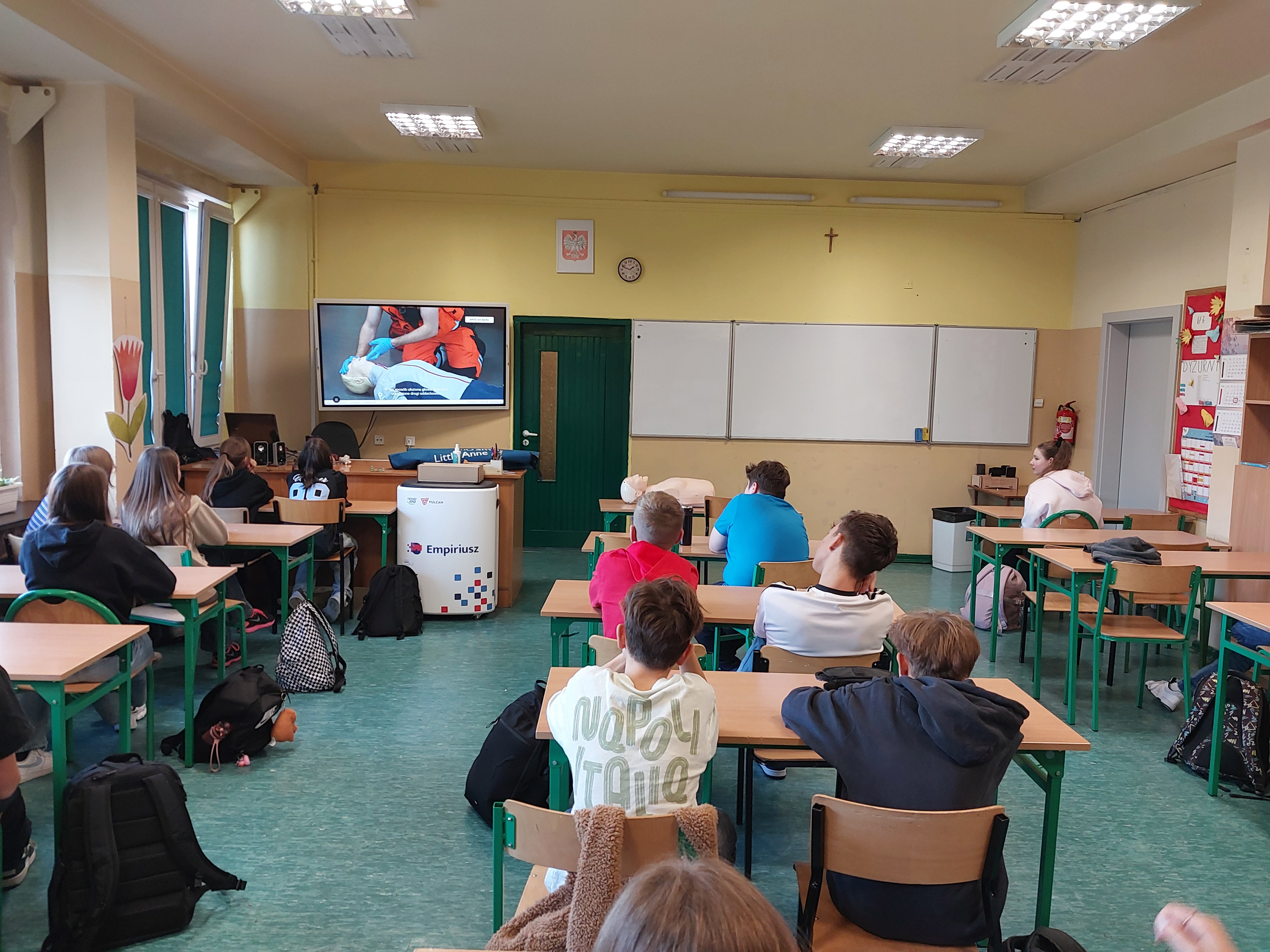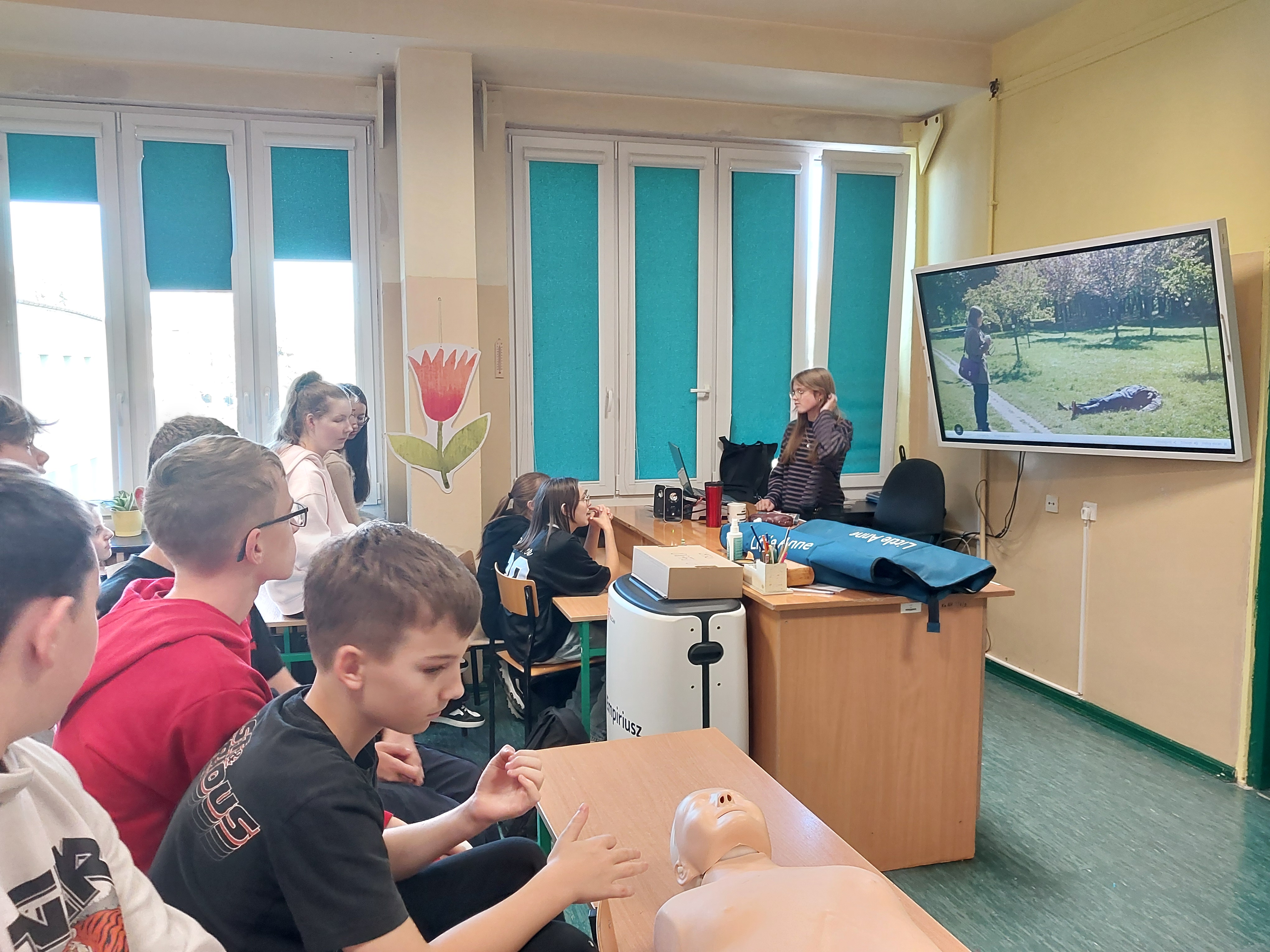 W dniu 23.10.2025 podczas zajęć z wychowawcą uczniowie mieli okazję decydować jak zachować się podczas różnych sytuacji, które mogą napotkać w życiu codziennym np. zachłyśnięcie, padaczka, zatrzymanie akcji serca. Skorzystali w tym celu z udostępnionych przez gminę interaktywnych filmów online. W szkole jest dostępny fantom, którego uczniowie użyli, aby spróbować, jak należy zachować się, gdy osoba jest nieprzytomna i nie oddycha. Wcześniej przejrzeli filmy instruktażowe udostępnione przez gminę Ksawerów. Uczniowie przypomnieli sobie także, że na budynku naszej szkole znajduje się AED, którą w razie potrzeby będą potrafili użyć.