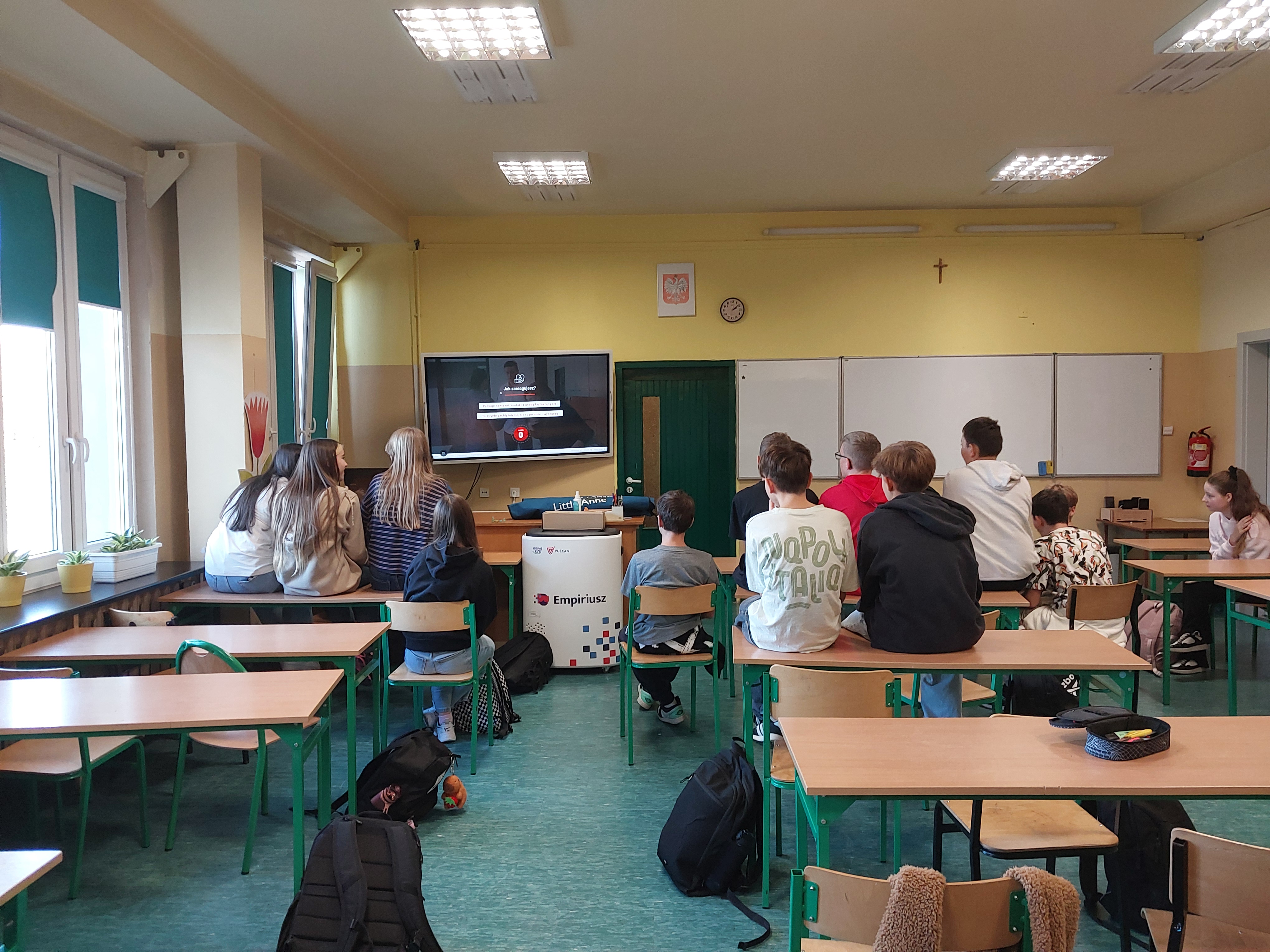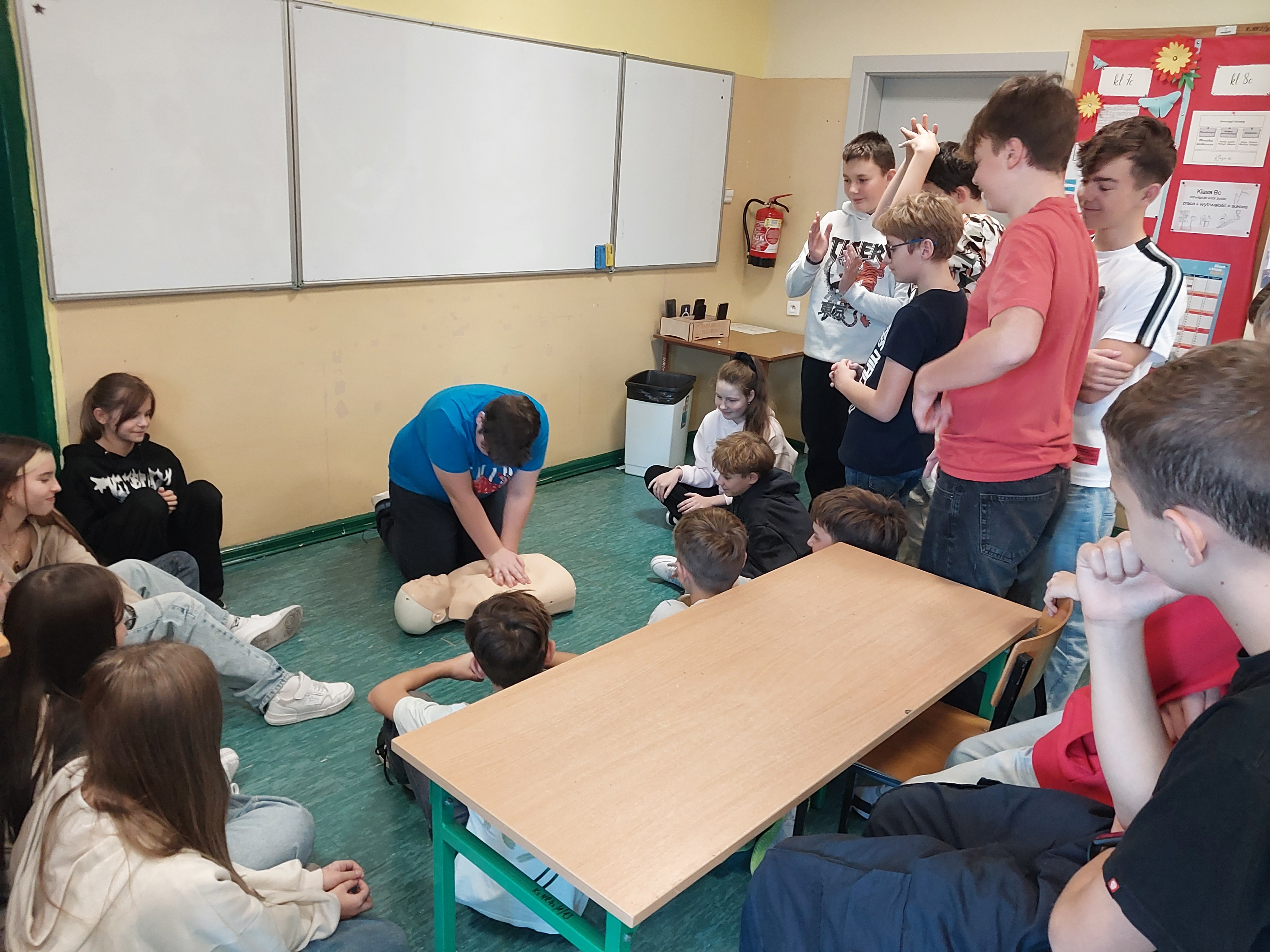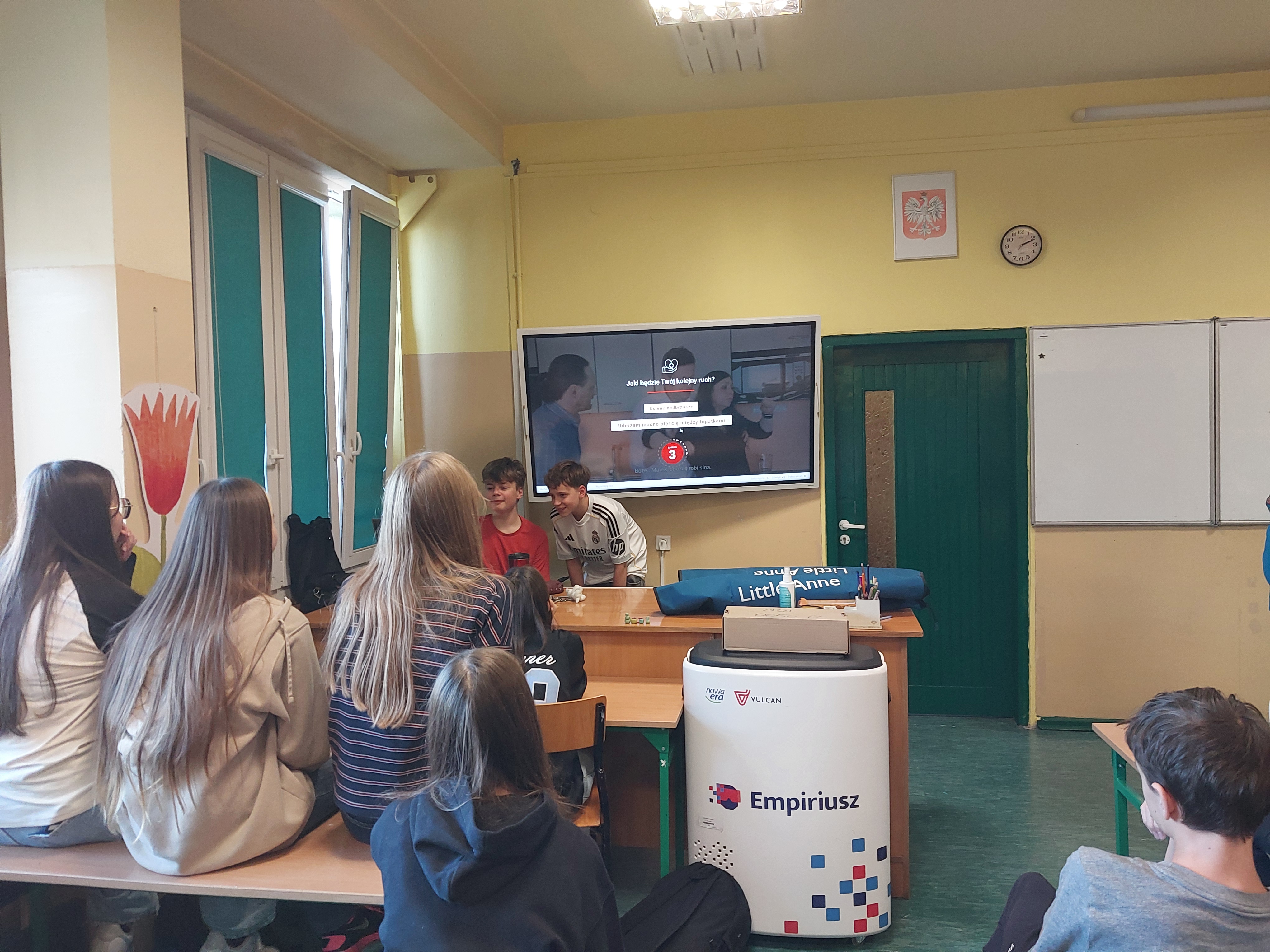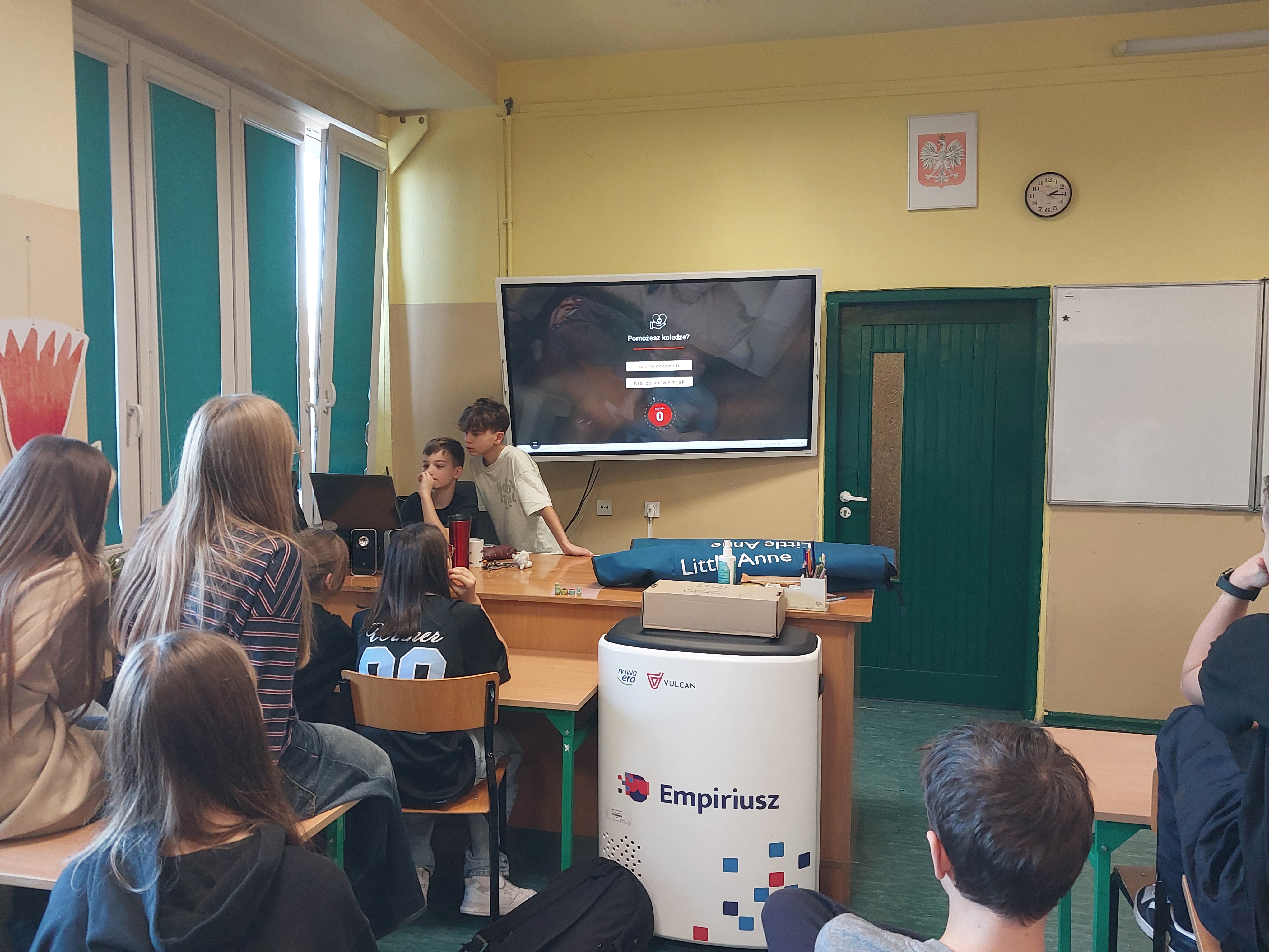 W dniu 23.10.2025 podczas zajęć z wychowawcą uczniowie mieli okazję decydować jak zachować się podczas różnych sytuacji, które mogą napotkać w życiu codziennym np. zachłyśnięcie, padaczka, zatrzymanie akcji serca. Skorzystali w tym celu z udostępnionych przez gminę interaktywnych filmów online. W szkole jest dostępny fantom, którego uczniowie użyli, aby spróbować, jak należy zachować się, gdy osoba jest nieprzytomna i nie oddycha. Wcześniej przejrzeli filmy instruktażowe udostępnione przez gminę Ksawerów. Uczniowie przypomnieli sobie także, że na budynku naszej szkole znajduje się AED, którą w razie potrzeby będą potrafili użyć.