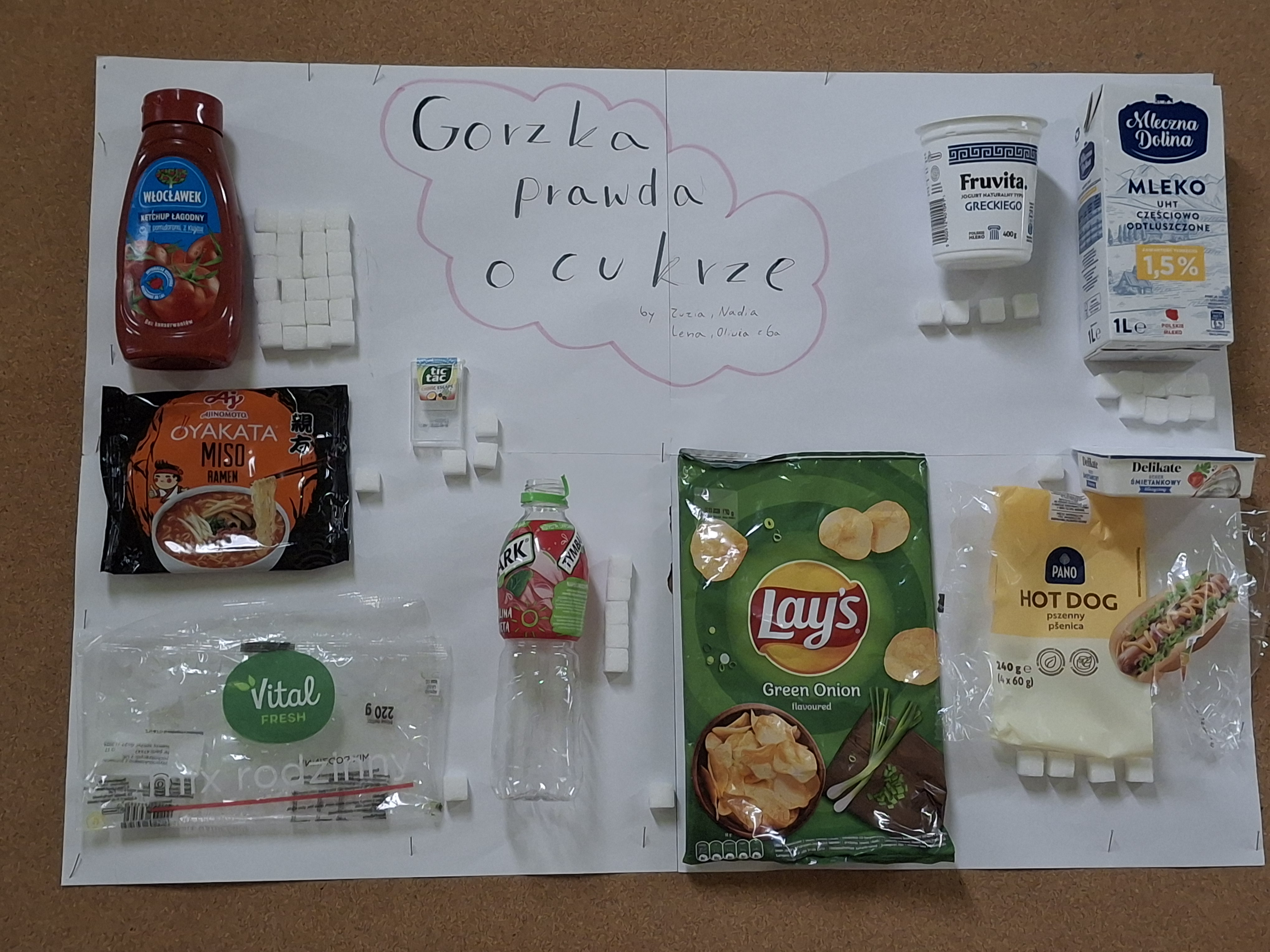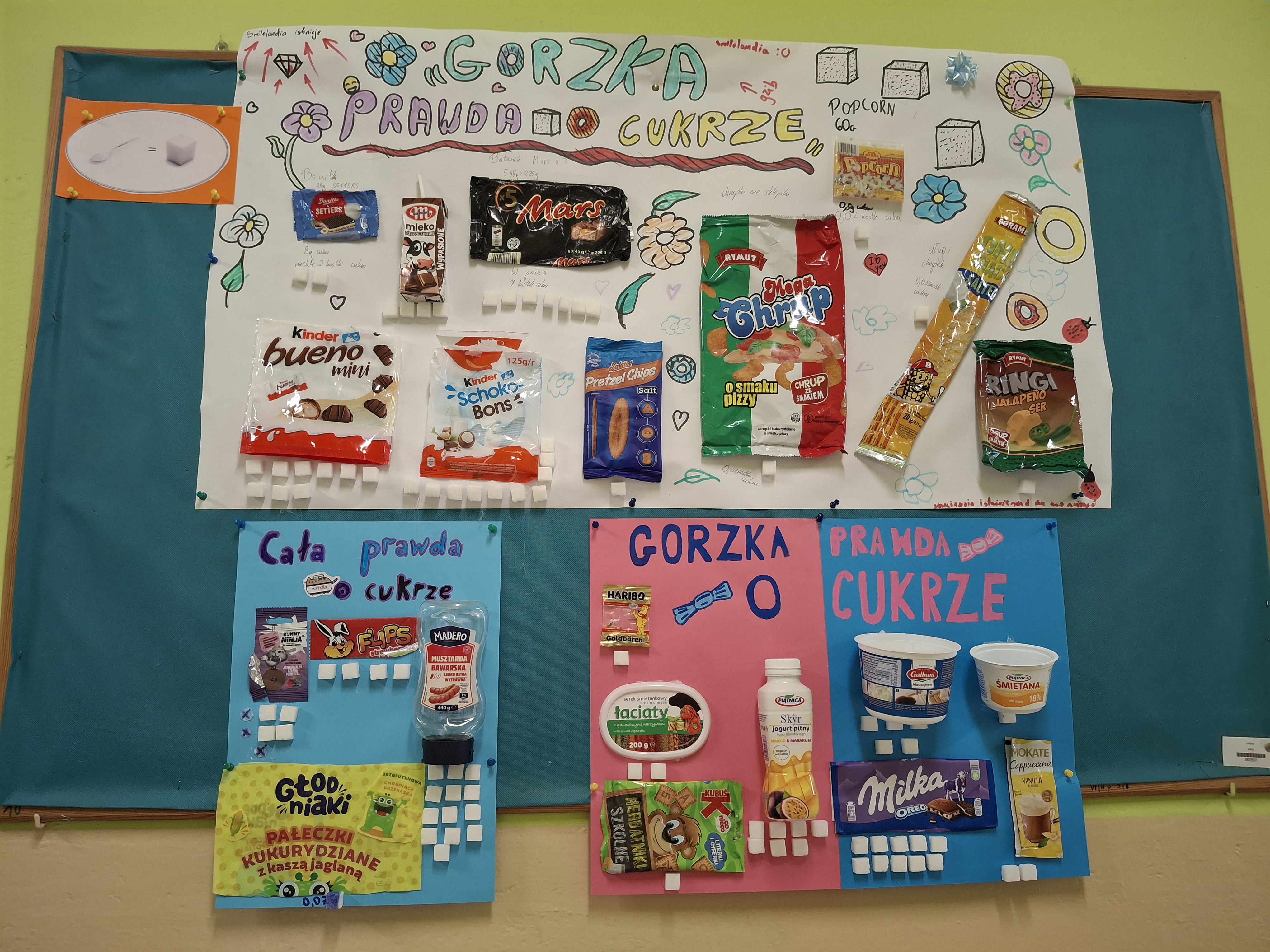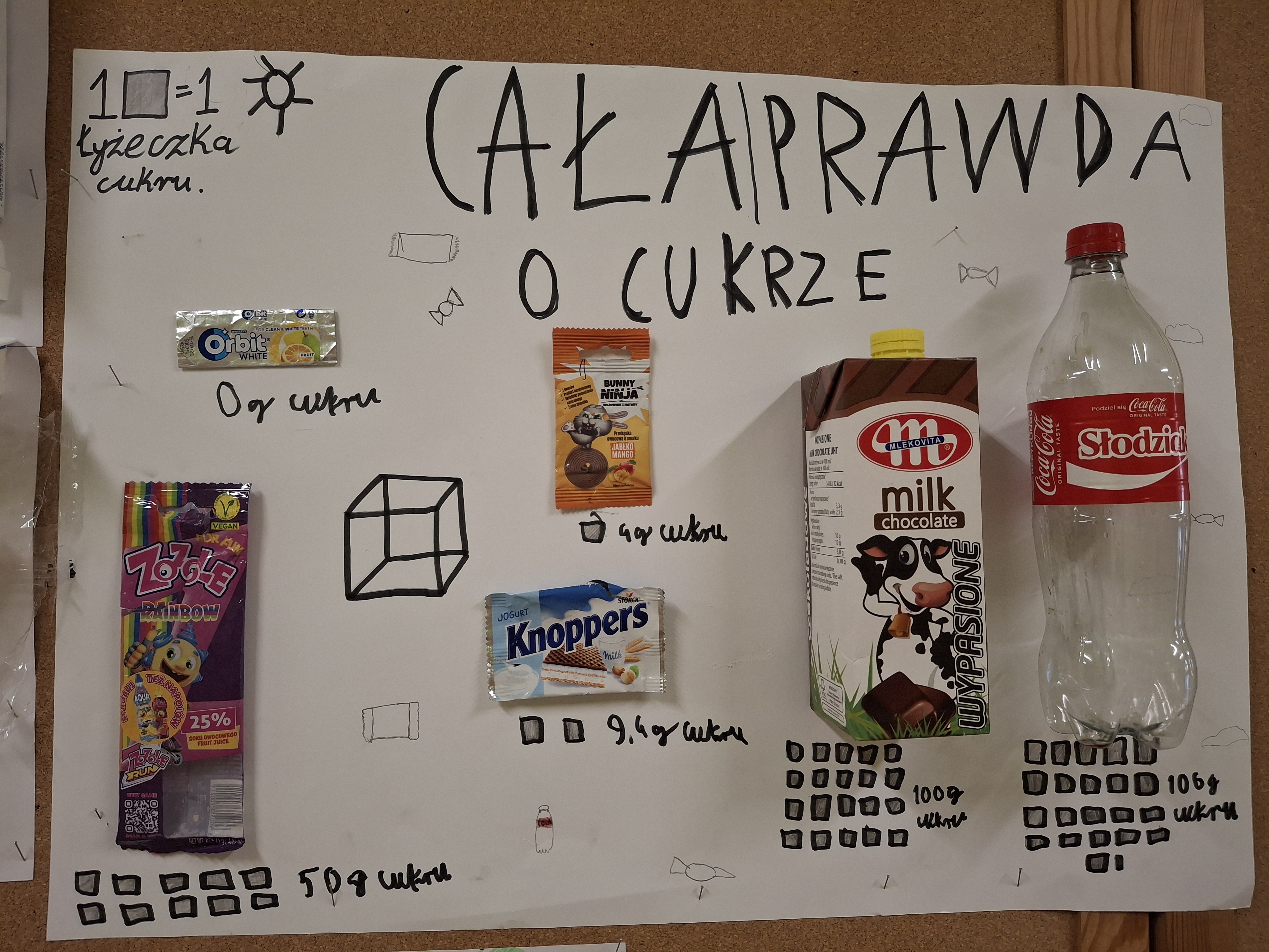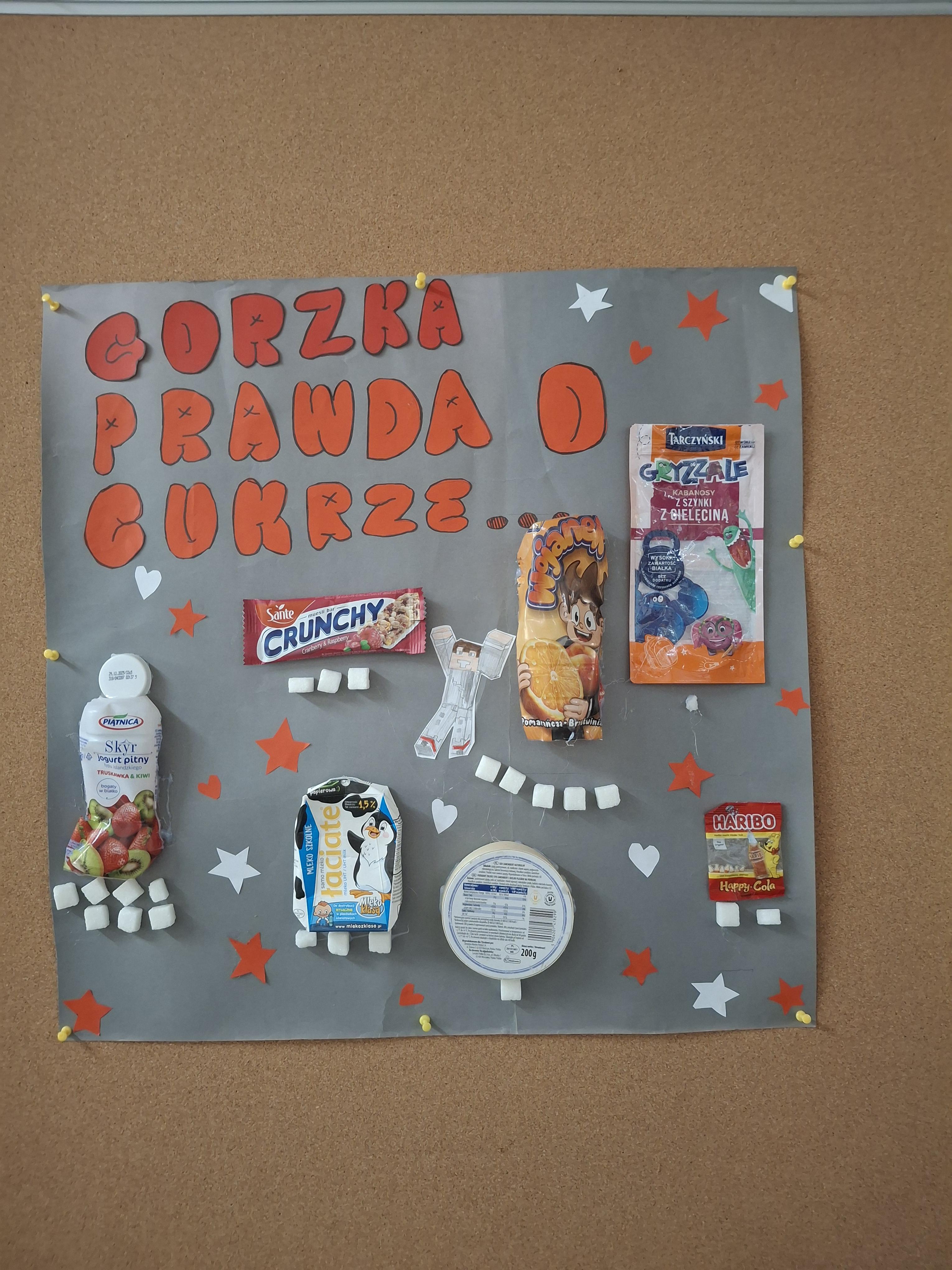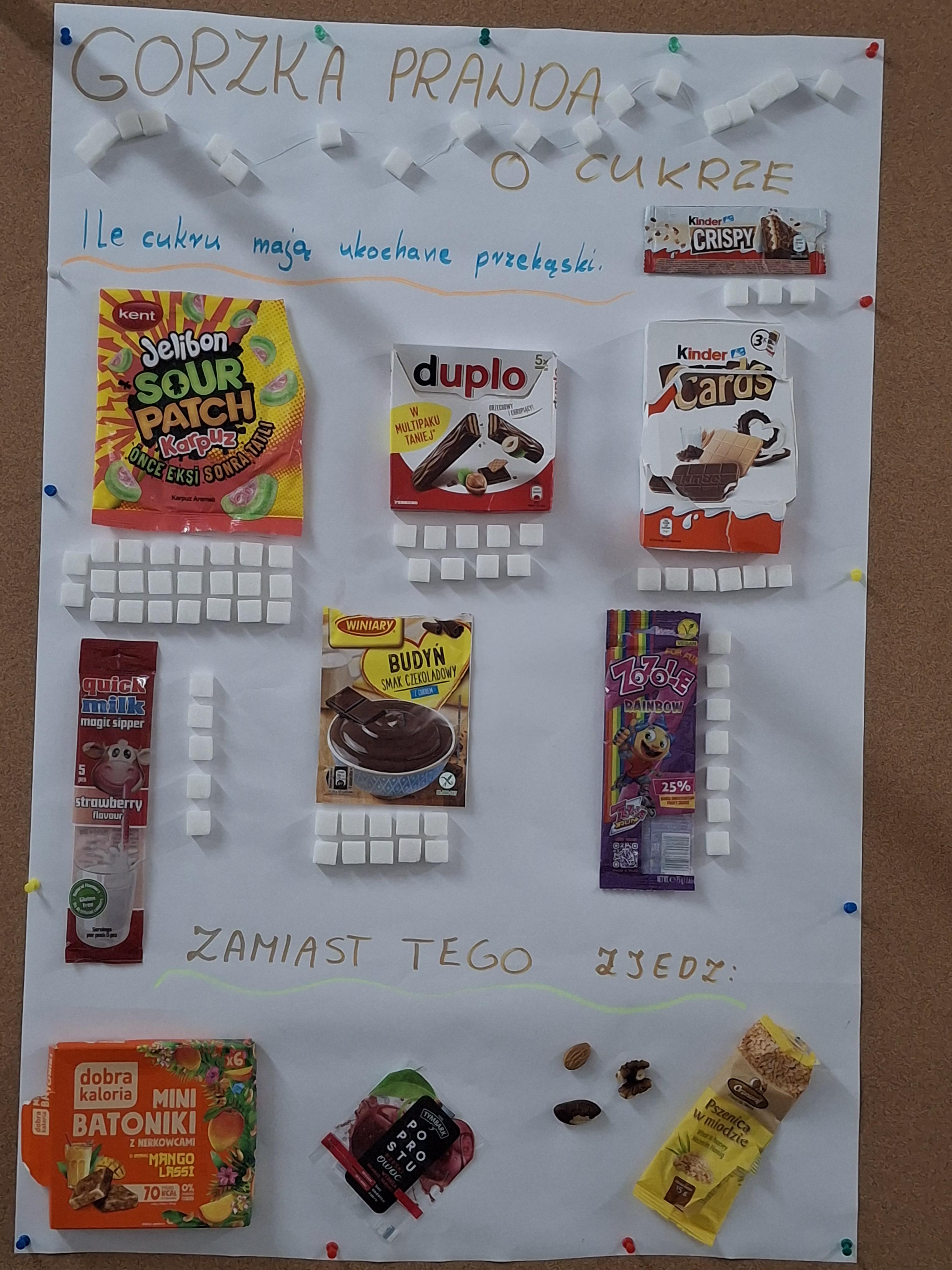 Uczniowie na swoich pracach przedstawili produkty, które spożywamy codziennie nie zdając sobie sprawy ile jest w nich ukrytego cukru.