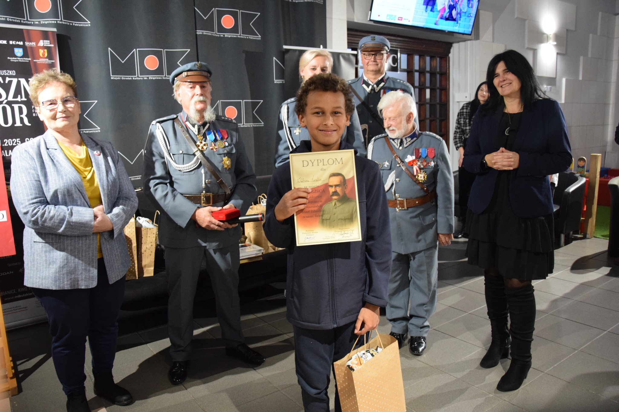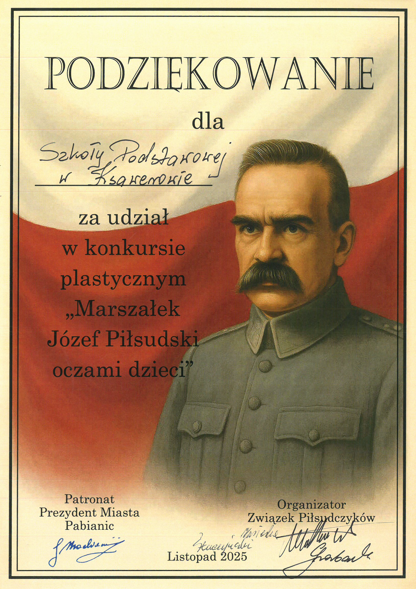 Dnia 7.11.2025 r. w Miejskim Ośrodku Kultury w Pabianicach odbyła się miła uroczystość - rozstrzygnięcie konkursu plastycznego Marszałek Józef Piłsudski oczami dzieci. Organizatorem konkursu był Związek Piłsudczyków RP Okręg Łódzko - Sieradzki. W uroczystości wzięli udział przedstawiciele Związku w strojach wojskowych z epoki II Rzeczypospolitej. Gościem honorowym była pani Aleksandra Jarmakowska-Jasiczek - zastępca prezydenta Pabianic. Z naszej szkoły aż 17 uczniów wzięło udział w konkursie - najwięcej w powiecie. Czworo z nich zdobyło nagrody: - kategoria klas 1-6: Paulina Grochulska, kl. 1 - I miejsce Zofia Sobieraj, kl. 5 - II miejsce Wiktor Nwafor, kl. 4 - III miejsce Zuzanna Donifacy, kl. 6 - wyróżnienie Szkolnym koordynatorem konkursu była p. Agnieszka Jabłońska. Serdecznie gratulujemy zwycięzcom i pozostałym uczniom, którzy wzięli udział w konkursie. Wszystkie prace są bardzo ciekawe, zwracają uwagę ze względu na treść, symbolikę oraz sposób wykonania. Była to okazja do zaprezentowania talentów naszych uczniów, a także do zgłębienia wiedzy o Józefie Piłsudskim, który odegrał ważną rolę w odzyskaniu niepodległości w 1918 roku, a w wolnej Polsce był Naczelnikiem Państwa i pierwszym Marszałkiem Polski.