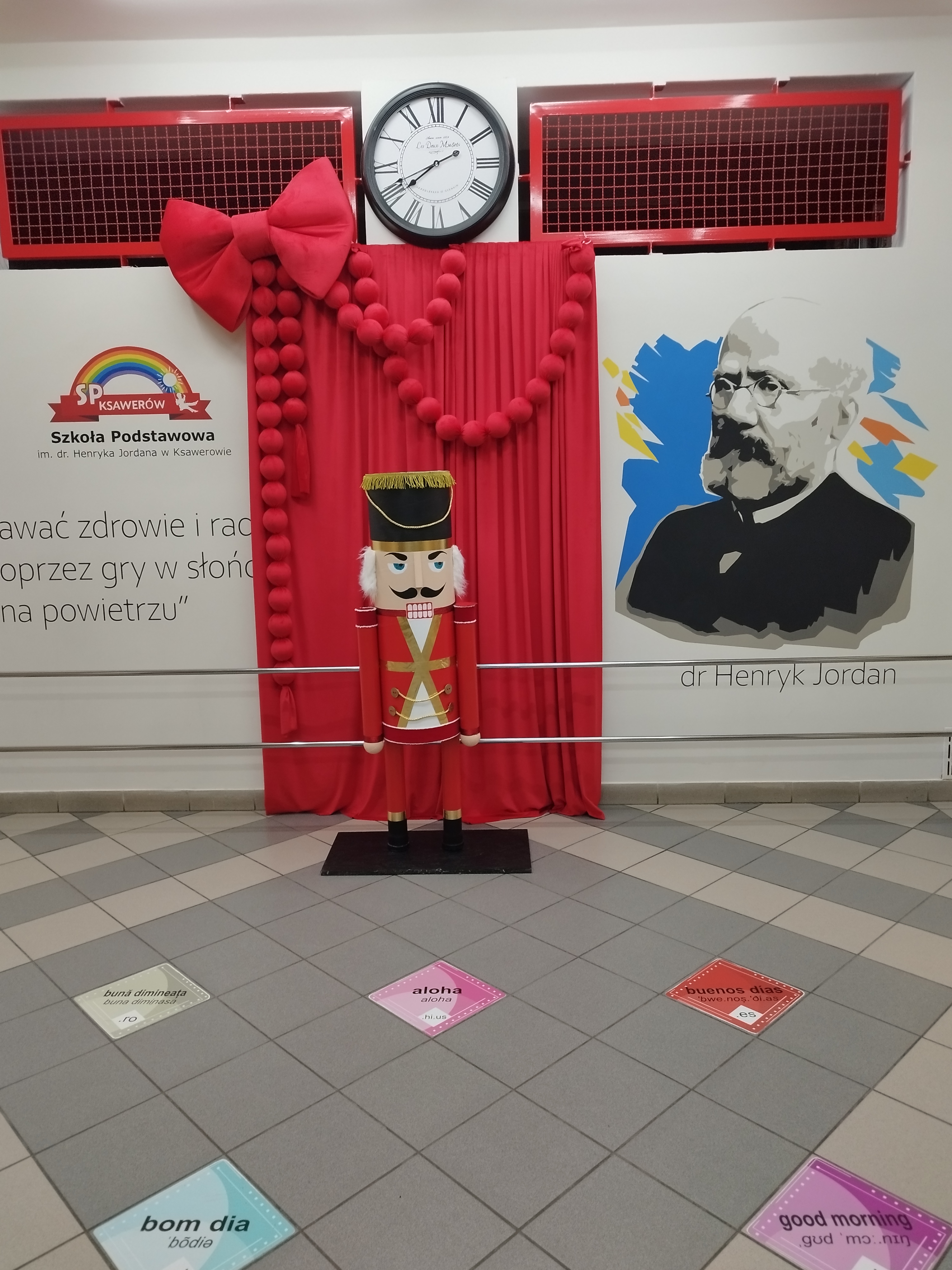 Wnętrze szkoły zachwyca udekorowanymi korytarzami i pracowniami. Po przekroczeniu progu placówki odwiedzających wita wyjątkowa, świąteczna czerwona ściana, na tle której znajduje się duża postać dziadka do orzechów — jedna z najbardziej charakterystycznych i chętnie podziwianych dekoracji.
