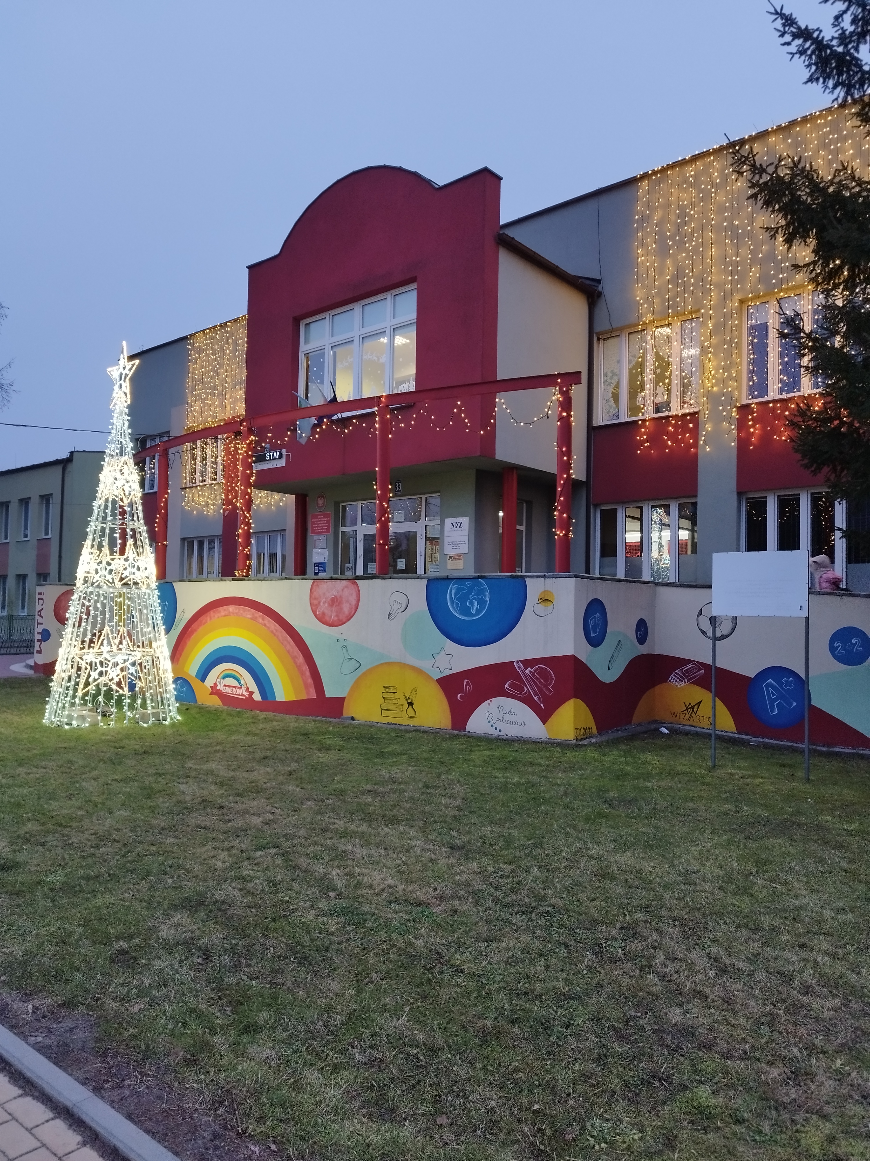 Przed budynkiem Szkoły Podstawowej w Ksawerowie uwagę przyciągają efektowne kurtyny świetlne umieszczone na ścianach szkoły oraz liczne świetlne ozdoby, które już od wejścia wprowadzają w świąteczny nastrój.