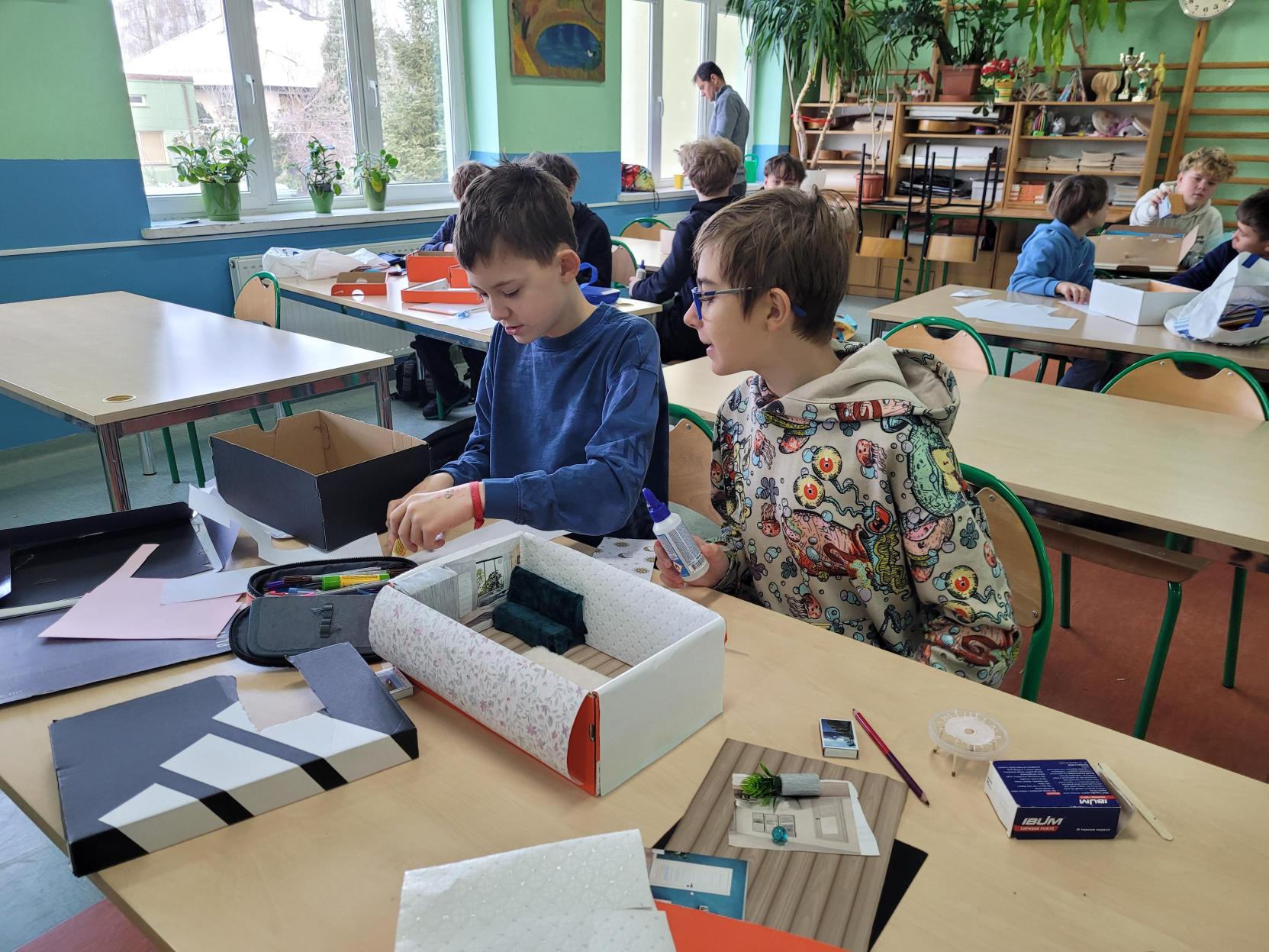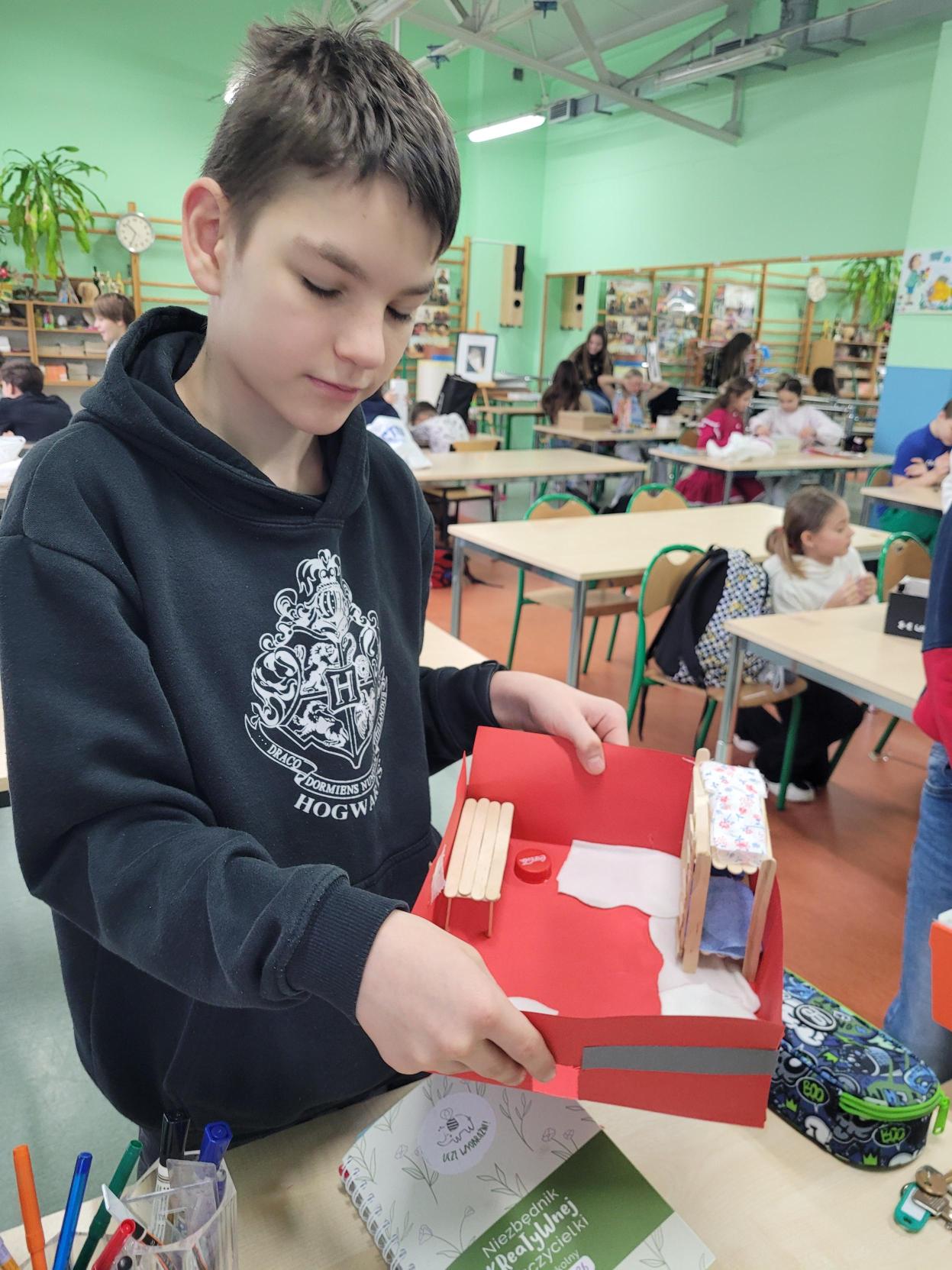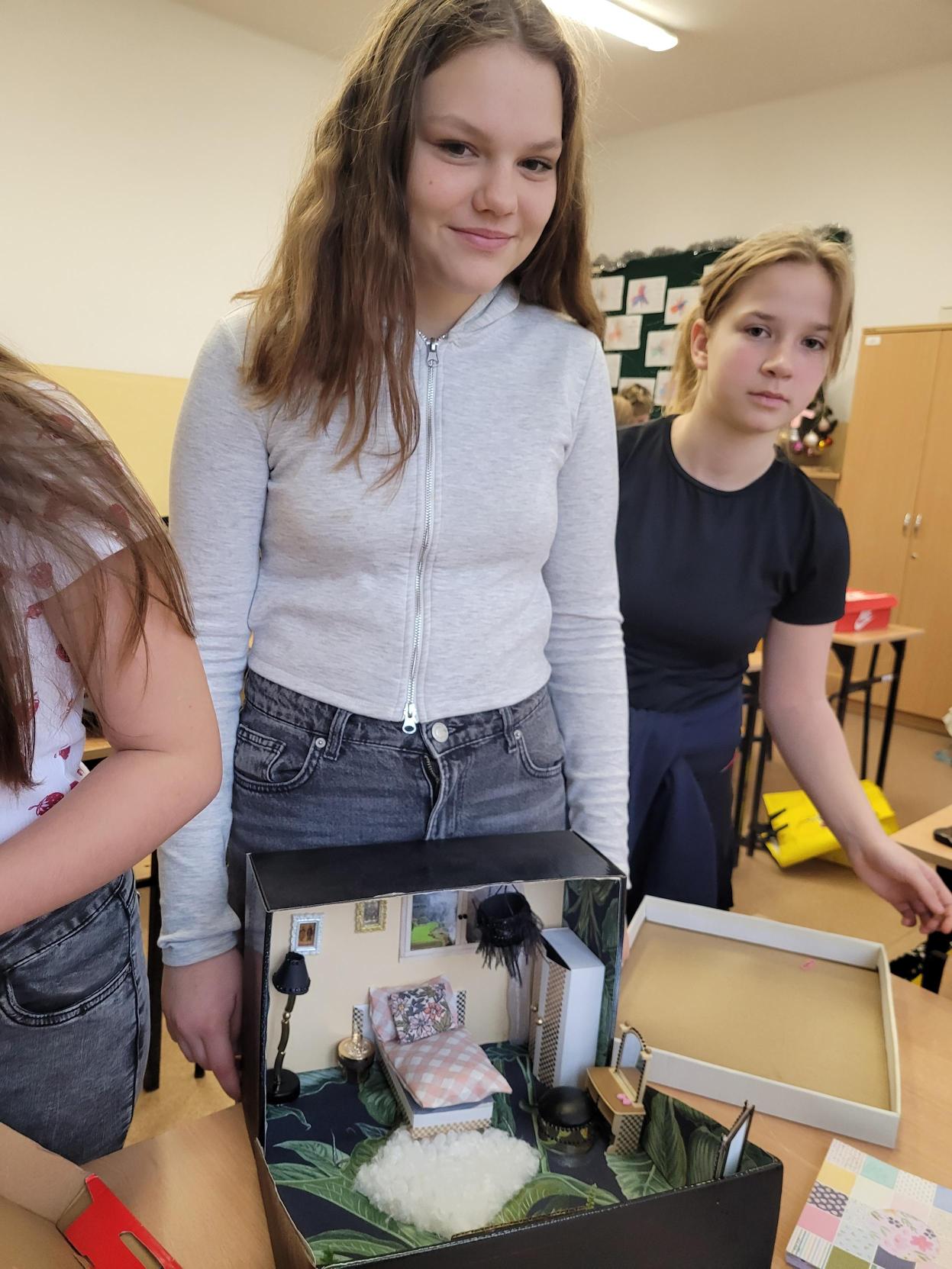 Podczas pracy uczniowie planowali układ wnętrza, projektowali meble i dbali o detale, takie jak dekoracje, kolorystyka czy funkcjonalność przestrzeni. Zajęcia pozwoliły rozwijać zdolności manualne, wyobraźnię przestrzenną oraz umiejętność samodzielnego rozwiązywania problemów. Efektem są oryginalne i starannie wykonane makiety, które pokazują, jak wiele pomysłów i zaangażowania mają nasi uczniowie.
