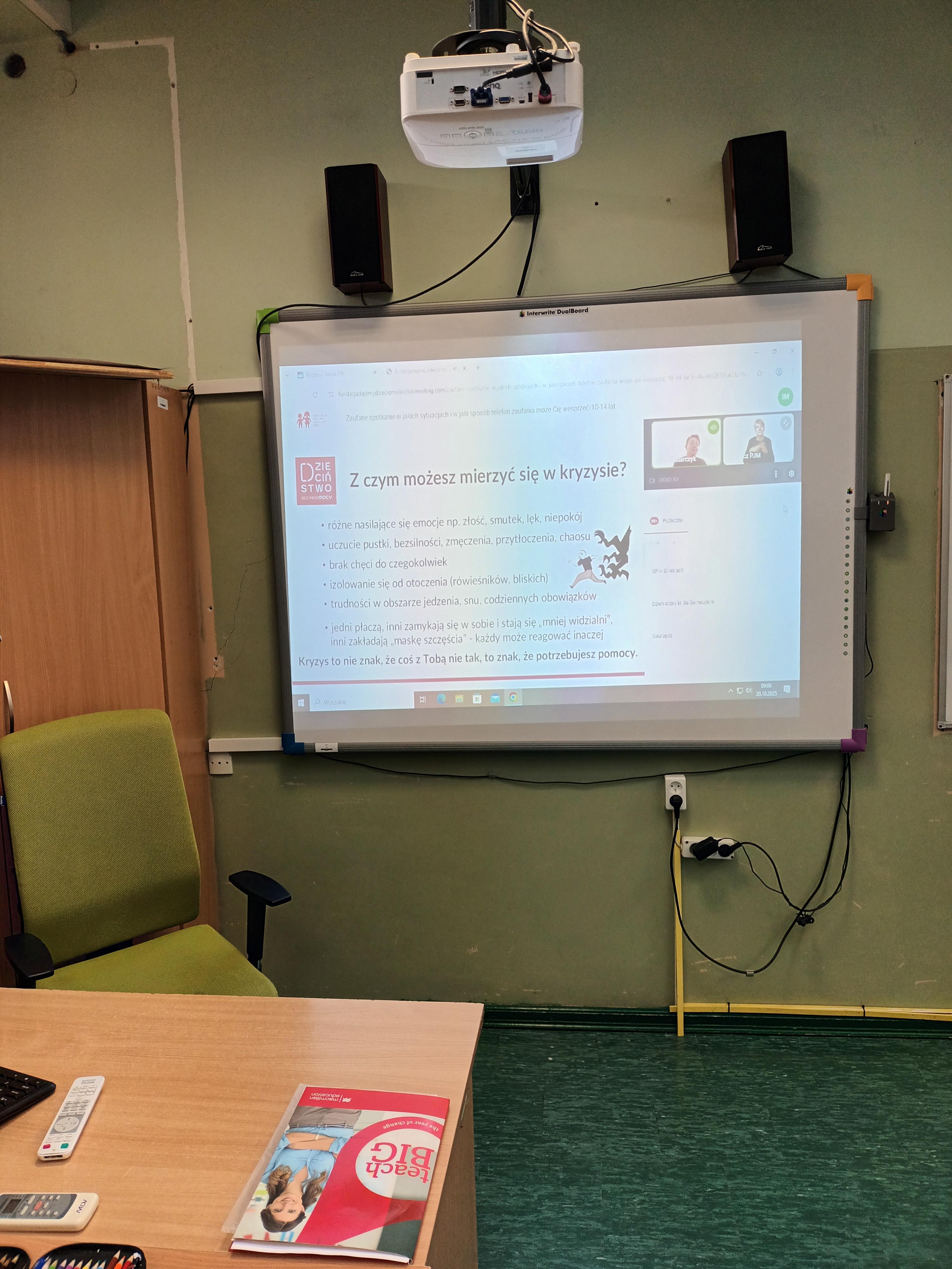 1. Zaufane spotkanie - w jakich sytuacjach i w jaki sposób telefon zaufania może cię wesprzeć? - kl. 8c, 20.10.2025 r. - p. I. Zalepa - Maciaszczyk + zdjęcia poniżej 2. Jak reagować na przemoc? Rozpoznaj, zareaguj, zatrzymaj. - kl. 8a , 5.11.2025 r., p. I. Zalepa - Maciaszczyk 3. Jak reagować na przemoc? Rozpoznaj, zareaguj, zatrzymaj. - kl. 4b. 27.10.2025 r., p. B. Głaz. 4. Przemoc rówieśnicza on - line i ofline - kl. 6c, 17.11.2025 r., p. K. Kolasa. 5. 19.11.2025 r. - podświetlenie budynków na czerwono